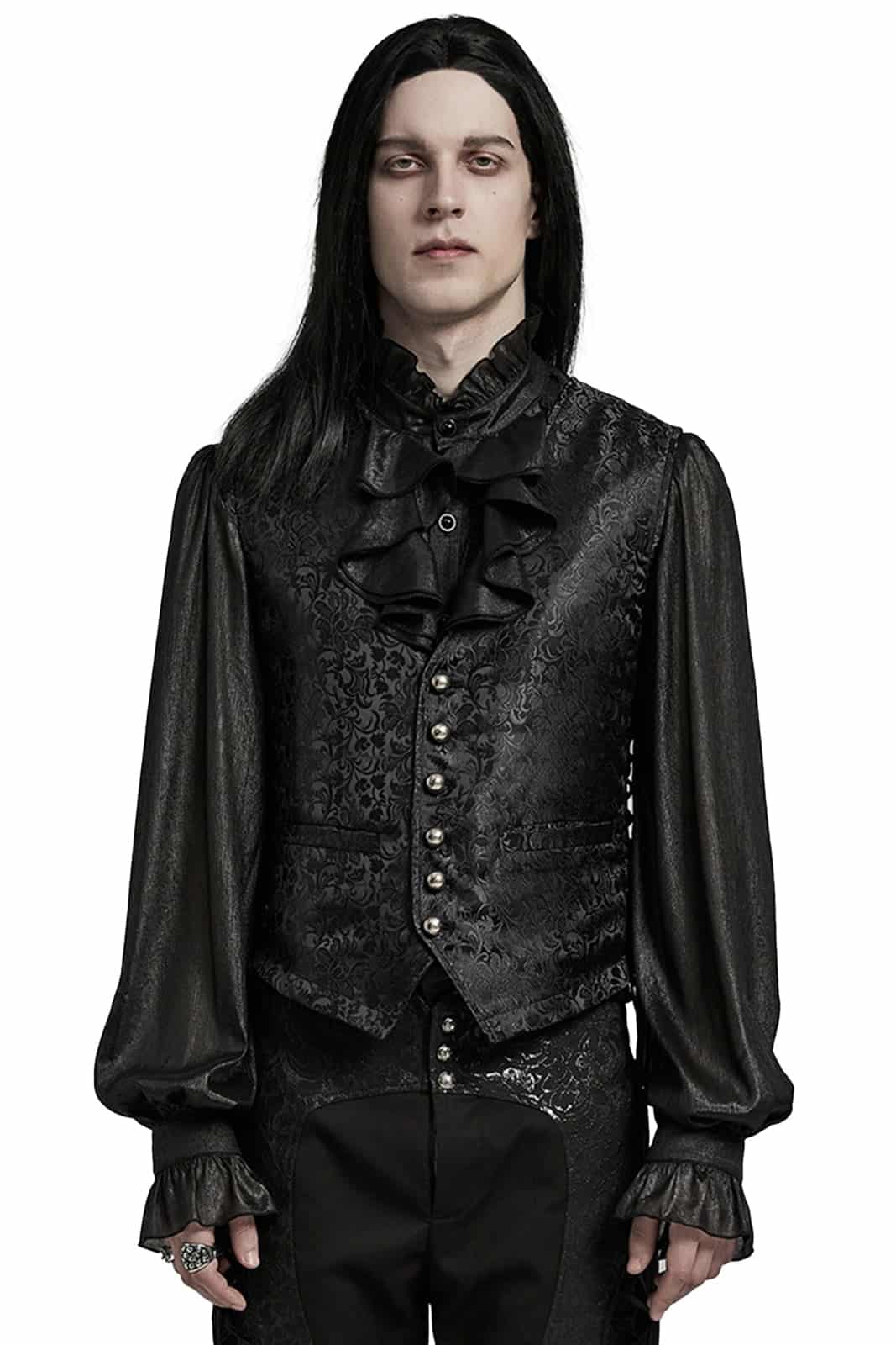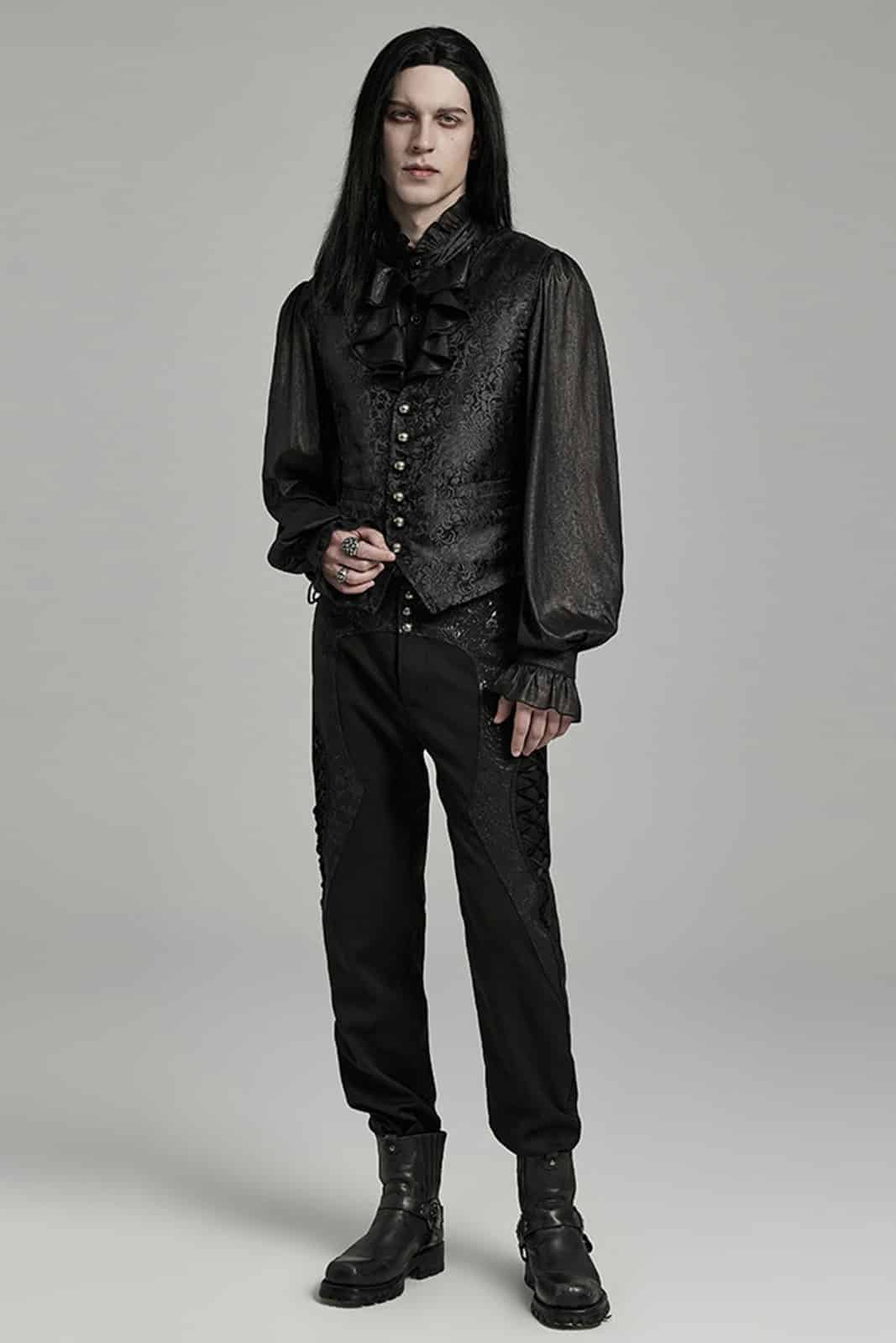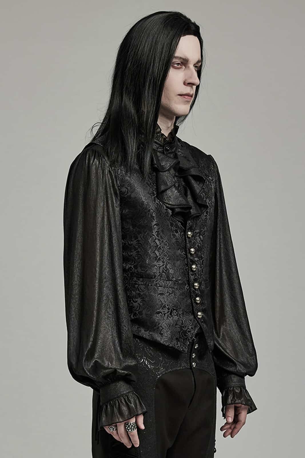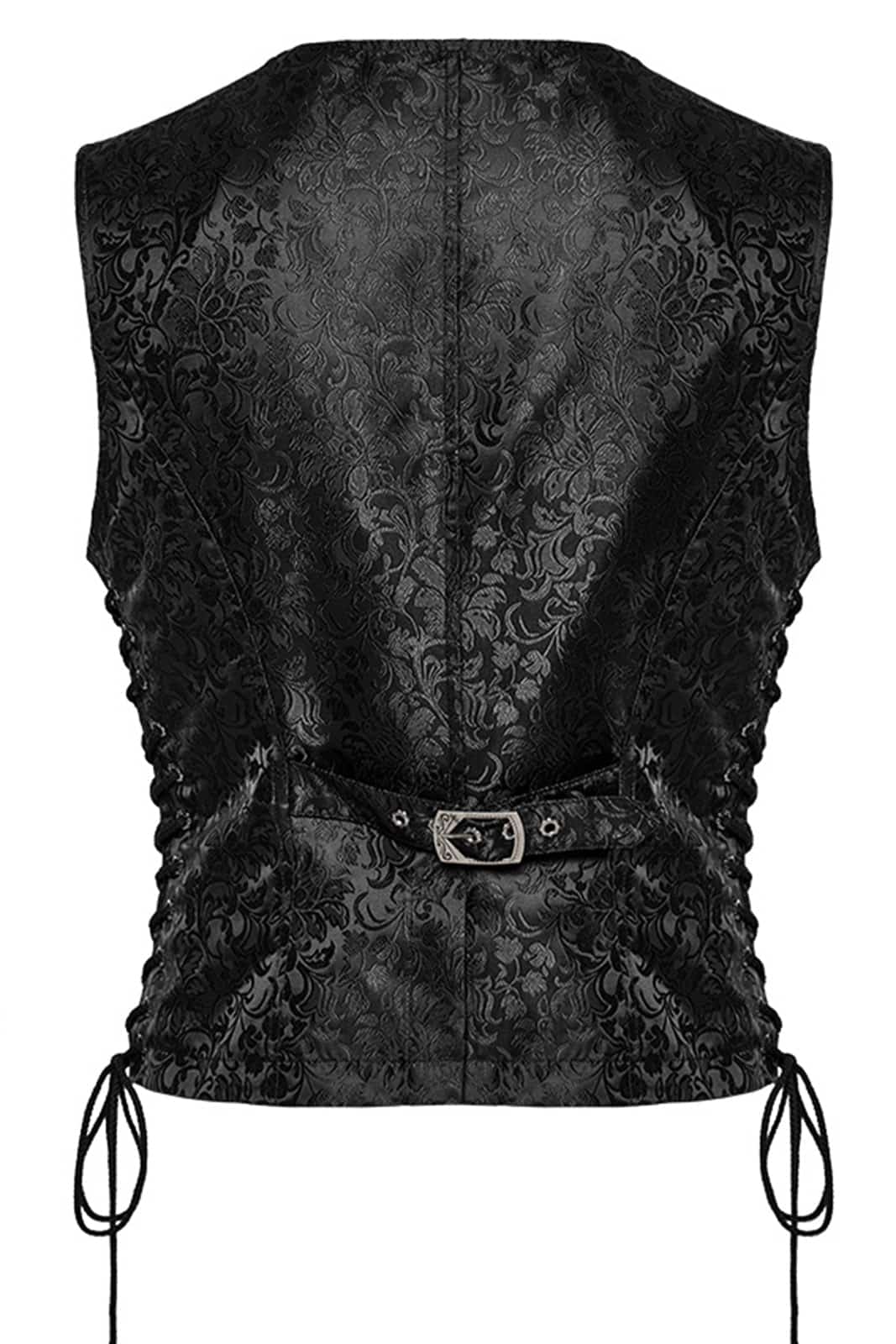 Gothicweste im viktorianischen Stil in klassischem, tailliertem Schnitt, gefertigt aus schwarzem, verziertem Satin-Jacquard-Stoff und mit V-Ausschnitt ohne Revers. Mit Schnürung an den Seiten für eine verstellbare Passform. Die antikisierten Metallknöpfe verliehen einen Vintage- und eleganten Touch.