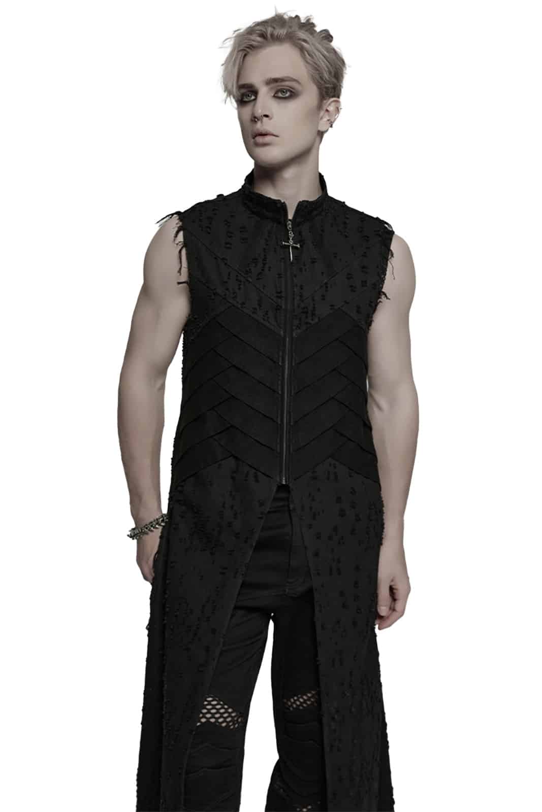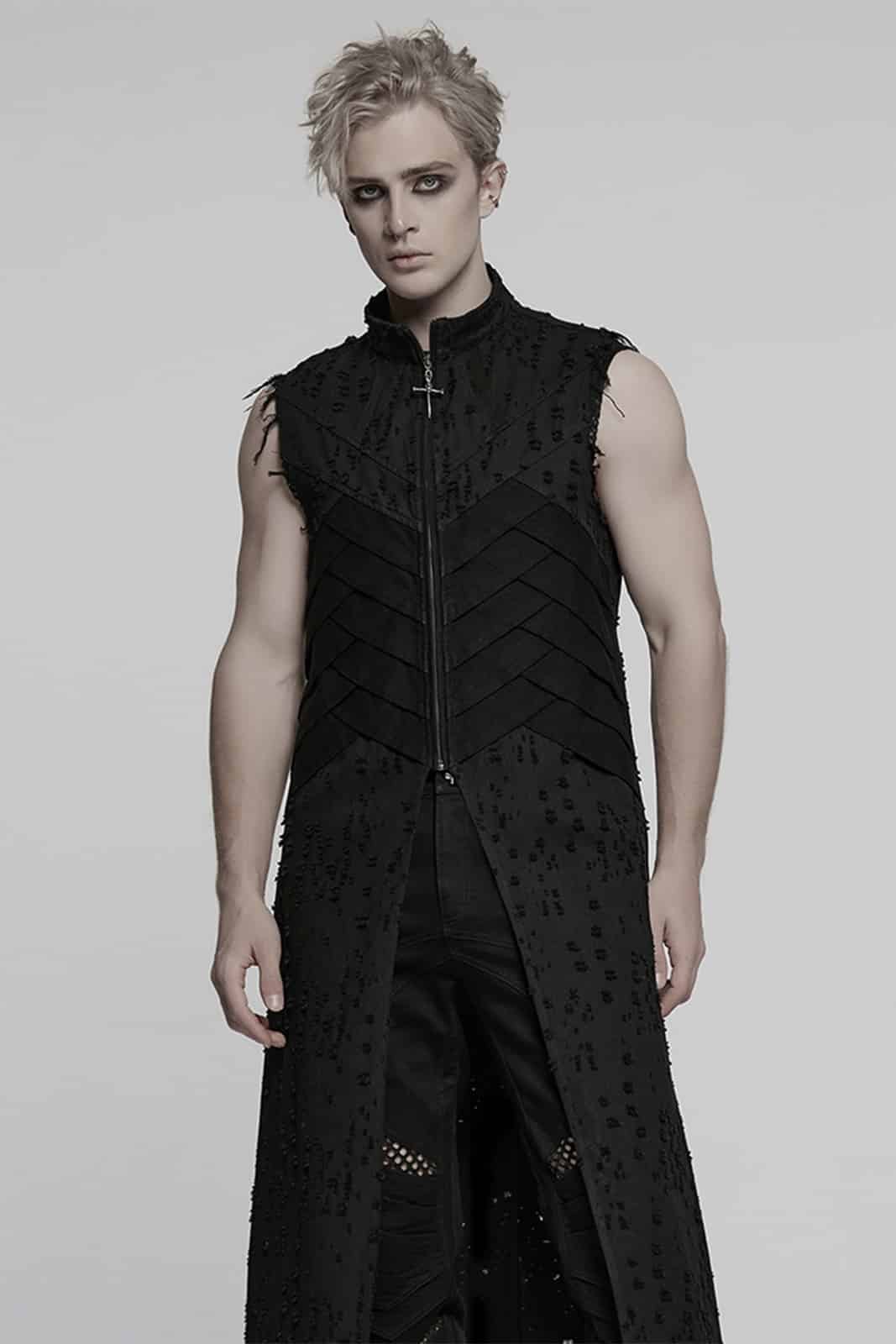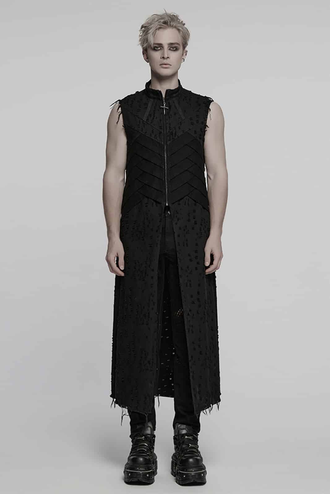 Lange, ärmellose Herrenweste im Dark-Punk-Stil mit markantem Strukturdesign und robuster Ausstrahlung. Der durchgehende Reißverschluss und die abgestuften Paneele an Vorder- und Rückseite verleihen dem Look eine kraftvolle, futuristische Note – perfekt für dystopische oder alternative Outfits.