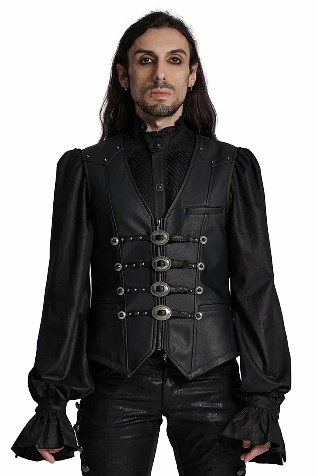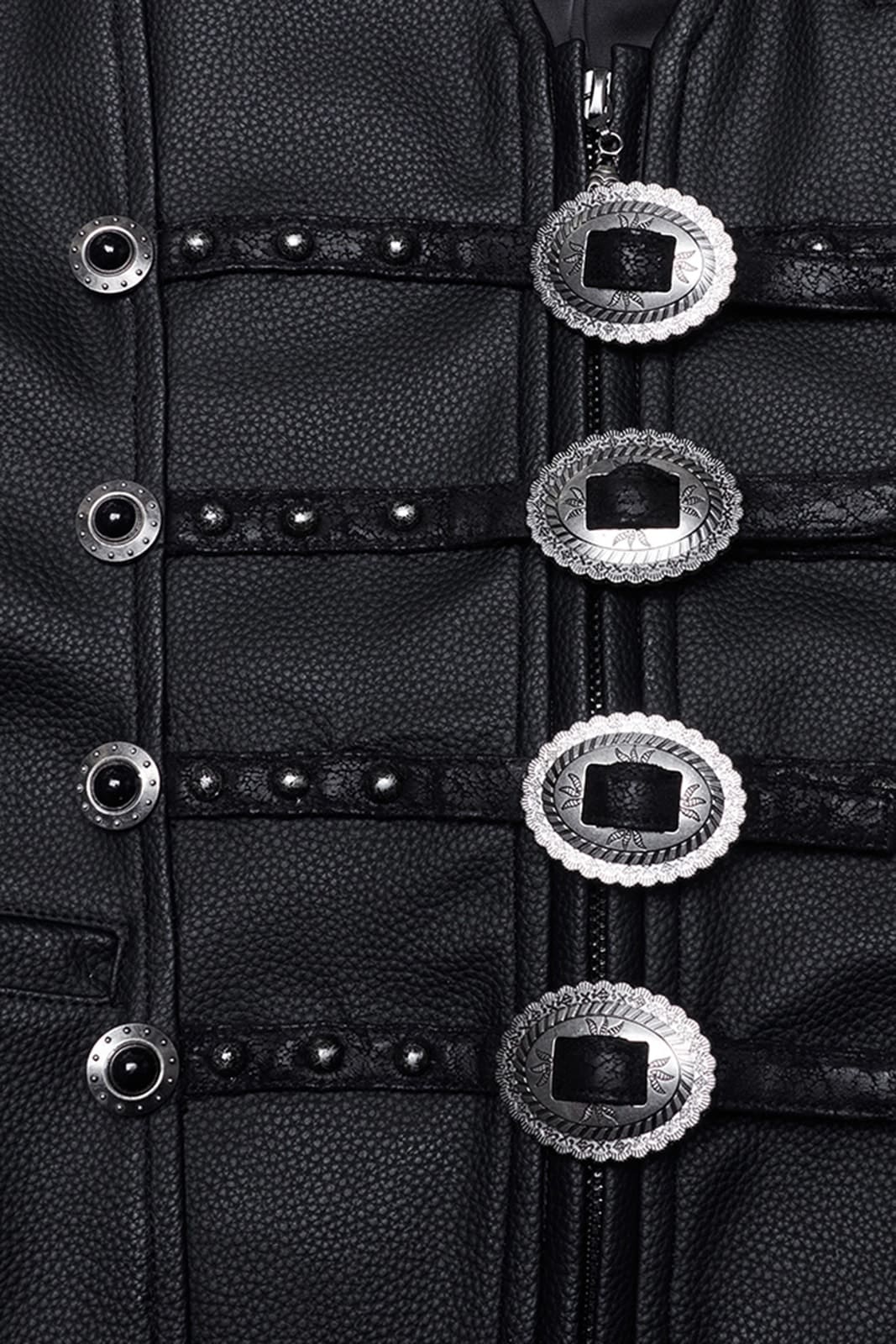 Präzis geschnitten und ein echter Hingucker: Die Gothic Gunslinger Weste vereint klare Schnitte mit einer markanten Note. Diese schmal geschnittene Weste holt die Weste aus den verstaubten Geschichtsbüchern zurück in die Schatten und präsentiert sie mit strukturierter Rauheit und metallischem Biss.