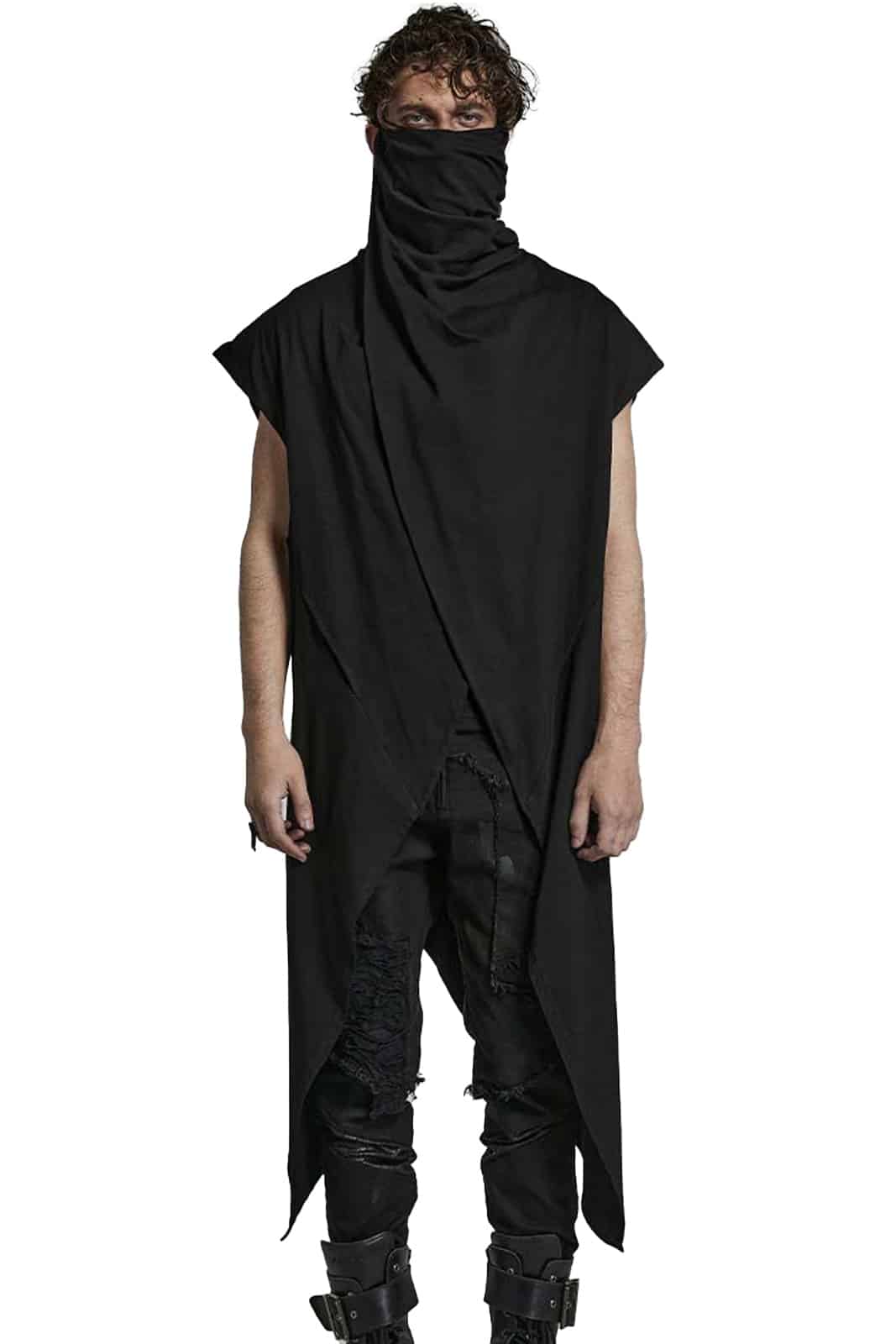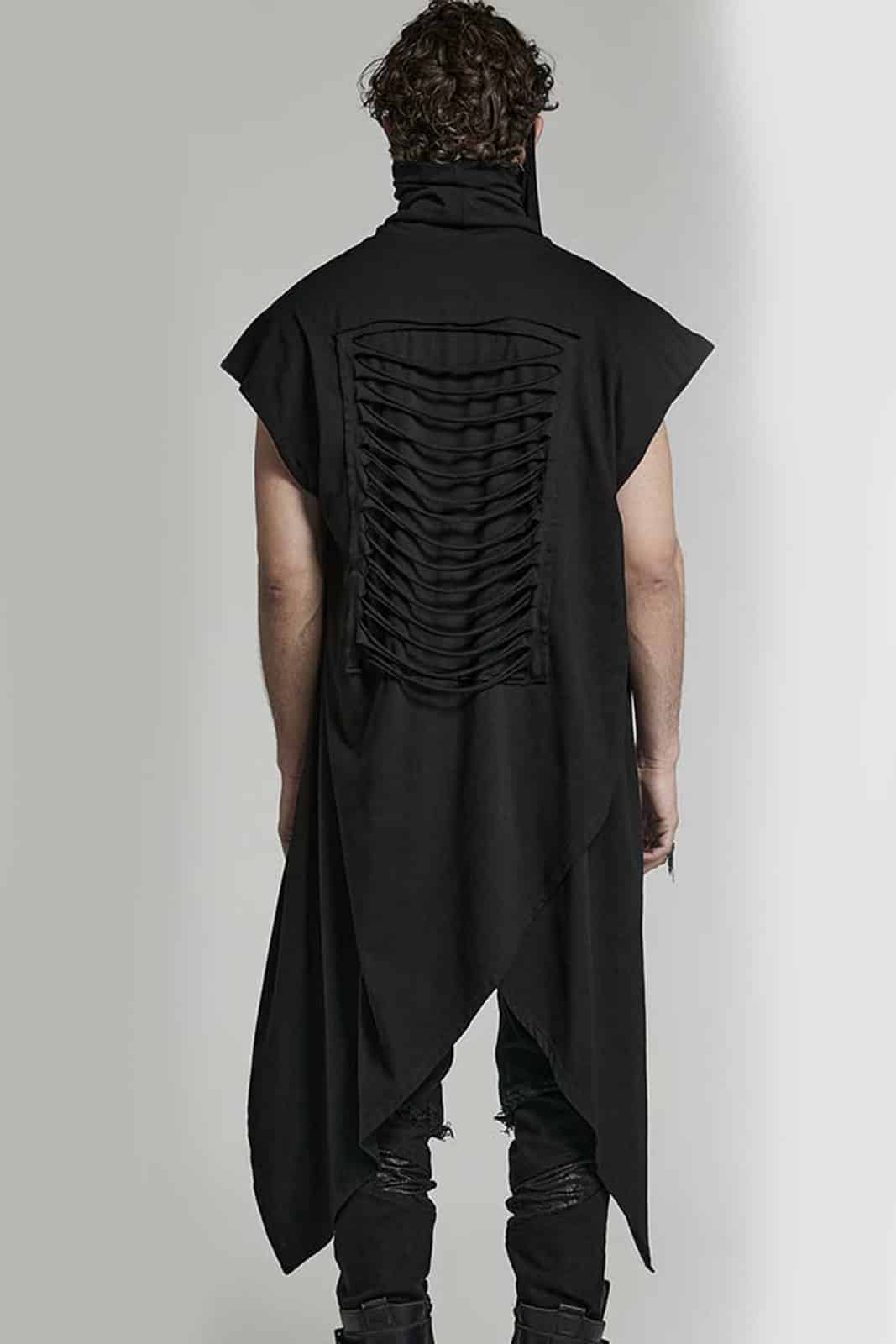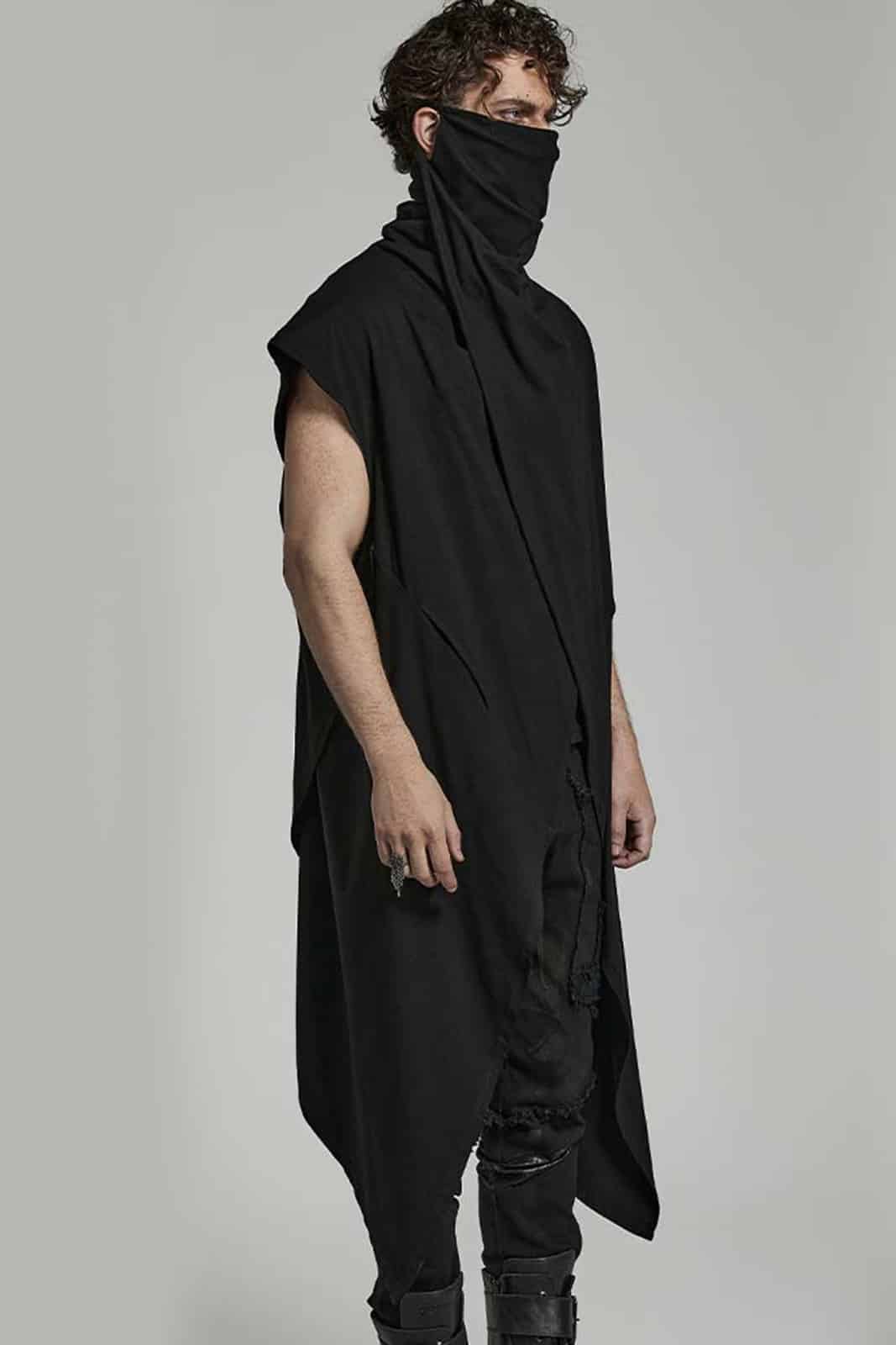 Weste aus postapokalyptischem schwarzen Jersey mit Maske und lockerer Passform. Die lange Strickjacke kann um den Körper gewickelt werden. Ausgestattet mit Distressed-Rückendetail und asymmetrischem Saum.