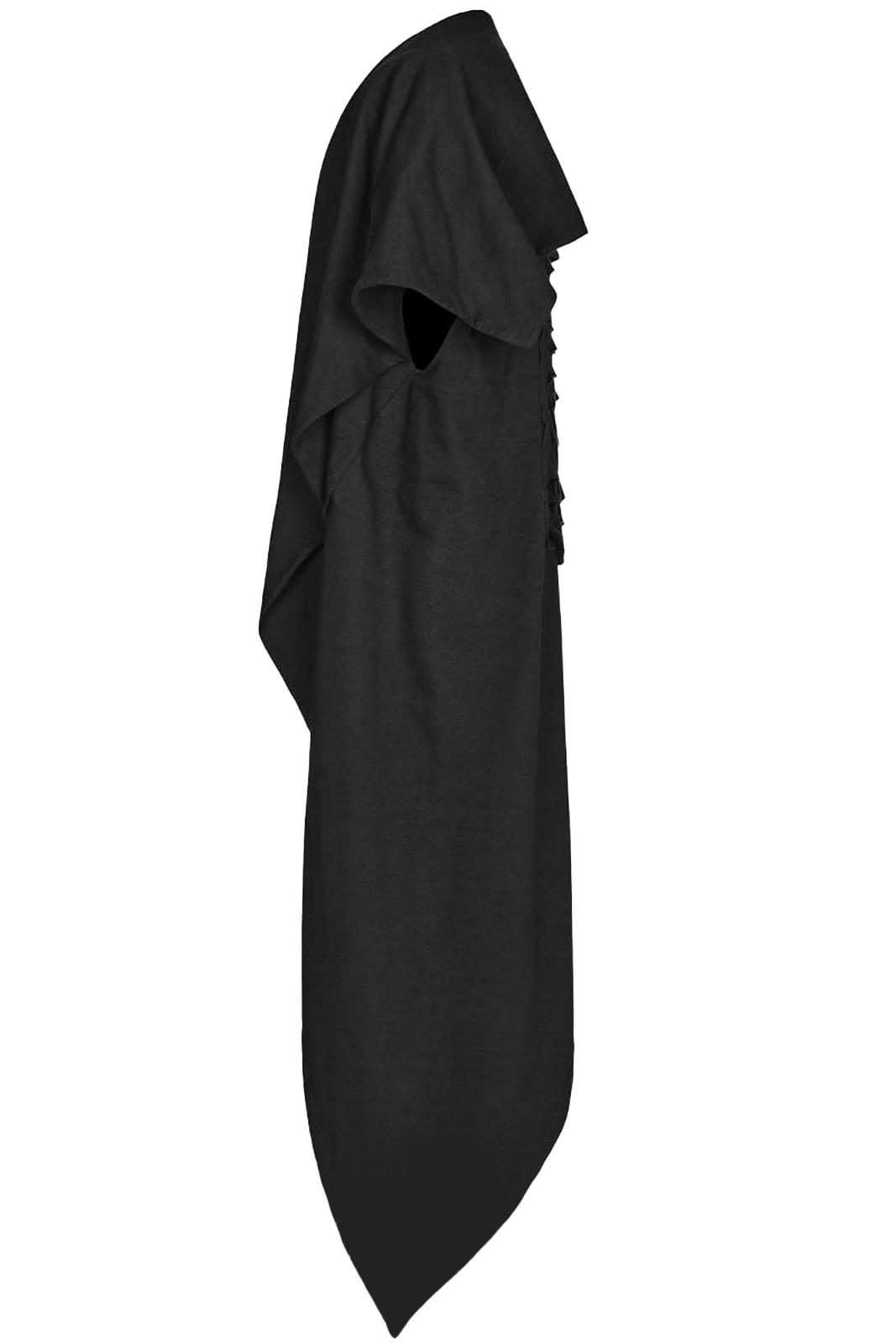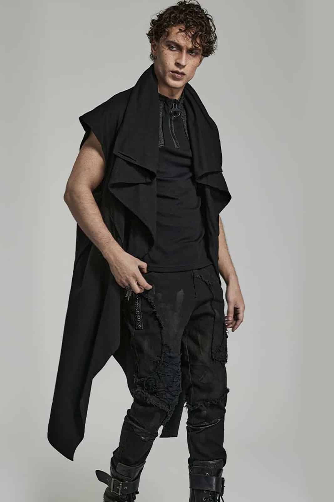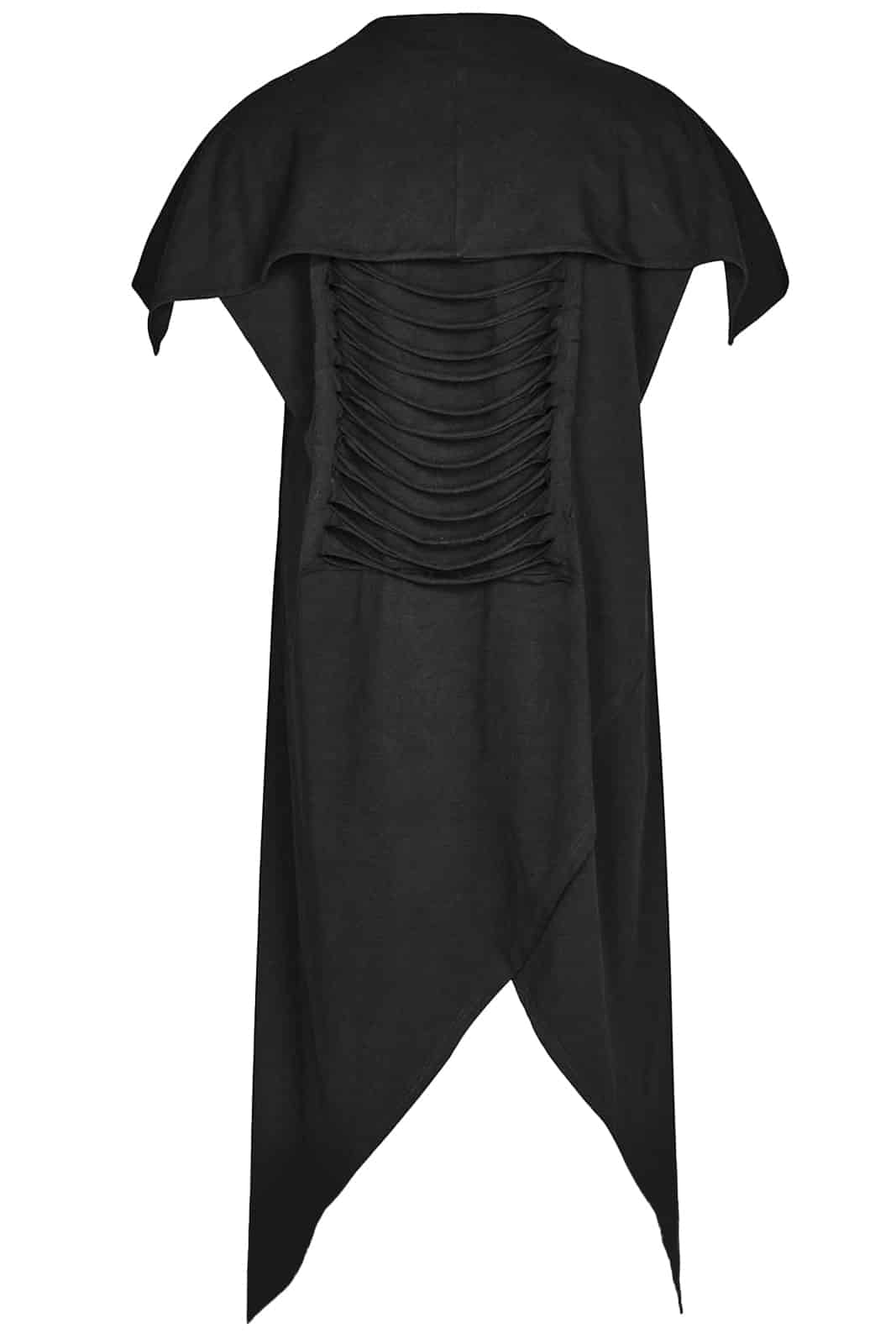 Weste aus postapokalyptischem schwarzen Jersey mit Maske und lockerer Passform. Die lange Strickjacke kann um den Körper gewickelt werden. Ausgestattet mit Distressed-Rückendetail und asymmetrischem Saum.
