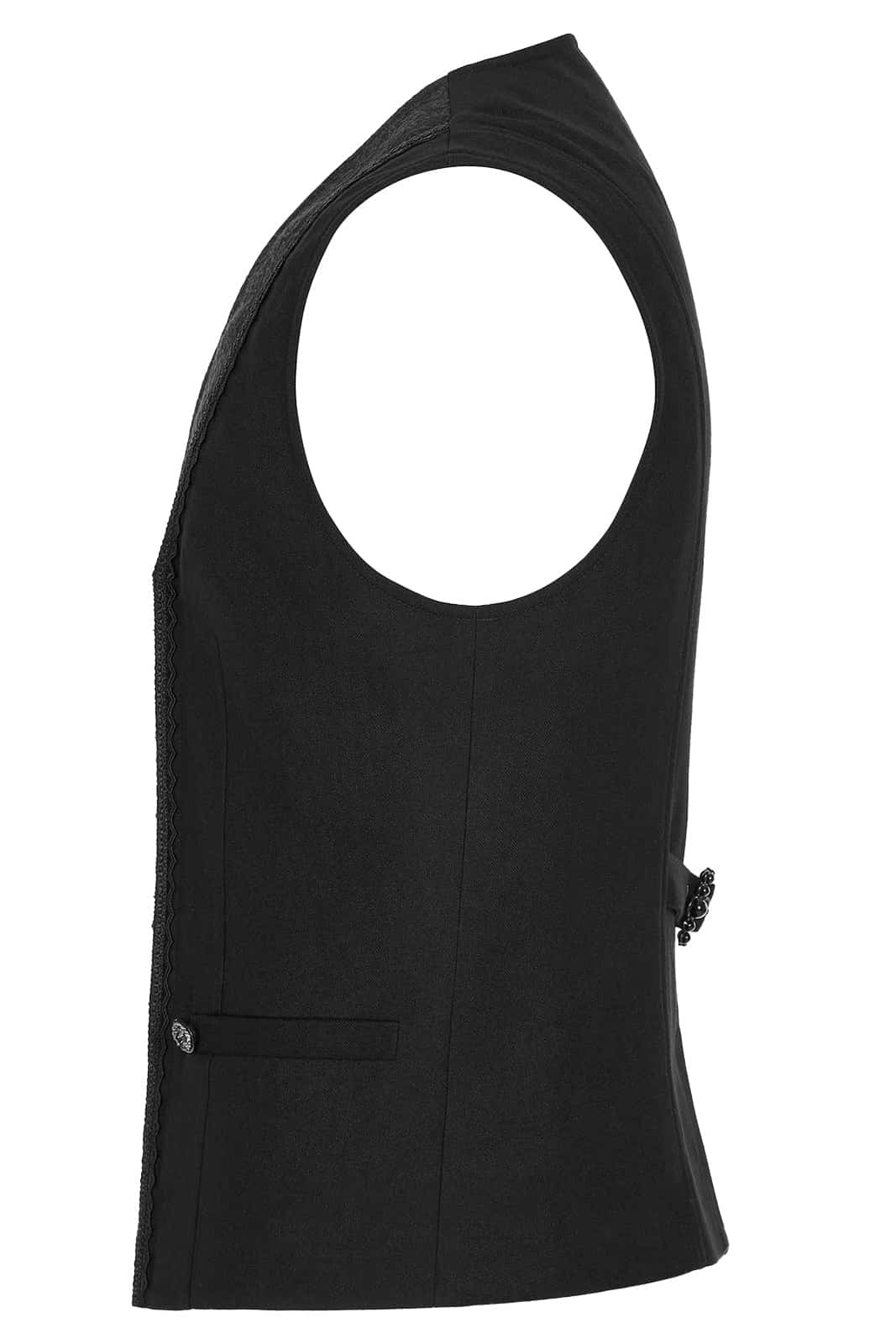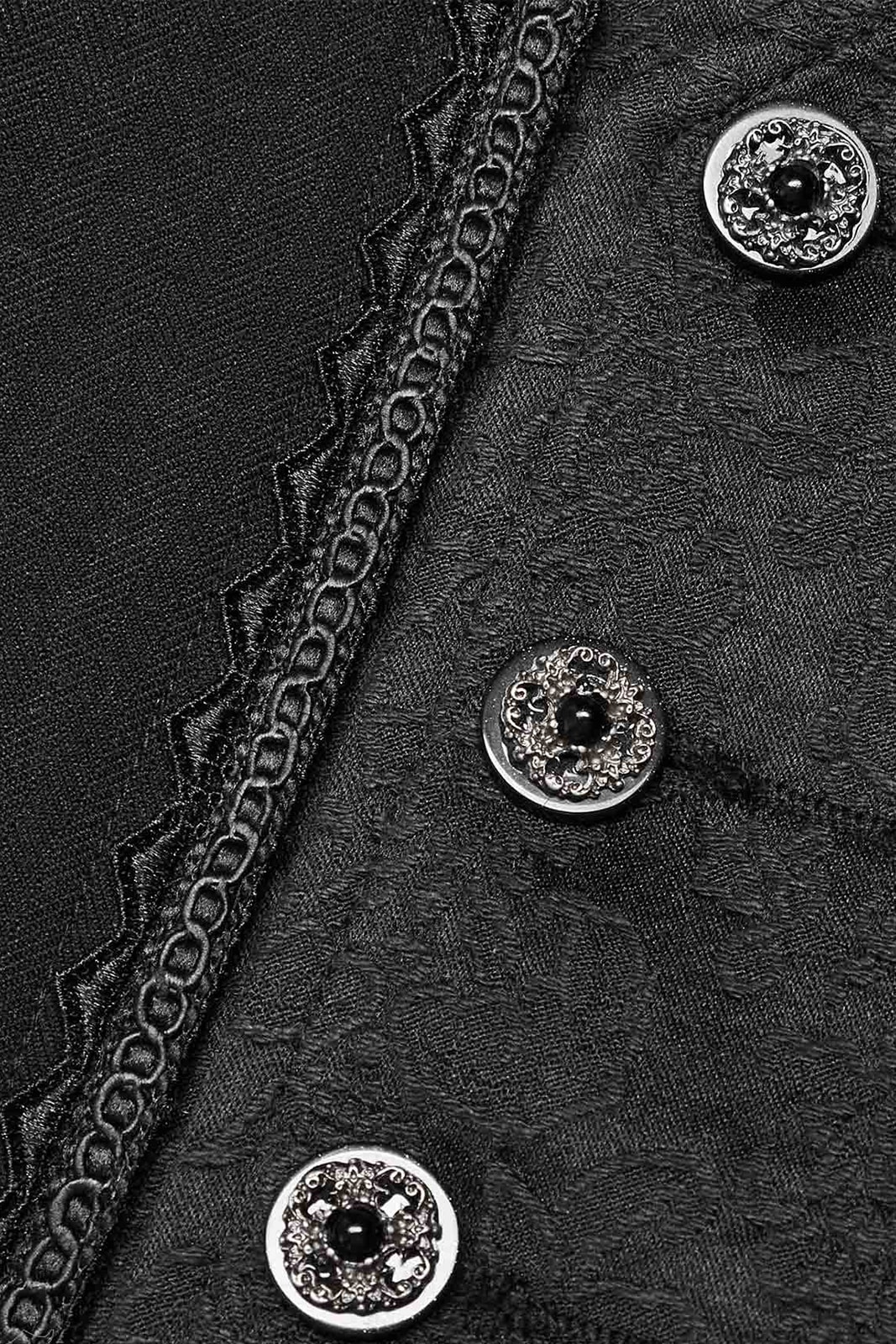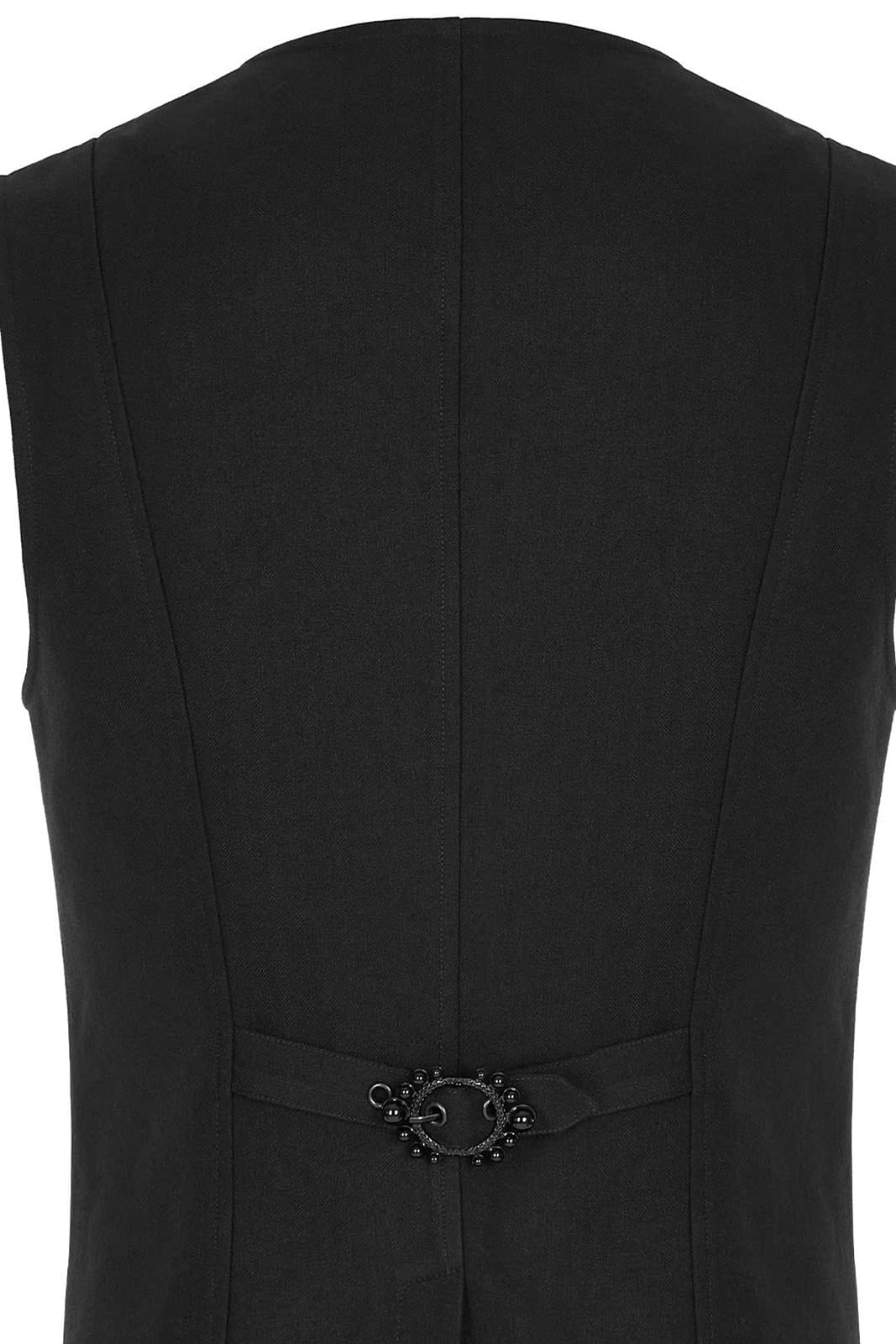 Schwarze Herrenweste im viktorianischen Gothic-Stil aus einfarbigem schwarzer Webstoff mit Akzenten aus schwarzem Brokat. Besetzt mit aufwändig gestalteten Knöpfen und Schnallen auf der Rückseite. Mit V-ausschnitt und tailliertem Schnitt.