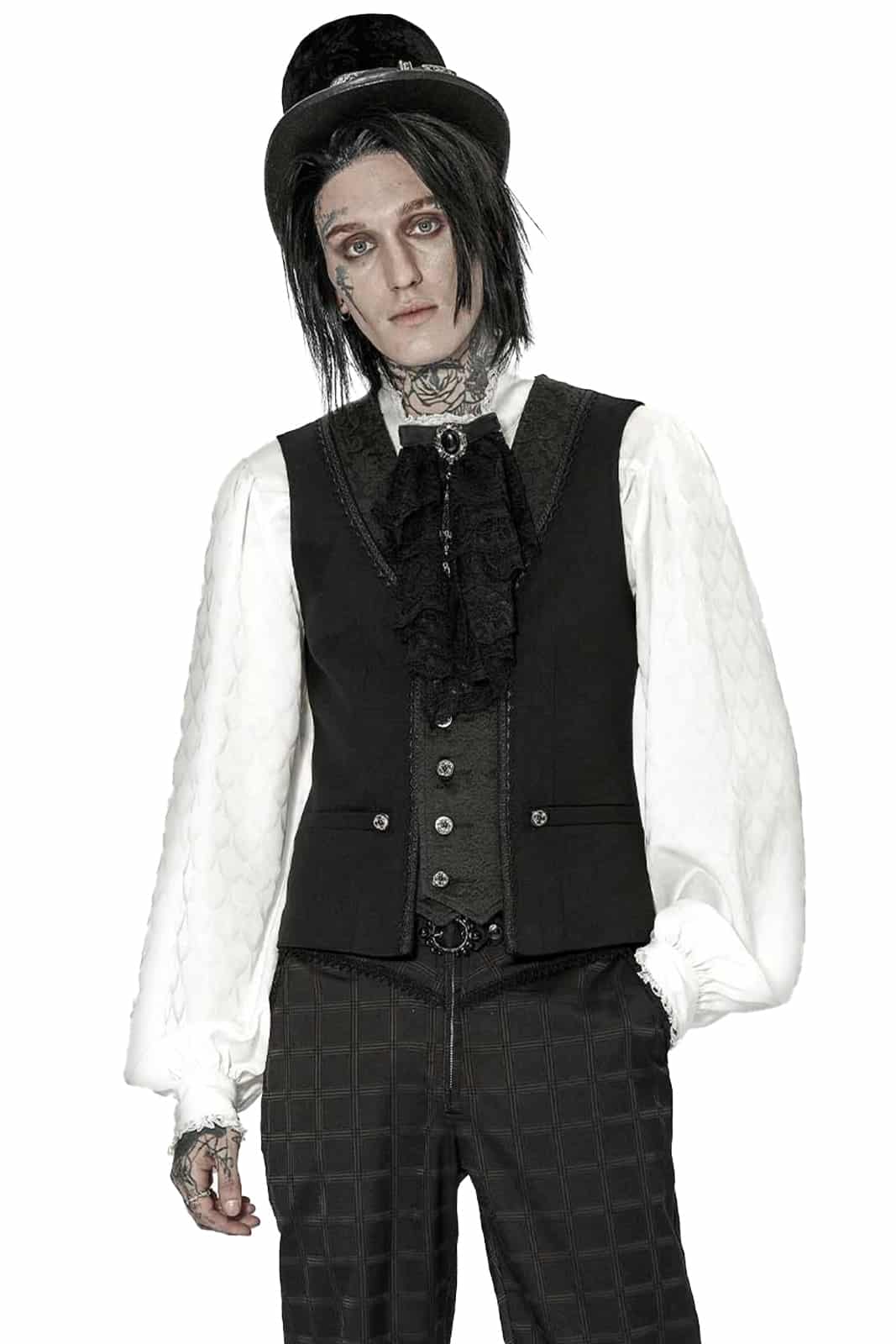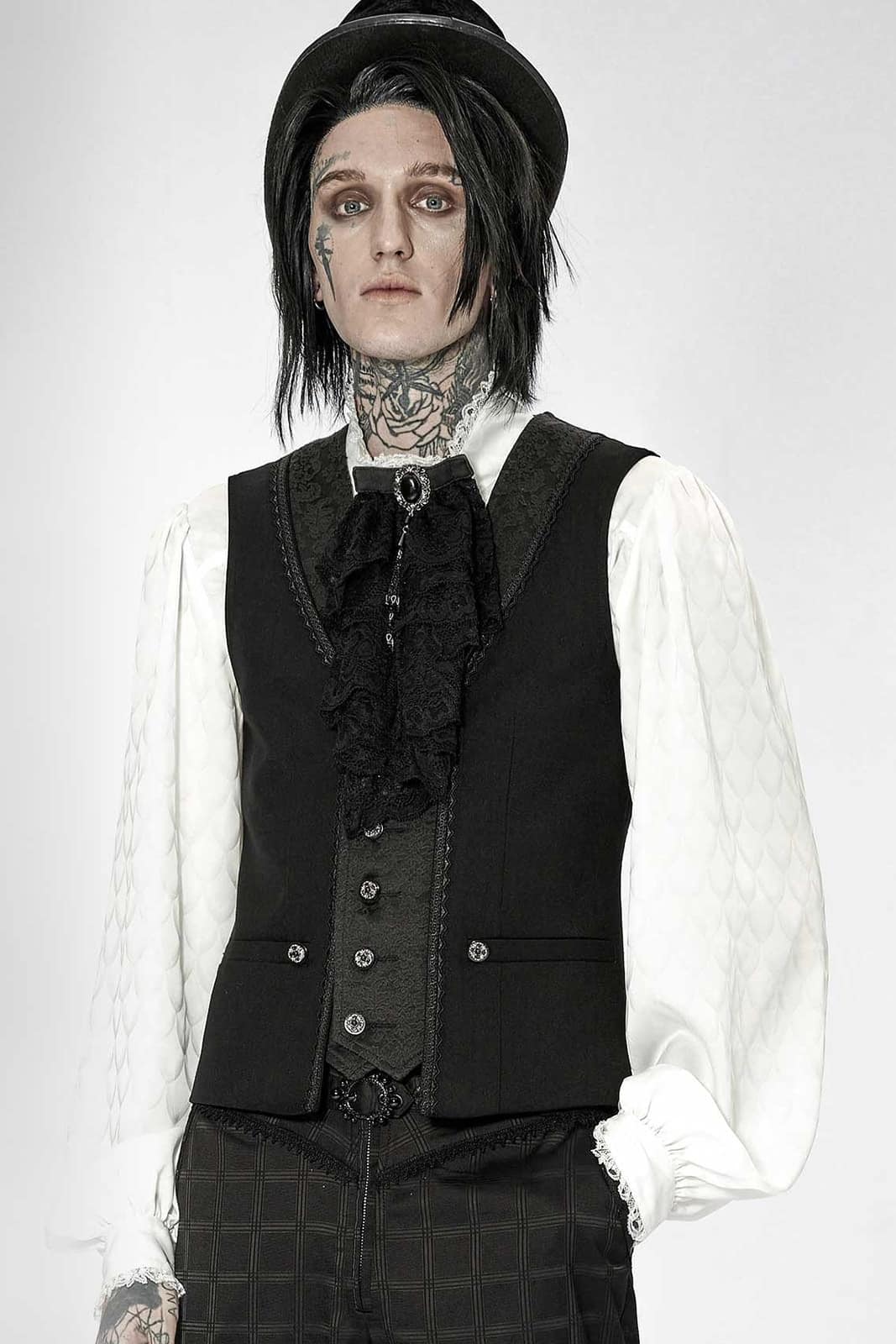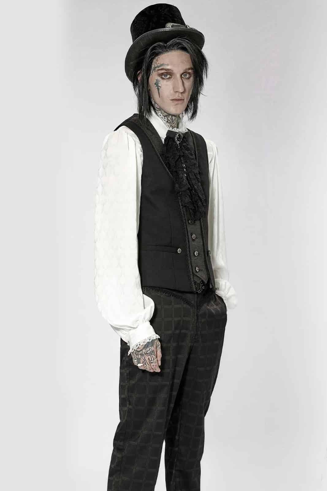 Schwarze Herrenweste im viktorianischen Gothic-Stil aus einfarbigem schwarzer Webstoff mit Akzenten aus schwarzem Brokat. Besetzt mit aufwändig gestalteten Knöpfen und Schnallen auf der Rückseite. Mit V-ausschnitt und tailliertem Schnitt.