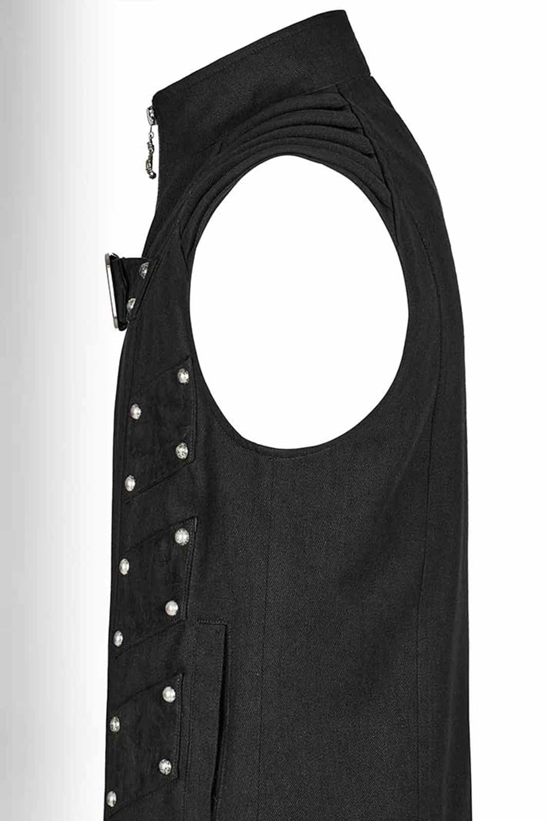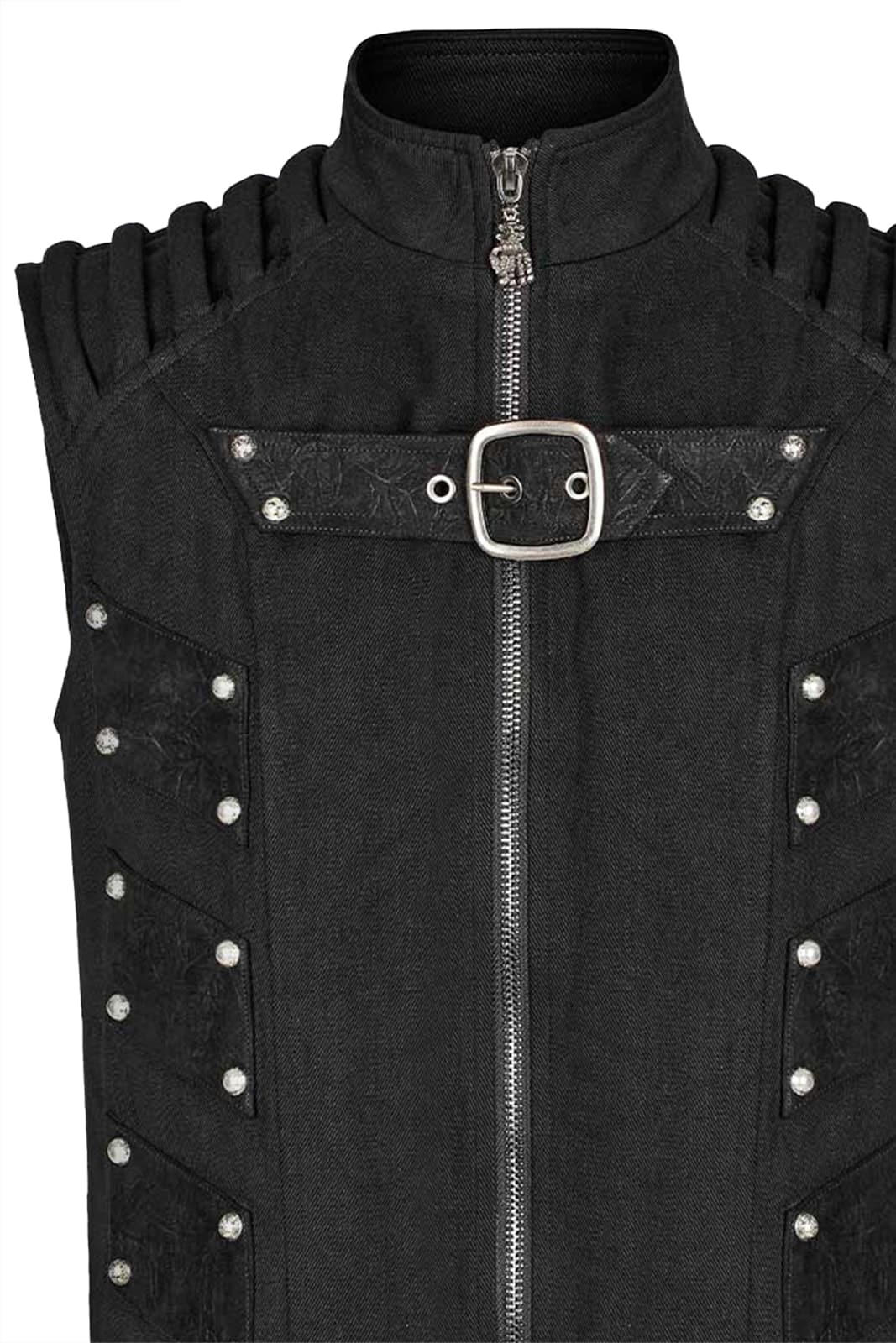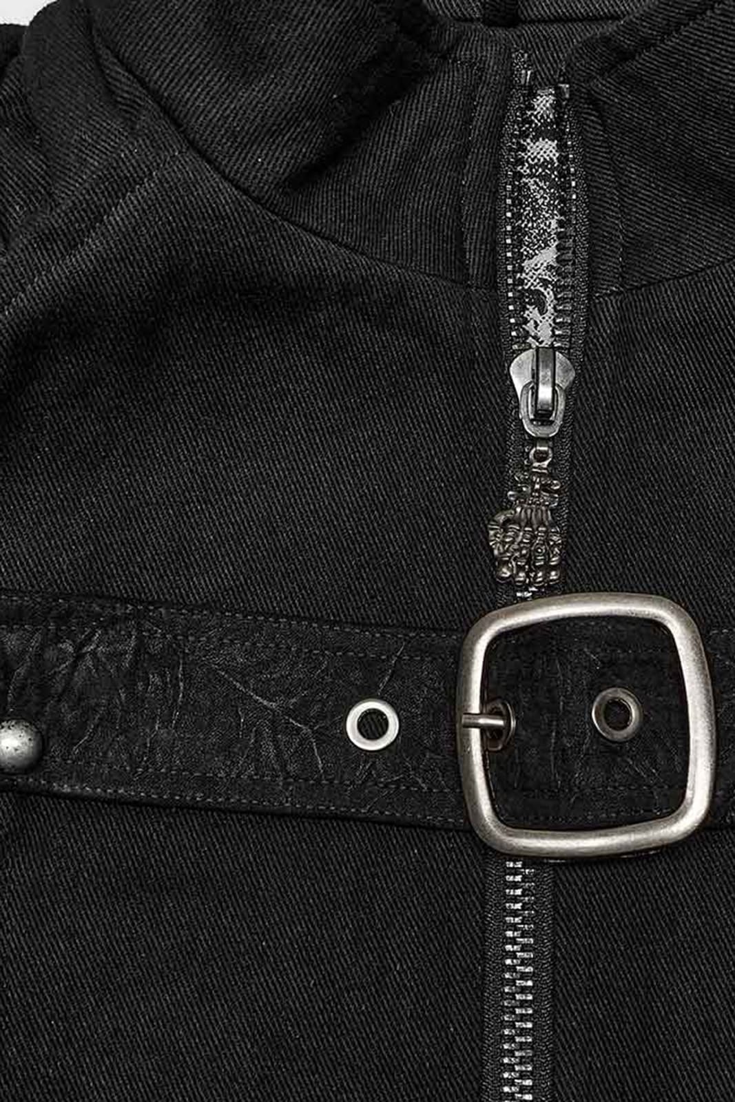 Taillierte Weste mit Reißverschluss, Stehkragen und gepolsterten Schulterdetails. Mit silbernen Nieten sind mehrere Patches aus Kunstwildleder befestigt. Ein Schnallenriemen auf der Brust und ein Zipper aus einer Skeletthand runden die Optik ab.