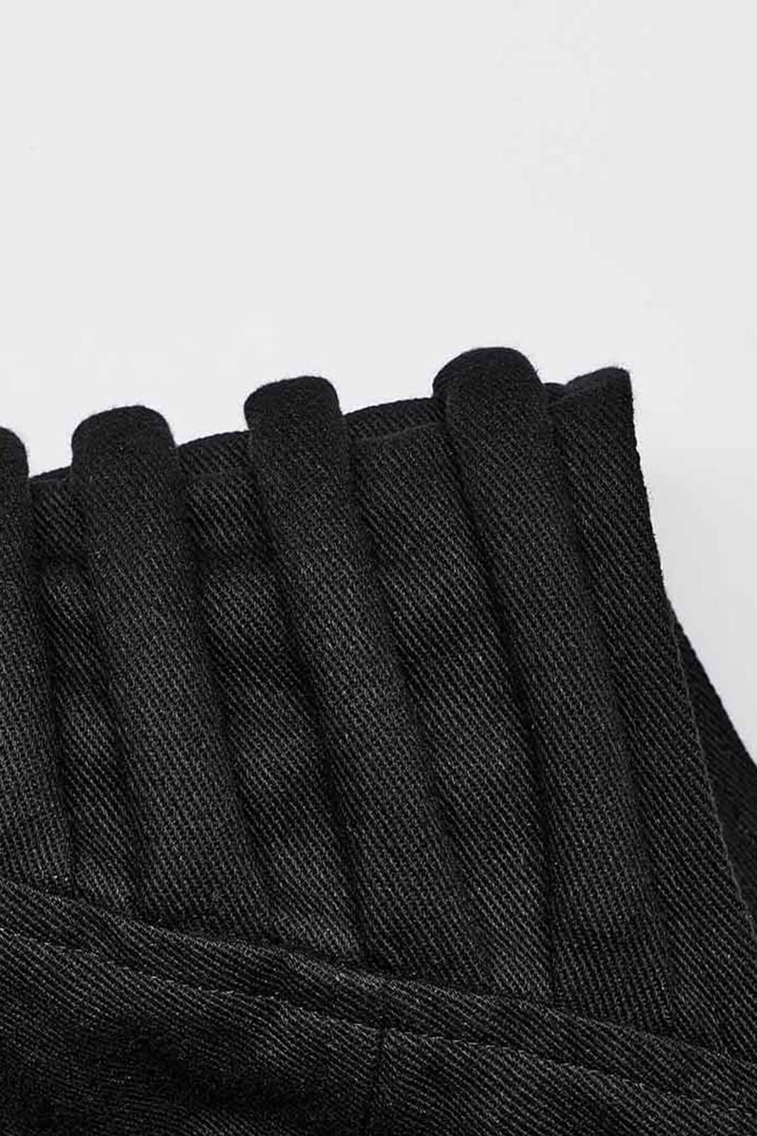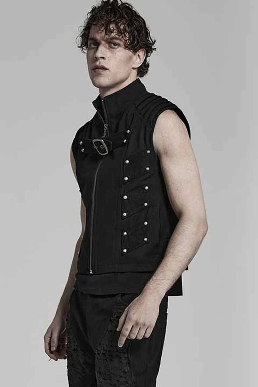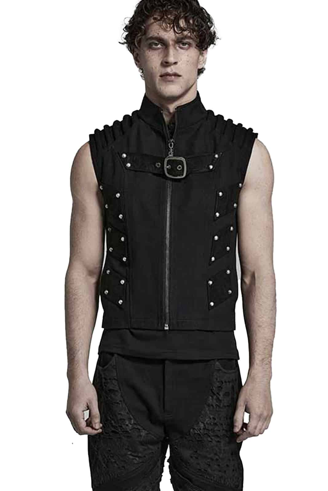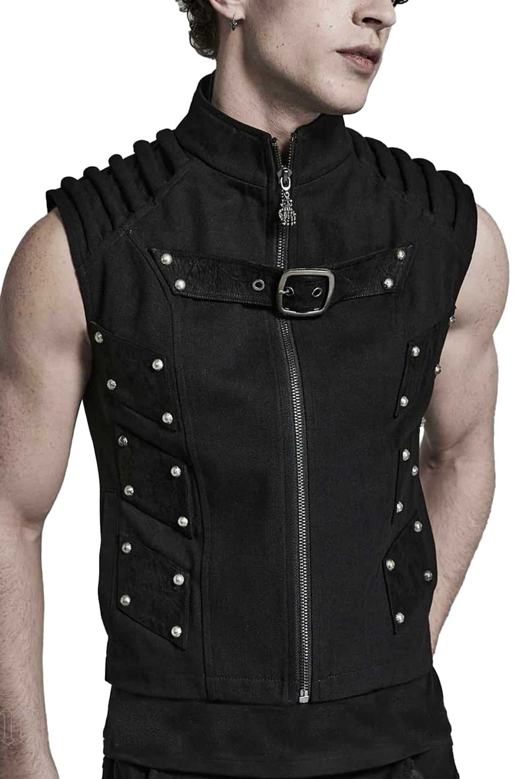 Taillierte Weste mit Reißverschluss, Stehkragen und gepolsterten Schulterdetails. Mit silbernen Nieten sind mehrere Patches aus Kunstwildleder befestigt. Ein Schnallenriemen auf der Brust und ein Zipper aus einer Skeletthand runden die Optik ab.