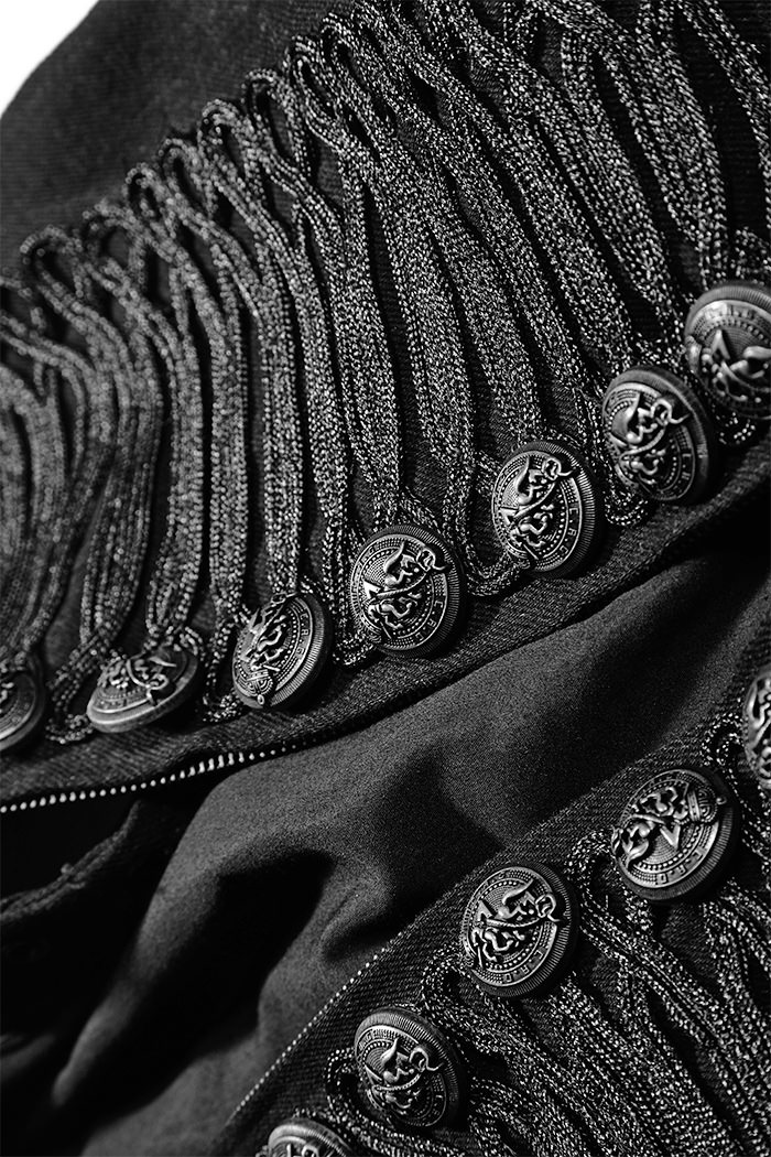 Herrenweste im Steampunk-Style aus schwerem Twill mit Frontreißverschluß, Stehkragen und Kunstlederbesatz an den Schultern. Verziert mit messingfarbenen Motivknöpfen, Ösen und Bordüren. Ausgestattet mit zwei Reißverschlußtaschen.