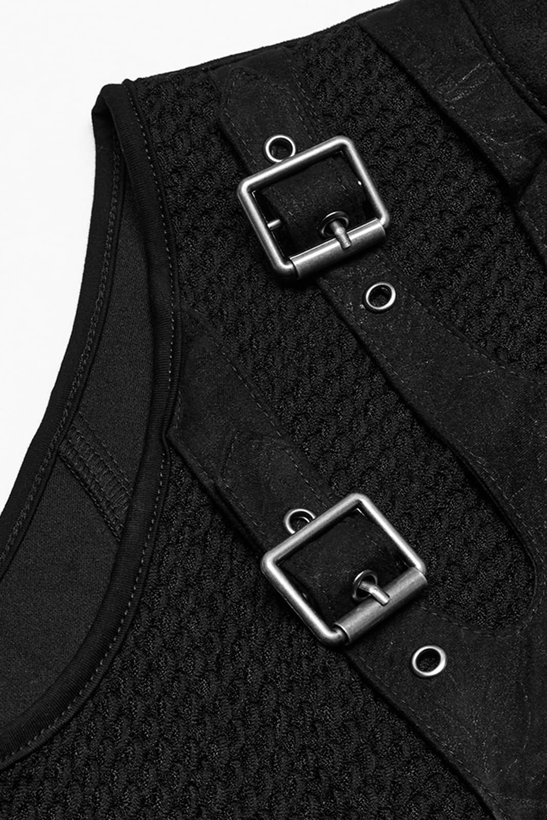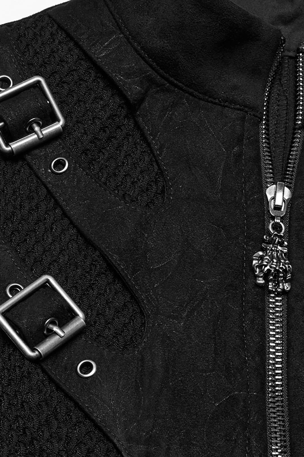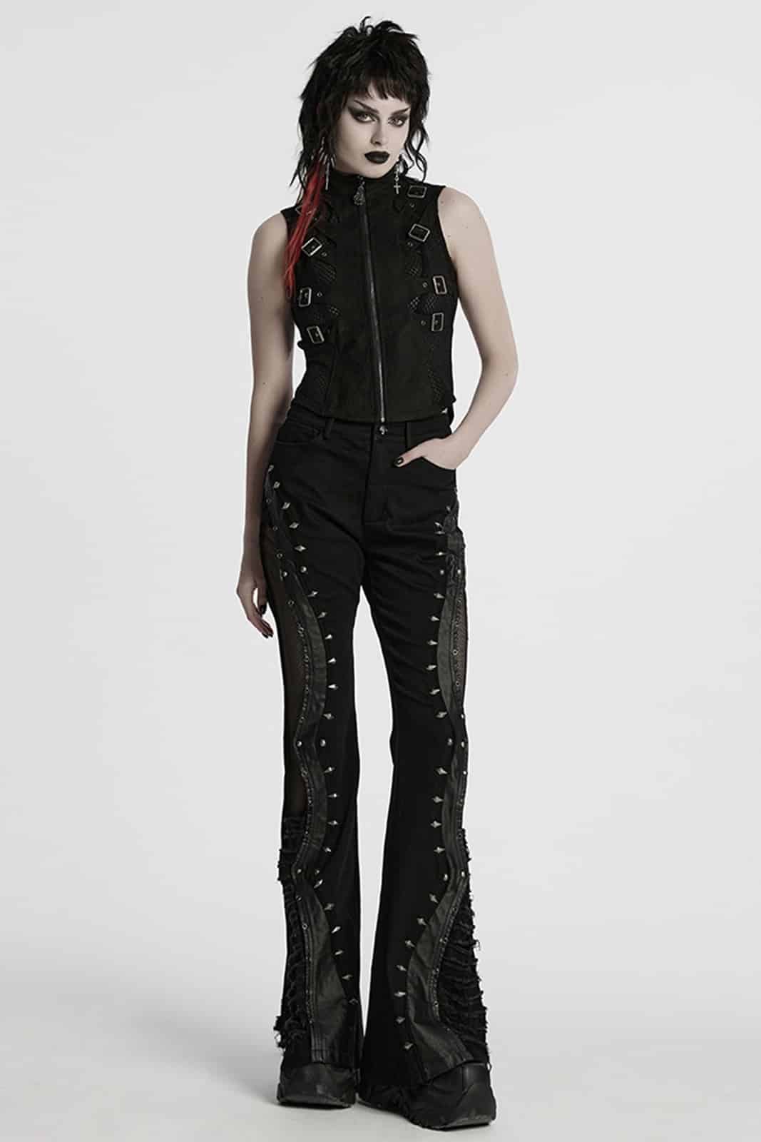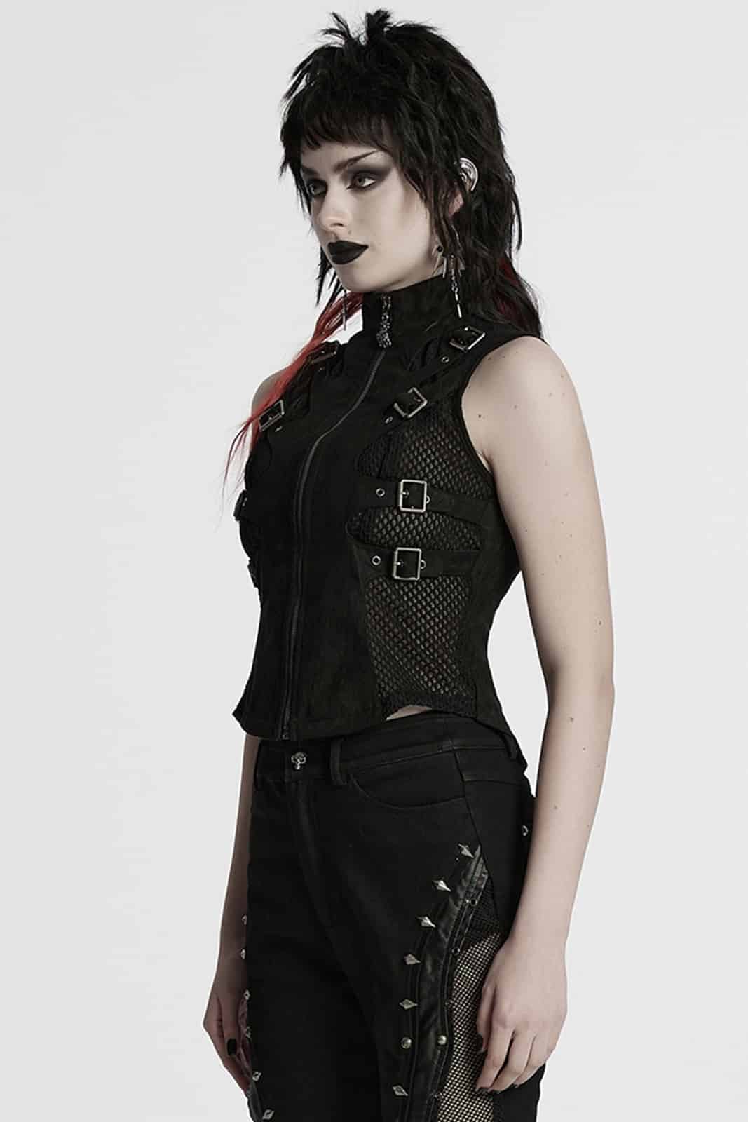 Diese taillierte Damenweste kombiniert dunkle Eleganz mit einem rebellischen Industrial-Charme. Das Spiel aus unterschiedlichen Materialien und markanten Details macht sie zu einem echten Statement-Piece.