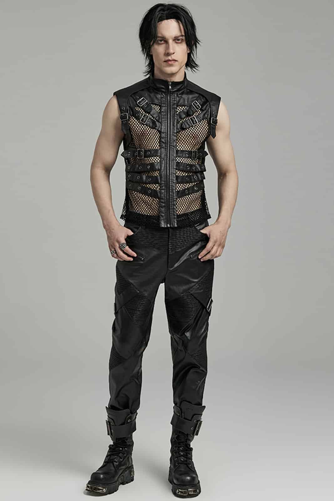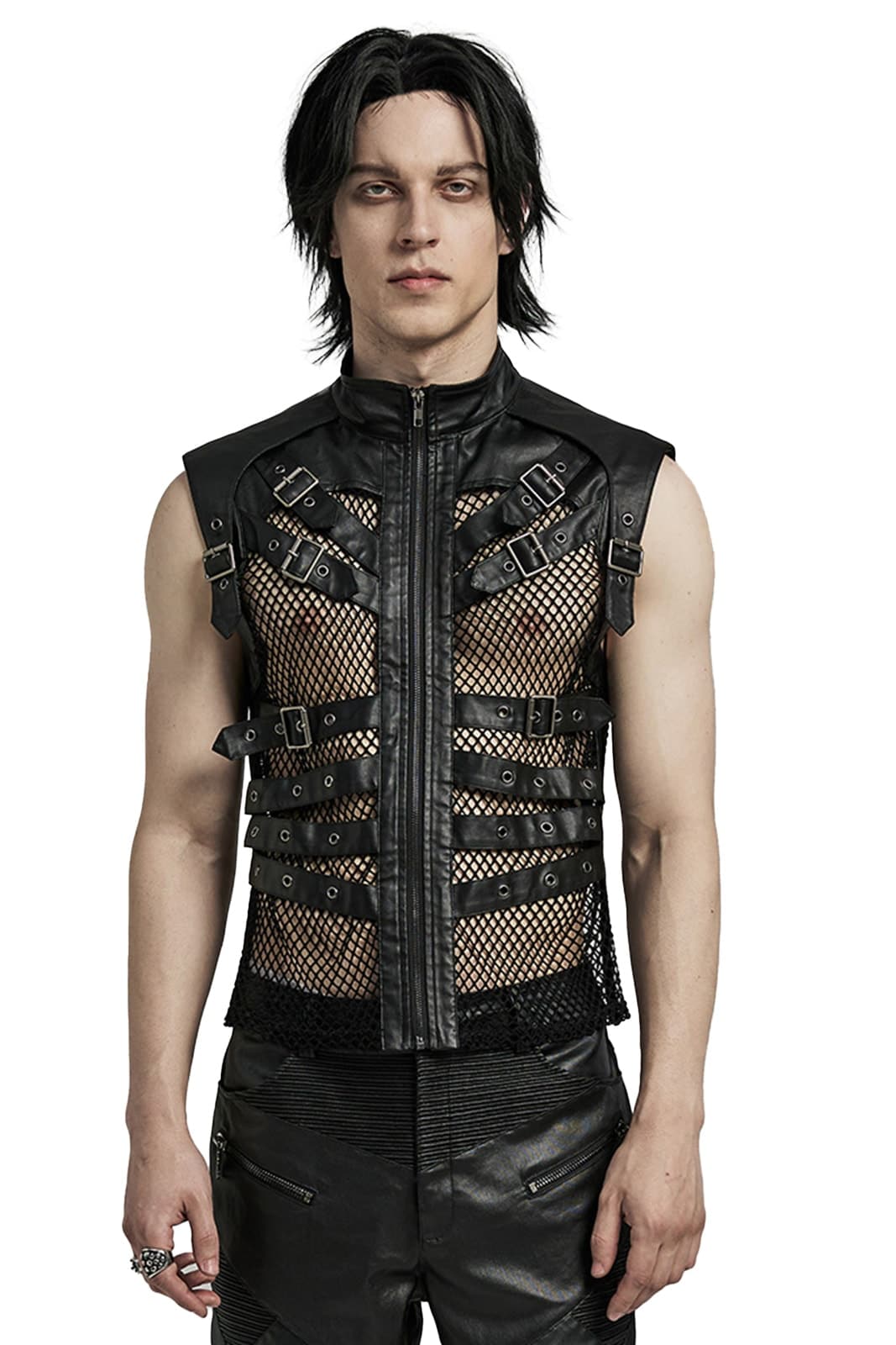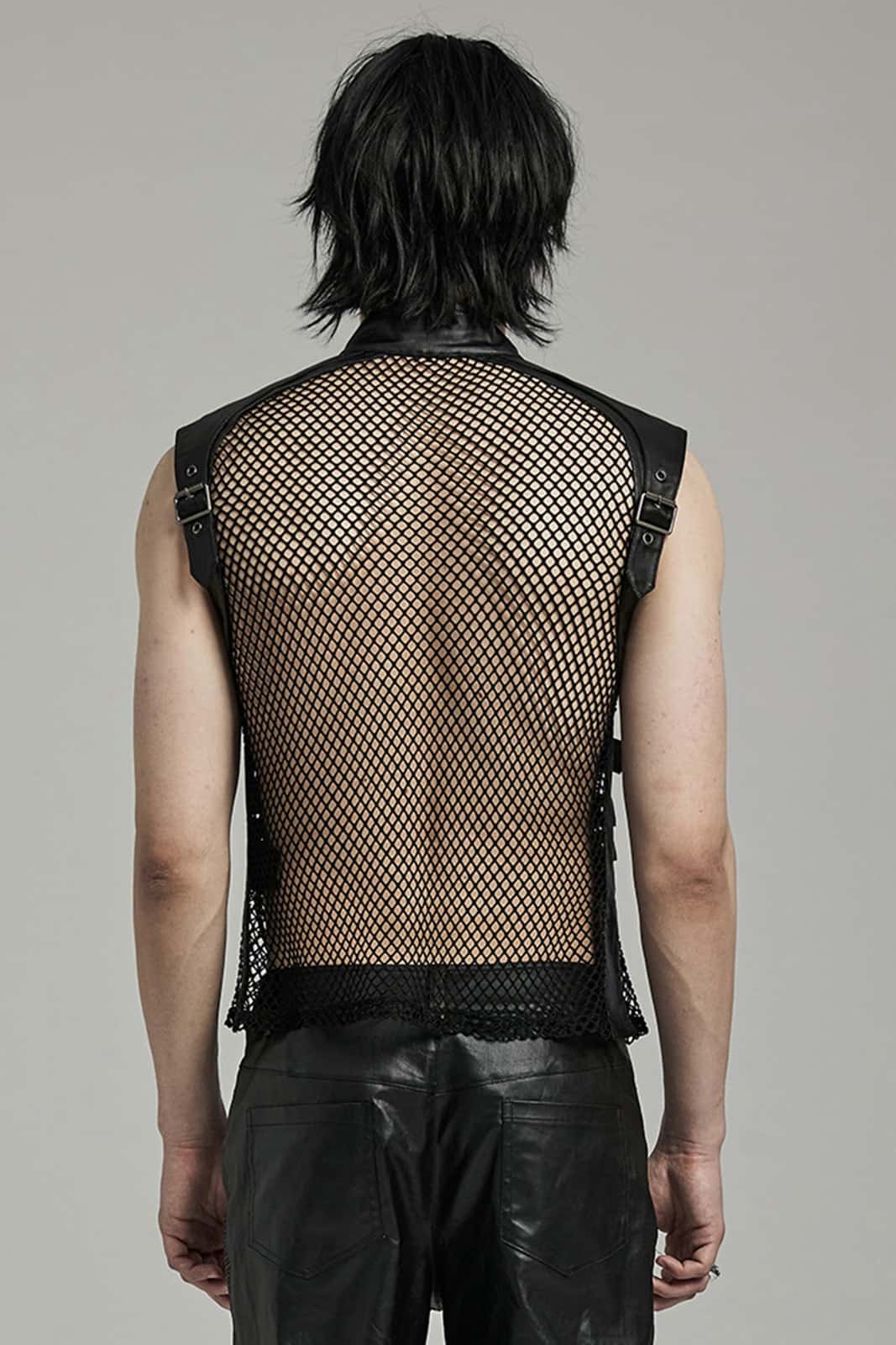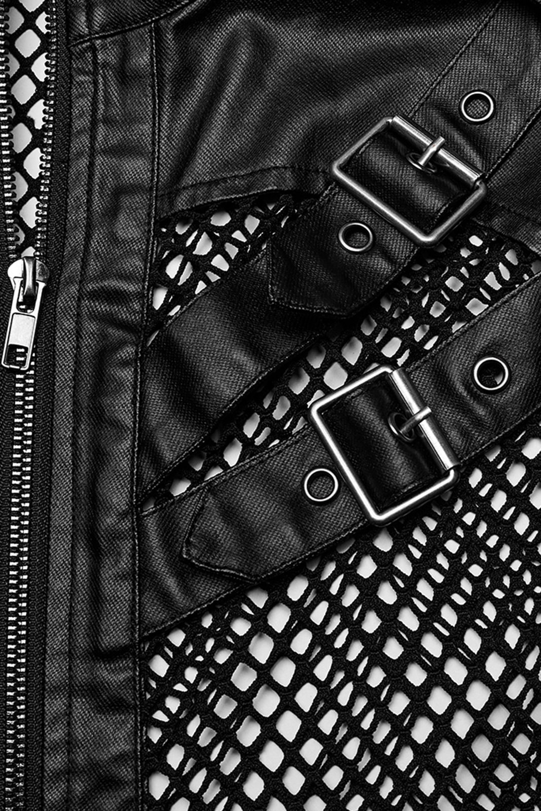 Das schwarze Netzgewebe sorgt für einen Hauch von Rebellion und ermöglicht sowohl Bewegung als auch Komfort, wenn Sie in die Nacht eintauchen. Details aus Kunstleder werten das Design auf, indem sie die Schultern, die Armöffnungen, die Seiten und die Verschlusskanten nachzeichnen und ihm Struktur und Charakter verleihen. Schnallenriemen und Ösendetails verleihen dem Stück Dimension und optisches Interesse, und der hohe Kragen unterstreicht die scharfe Silhouette der Weste und verleiht Ihrem Look eine beeindruckende Präsenz.
