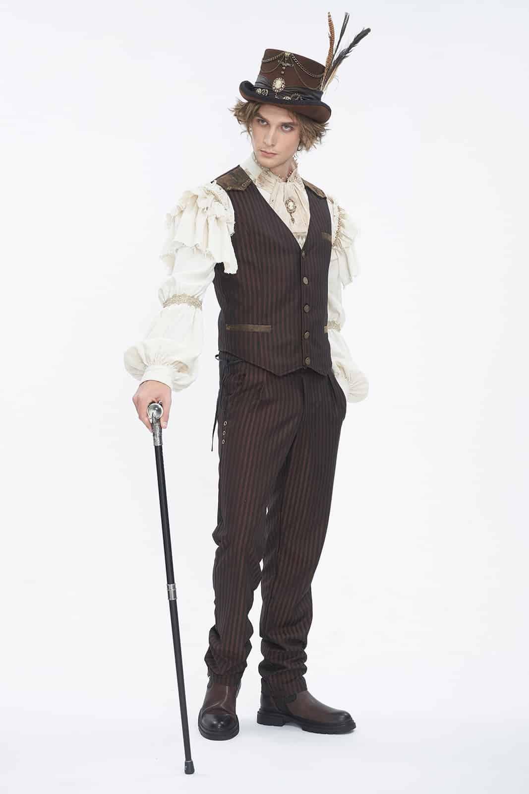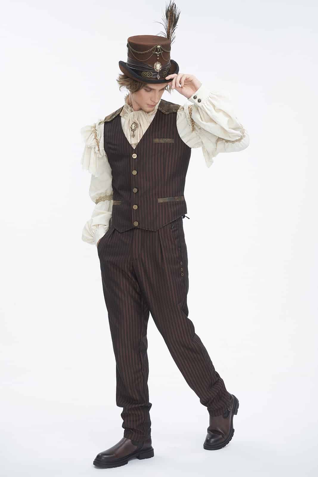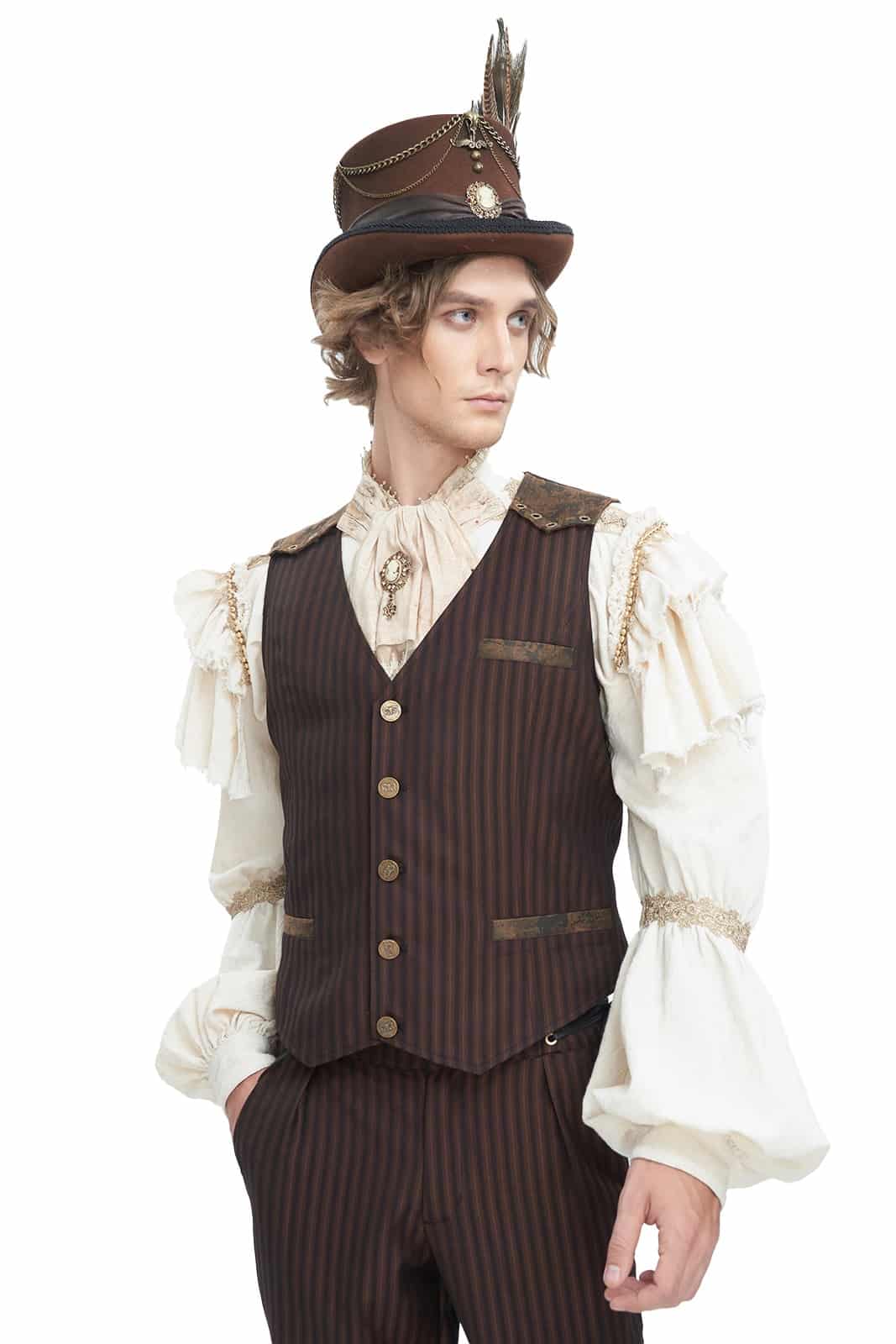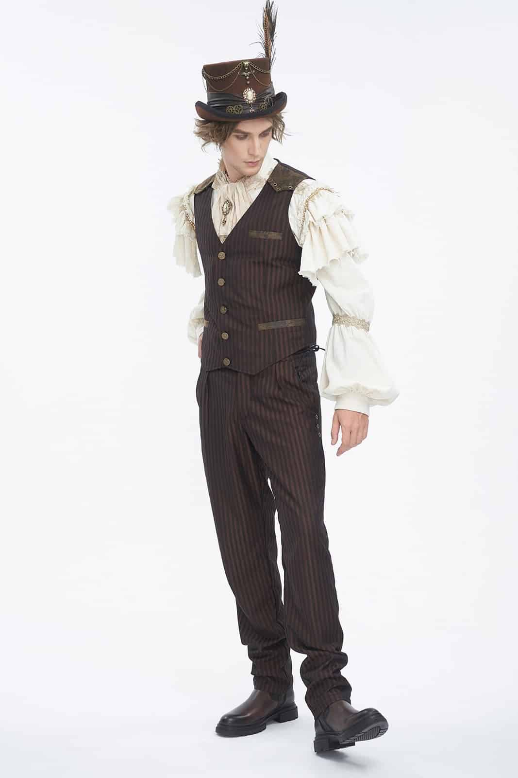 Die Steampunk Viserion-Weste erzählt eine Geschichte von mechanischem Wunder und viktorianischem Mysterium. Mit ihrem klassischen, taillierten Schnitt und dem V-Ausschnitt umarmt diese Weste die Vergangenheit und hält gleichzeitig die Zukunft in ihren Händen. Der braune Stoff, verziert mit einem dezenten schwarzen Streifenmuster, strahlt die Wärme von gealtertem Messing und die Schärfe des Industriezeitalters aus. Kunstlederakzente an den Taschenleisten, Schultern und dem Schnallenriemen auf der Rückseite sorgen für eine haptische Fülle, perfekt für jeden Steampunk-Abenteurer, der bereit ist, seinen nächsten Weg durch die Zeit einzuschlagen.