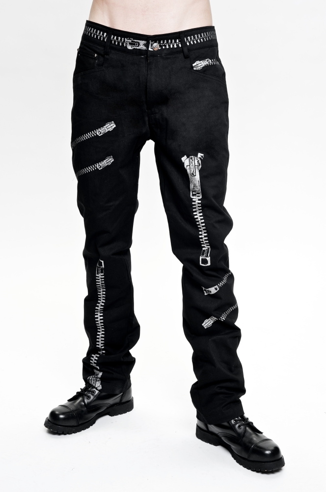 Herren Hose bedruckt mit großen, silberfarbenen Reißverschlüssen.