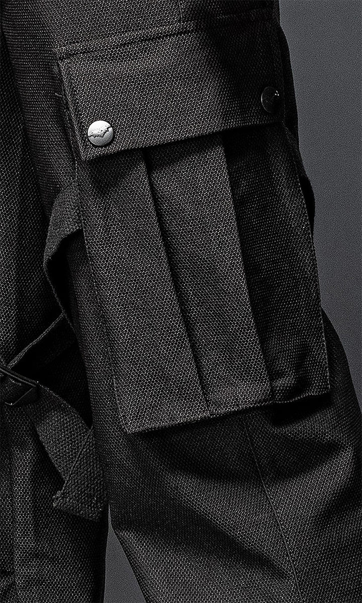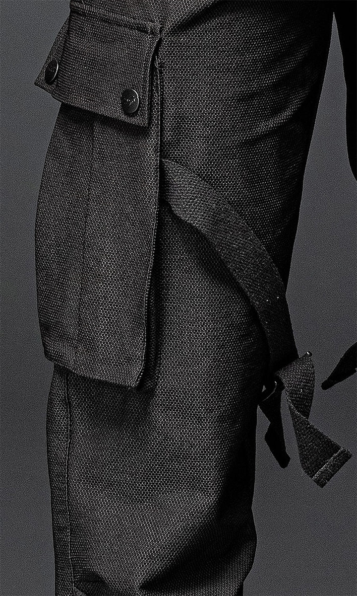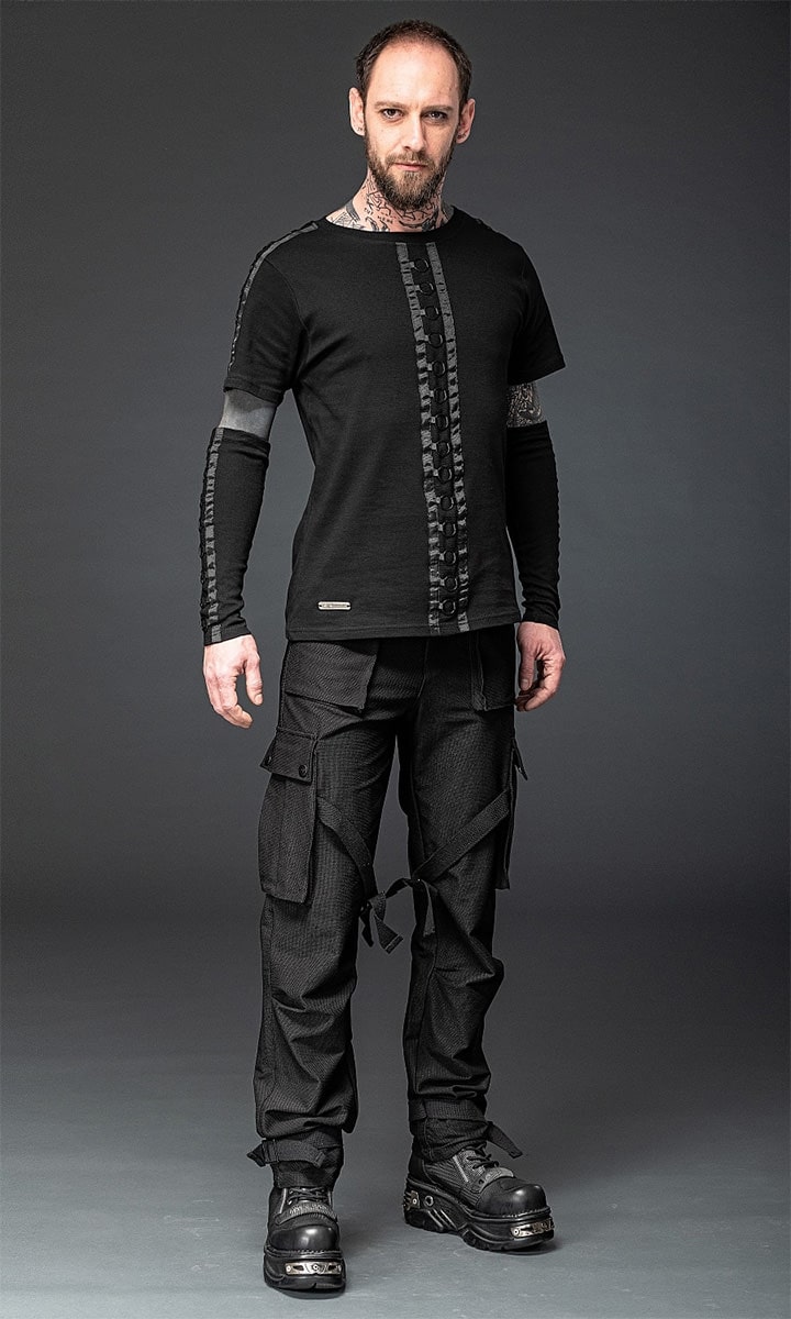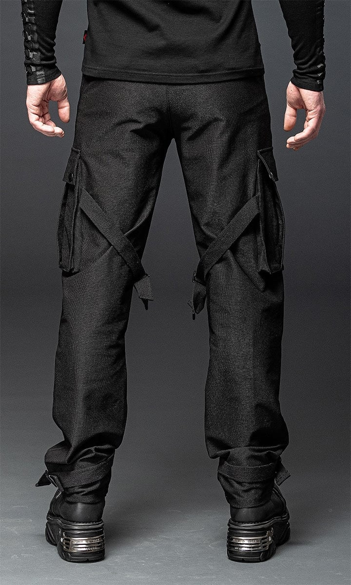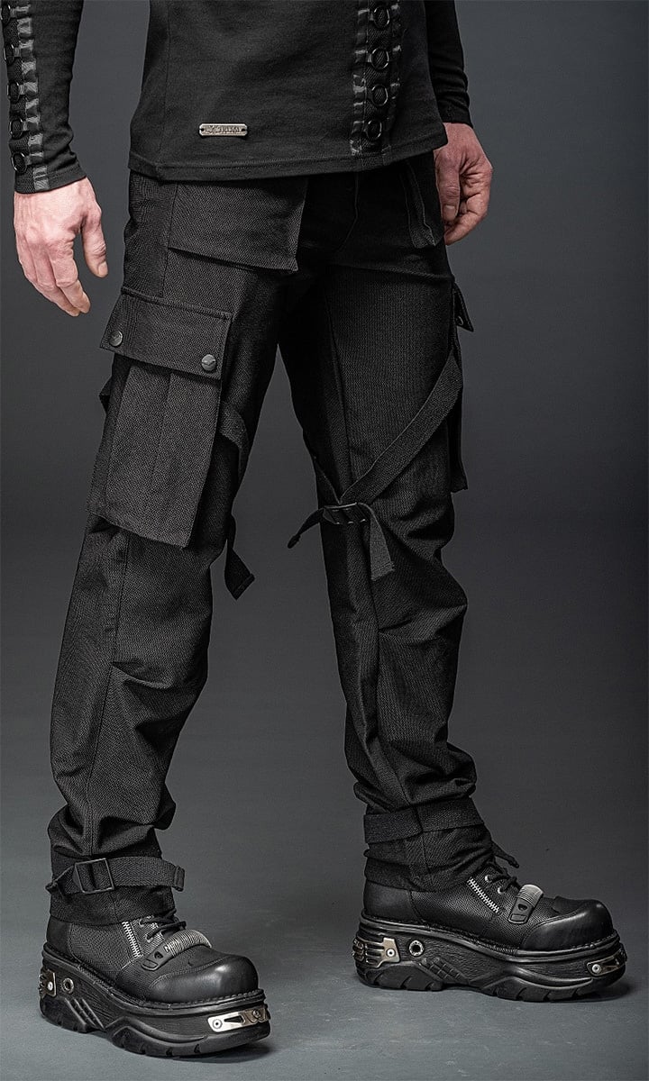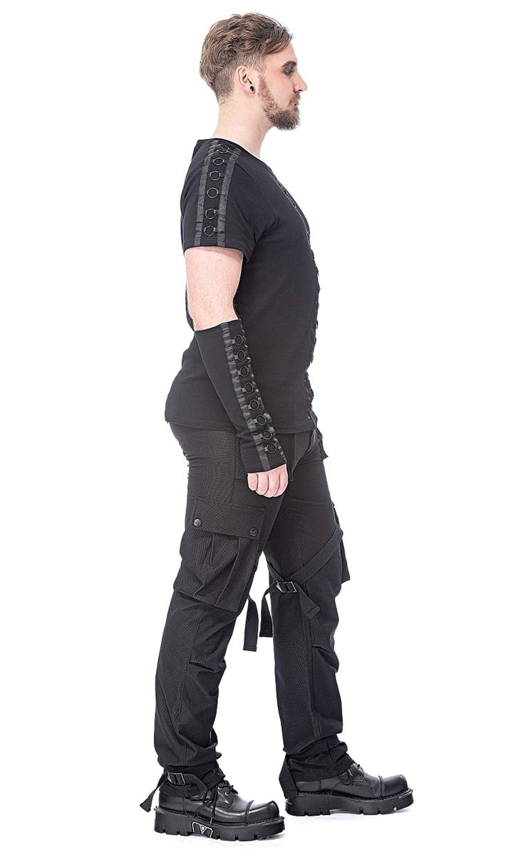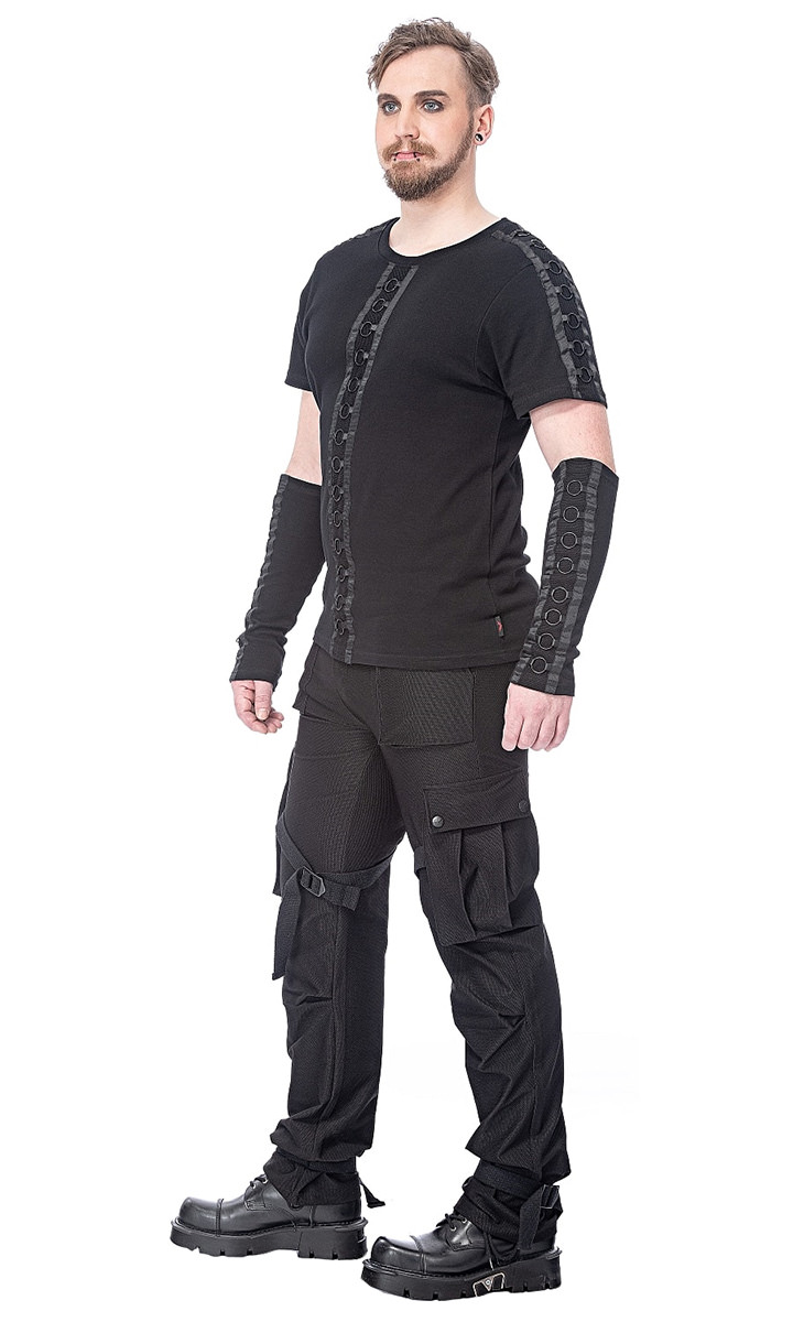 Herren Gothic Cargo-Hose aus Stretch-Polyester mit netzartiger Oberfläche. Gerade geschnitten, mit vier Taschen, teils mit Druckknöpfen zu schließen. Die Gesäßtaschen sind durch zwei Laschen lediglich angedeutet und nicht nutzbar. Ausgestattet mit Gürtelschlaufen und verstellbaren Riemen an den Beinen.