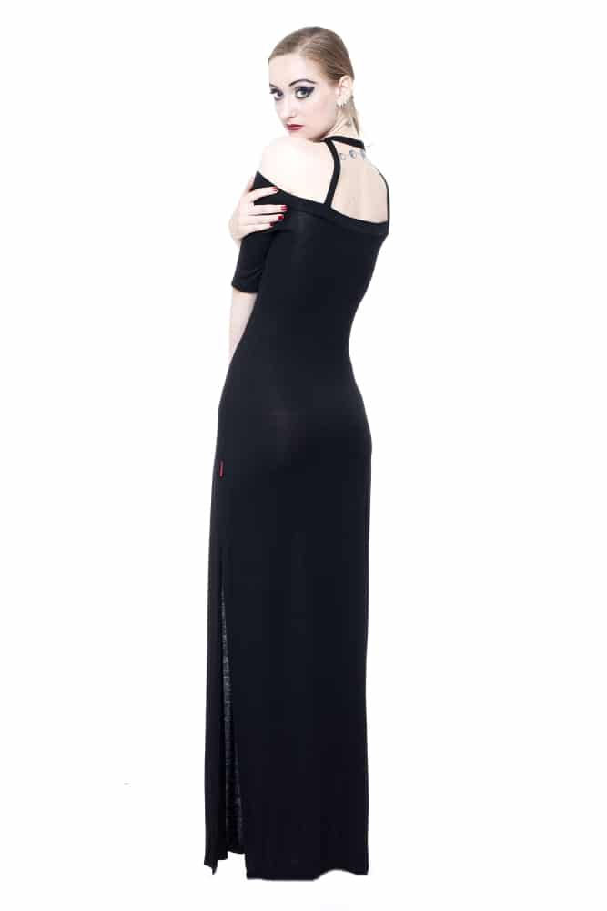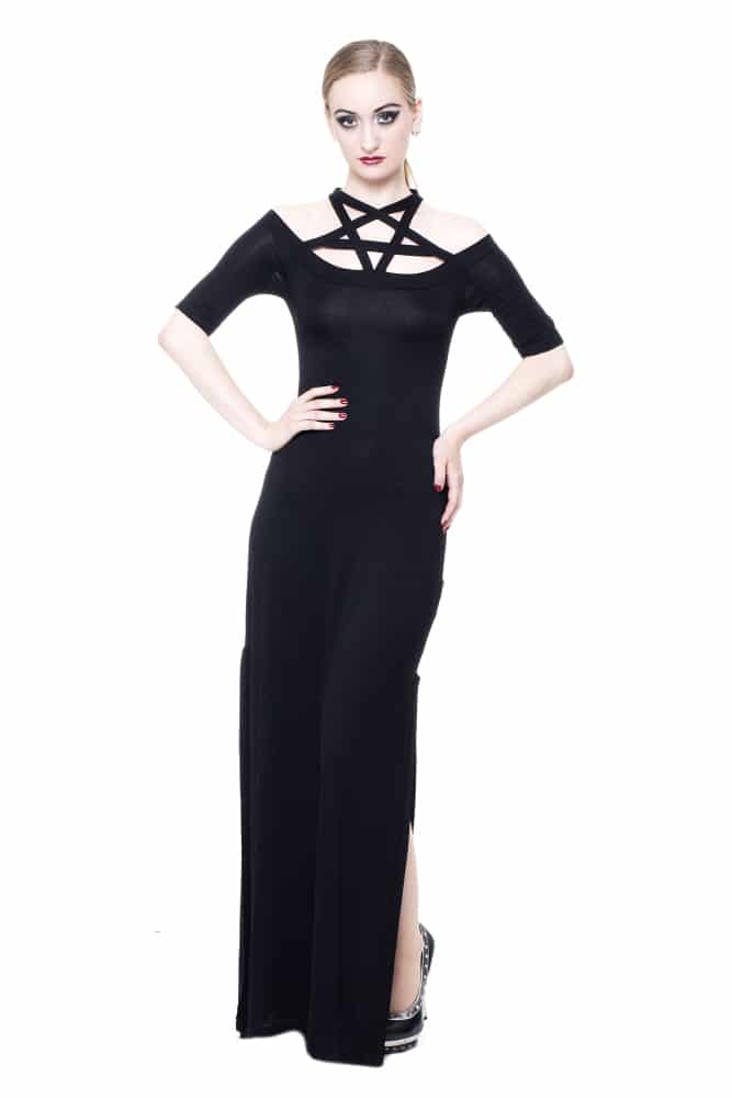 Langes, figurnah geschnittenes Kurzarm-Gothic Kleid aus weichem Jersey, geschlitzt, mit Pentagramm-Detail am Dekolletee.