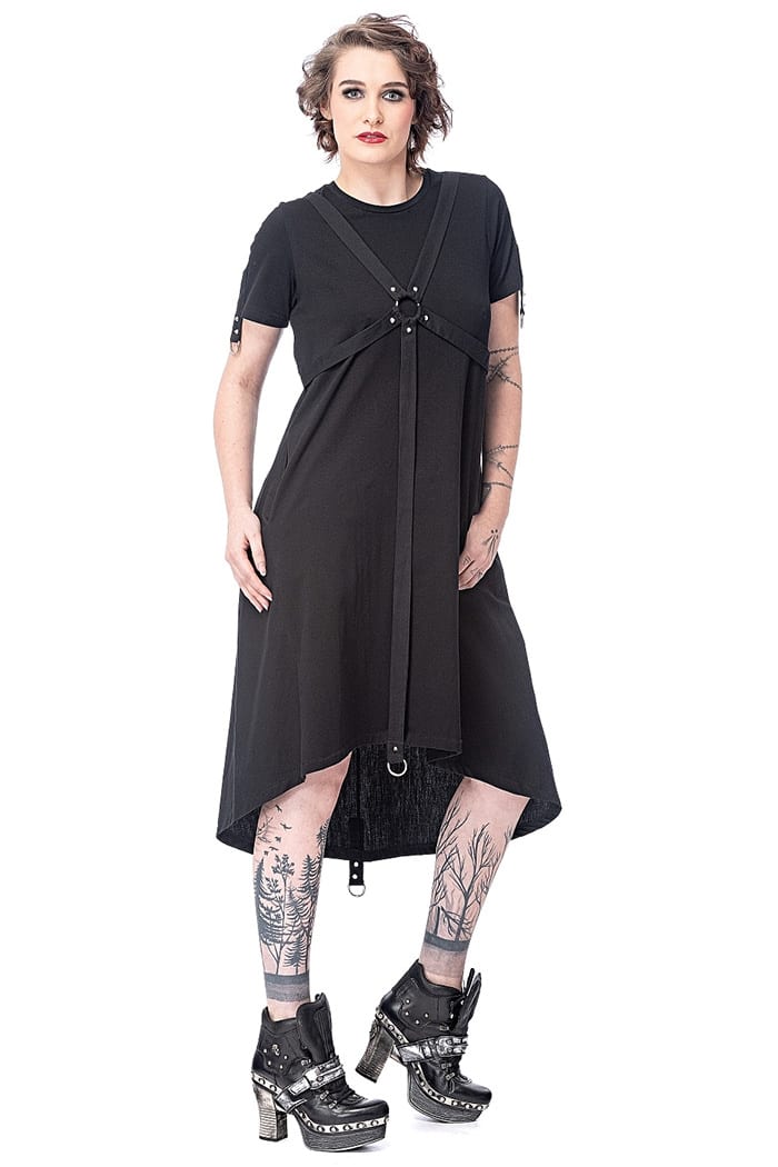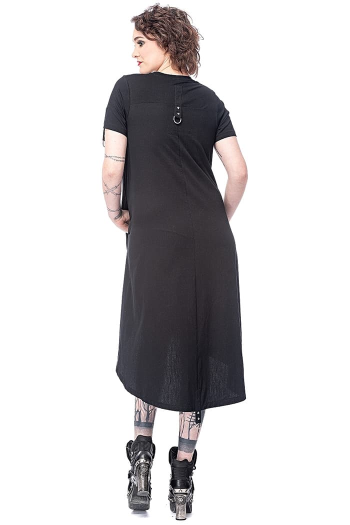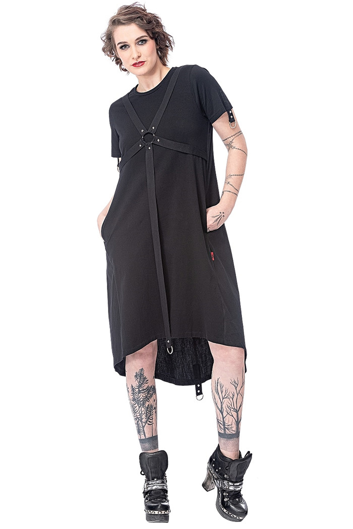 Bequem geschnittenes Gothic Kleid aus weichem Jersey im Bondage Style. Kurzärmelig, augestattet mit zwei Taschen und Rundhalsausschnitt. Hinten etwas länger geschnitten. Verziert mit Riemen, silberfarbenen O- und D-Ringen und Spitznieten.
