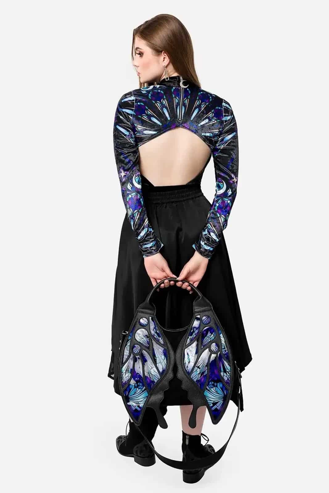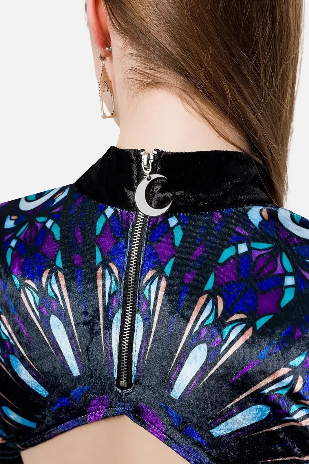 Dieser Bodysuit erinnert an das Licht, das durch alte Kathedralfenster fällt: tiefe, leuchtende Farben in Violett, Indigo und Türkis, die im Samt bei jeder Bewegung changieren. Das Muster wirkt wie ein gotisches Rosenfenster – kunstvoll, mystisch und ein wenig sakral. Der weiche Stretch-Samt schmiegt sich an die Silhouette an, sitzt glatt und angenehm und bringt ein elegantes, fast königliches Gefühl. Perfekt für Nacht-Outfits, Festivals, Dark-Aesthetic Looks oder einfach, um jeden Tag ein wenig dramatischer zu machen.