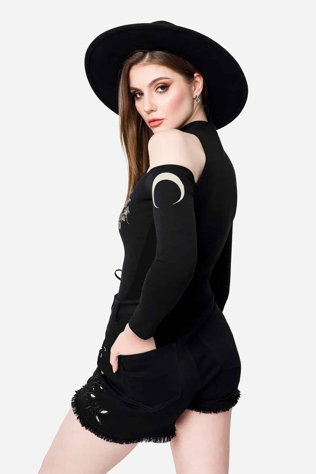 Mitternachtsmagie zum Anziehen: Dieser schwarze Body vereint weichen, elastischen Jersey mit coolen Cut-Out-Schultern und einem detailreichen Frontprint – eine majestätische Motte, umrahmt von Efeu, Pilzen, Sternen und Monden. Der hohe Kragen und die langärmlige Silhouette wirken edel, die Cold-Shoulder-Details bringen moderne Kante. Bequem, figurbetont und vielseitig – perfekt für Whimsigoth-, Dark-Boho- und Hexen-Looks von Alltag bis Ausgehen.