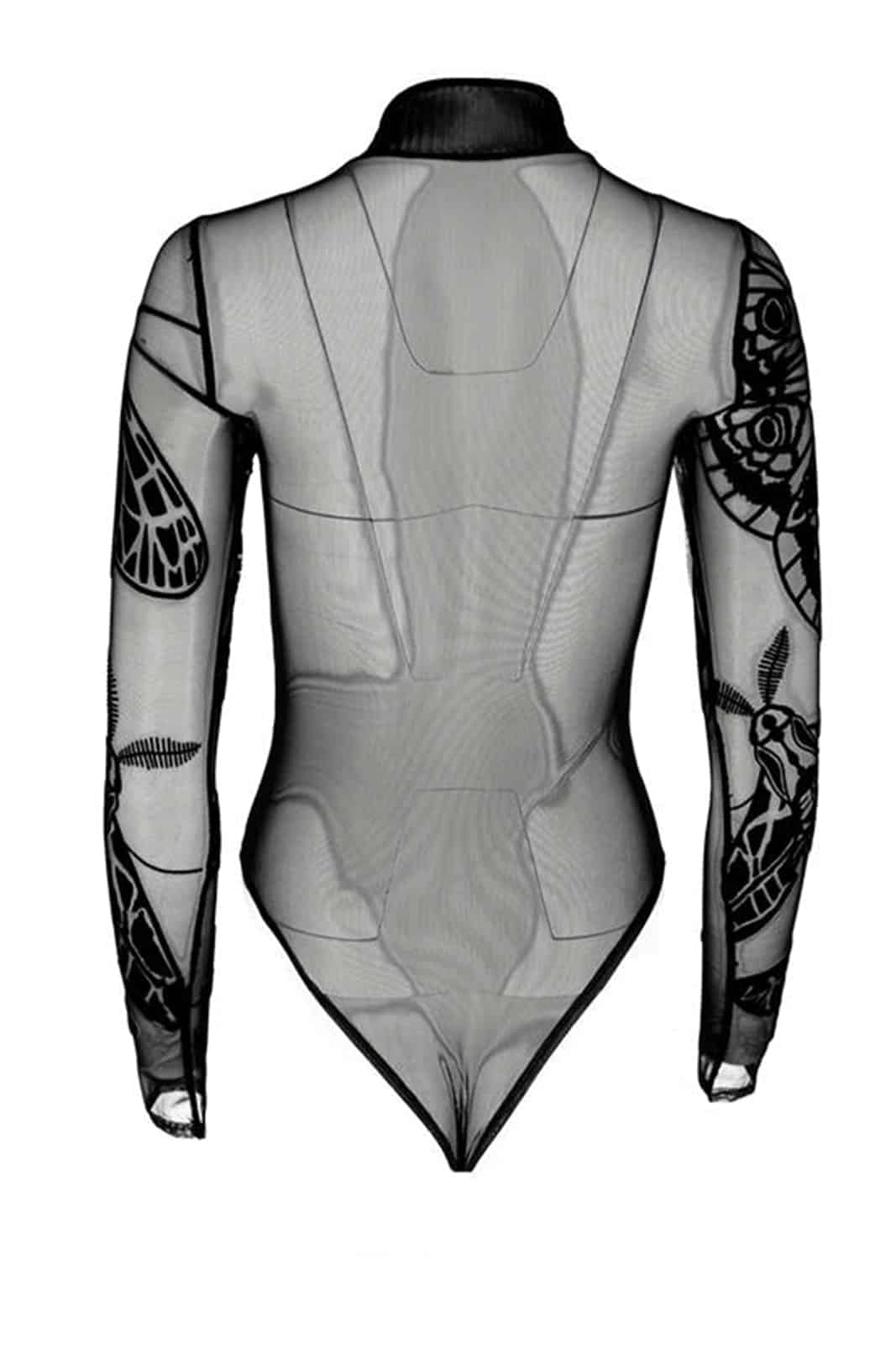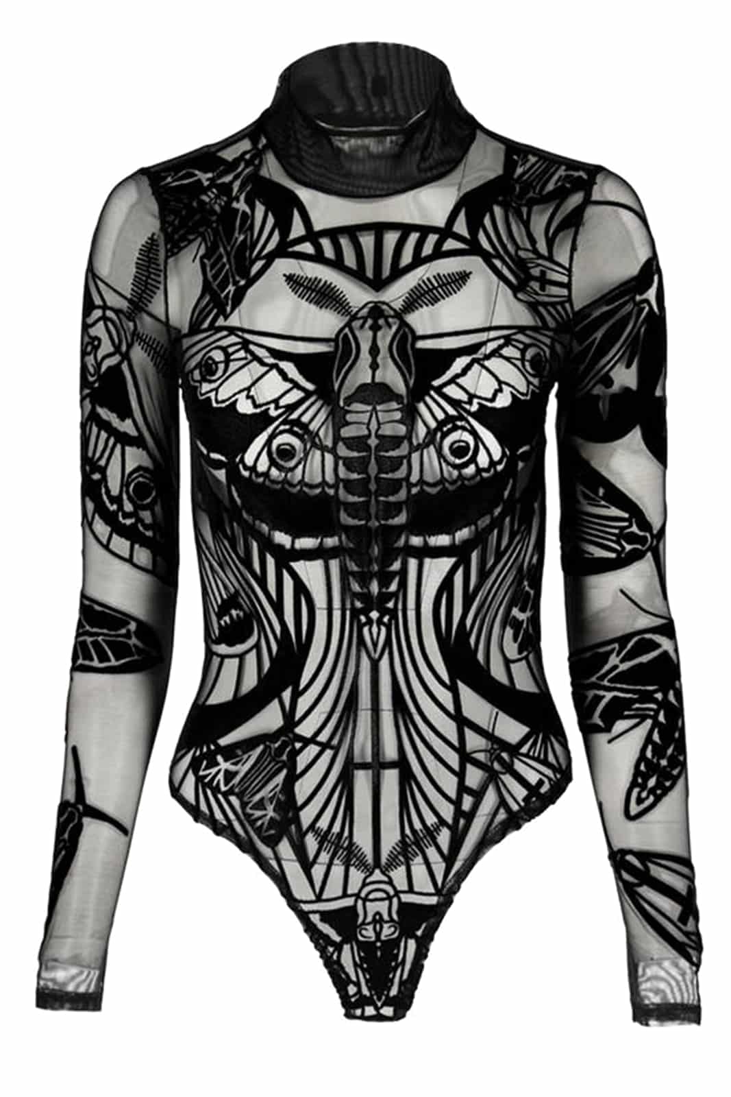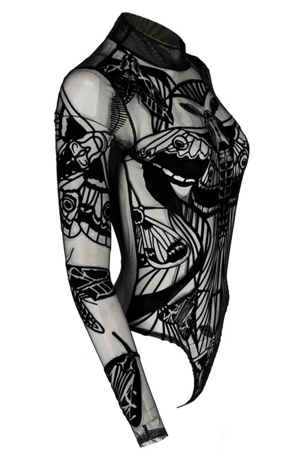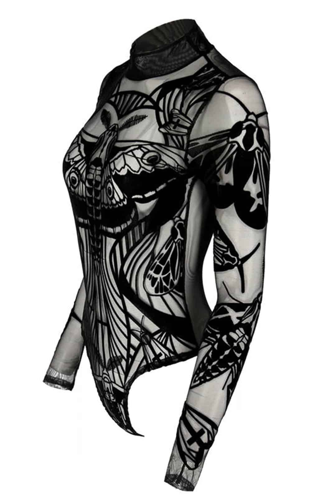 Das Muster zeigt verschiedene gotische Motten. Die Schleifen an den Seiten schmälern deine Taille zusätzlich optisch und die größte Motte wurde so aufgedruckt, dass sie deine Oberweite betont.
