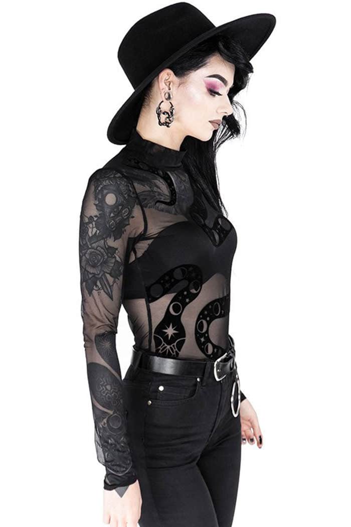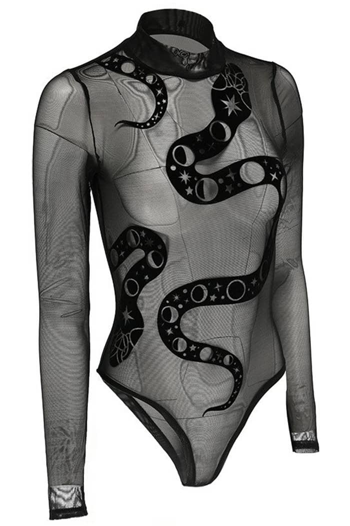 Gothic Body im Occult-Style aus feinstem Netzmaterial mit Stehkragen, beflockt mit einer Schlange und Mondphasen. Langärmelig, im Schritt mit Druckknöpfen zu schließen.