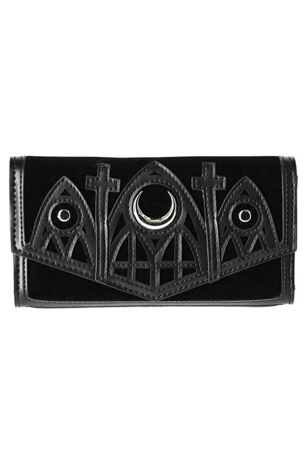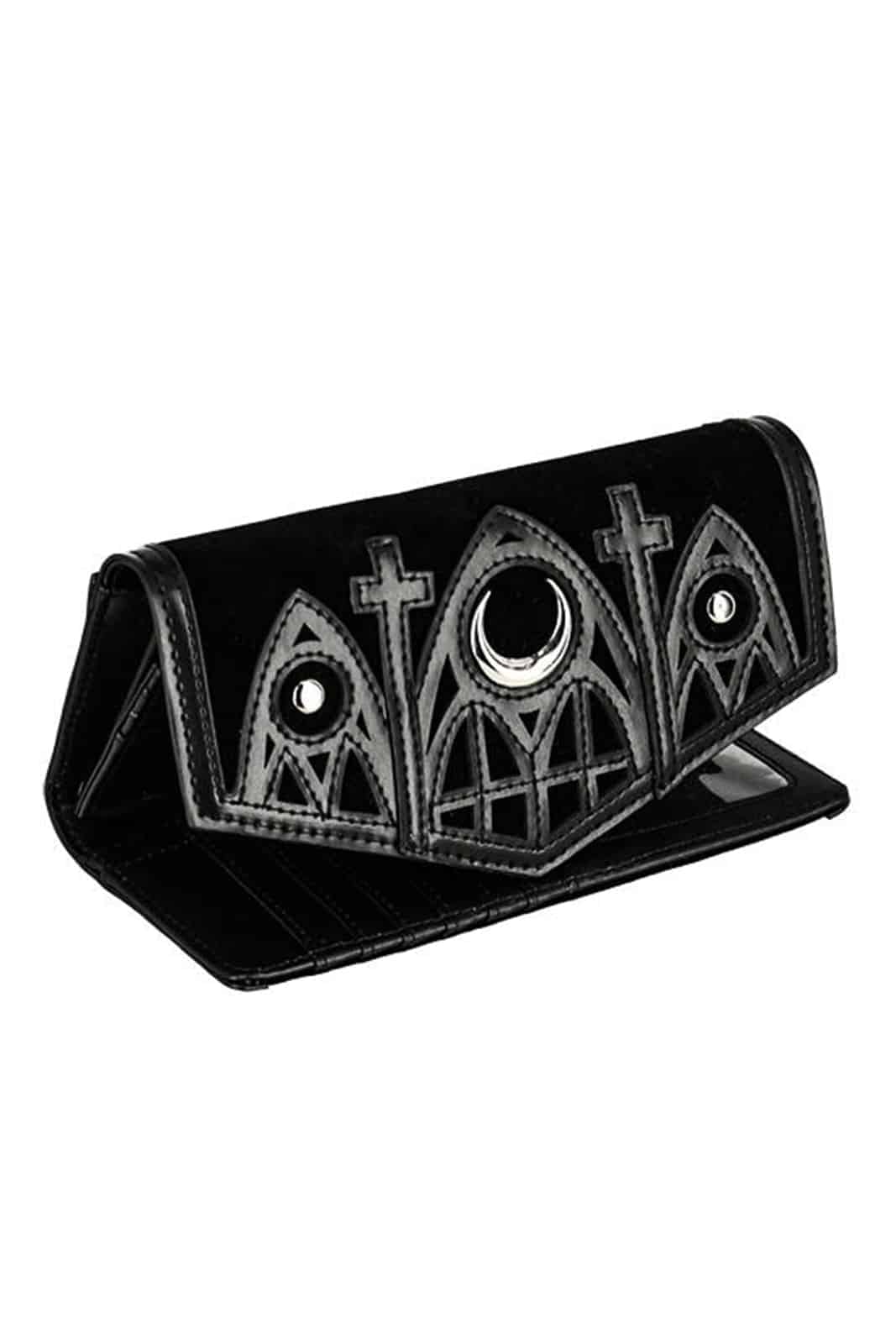 Hergestellt aus hochwertigem Samt, mit Kunstleder besetzt und mit einem lasergeschnittenen Kathedralenmuster verziert. Dieses Portemonnaie ist die Quintessenz all dessen, was an gotischer Architektur begeistert. Da passt alles Wichtige hinein: Geldscheine und Münzen, Karten und Visitenkarten. Die Börse wird mit einem starken Riegel geschlossen. Er lässt sich schnell öffnen und überrascht im Inneren mit einer Vielzahl an Fächern. Ein Dreifachfach für Banknoten und eine Reißverschlusstasche für Münzen fehlen nicht. Unter einem Steckplatz für Karten findest Du zwei weitere versteckte Fächer für alles, was Deine gothische, dunkle Seele vor der Welt verstecken