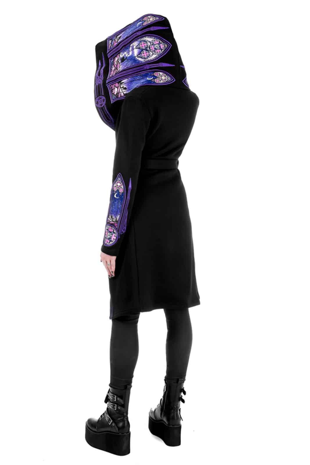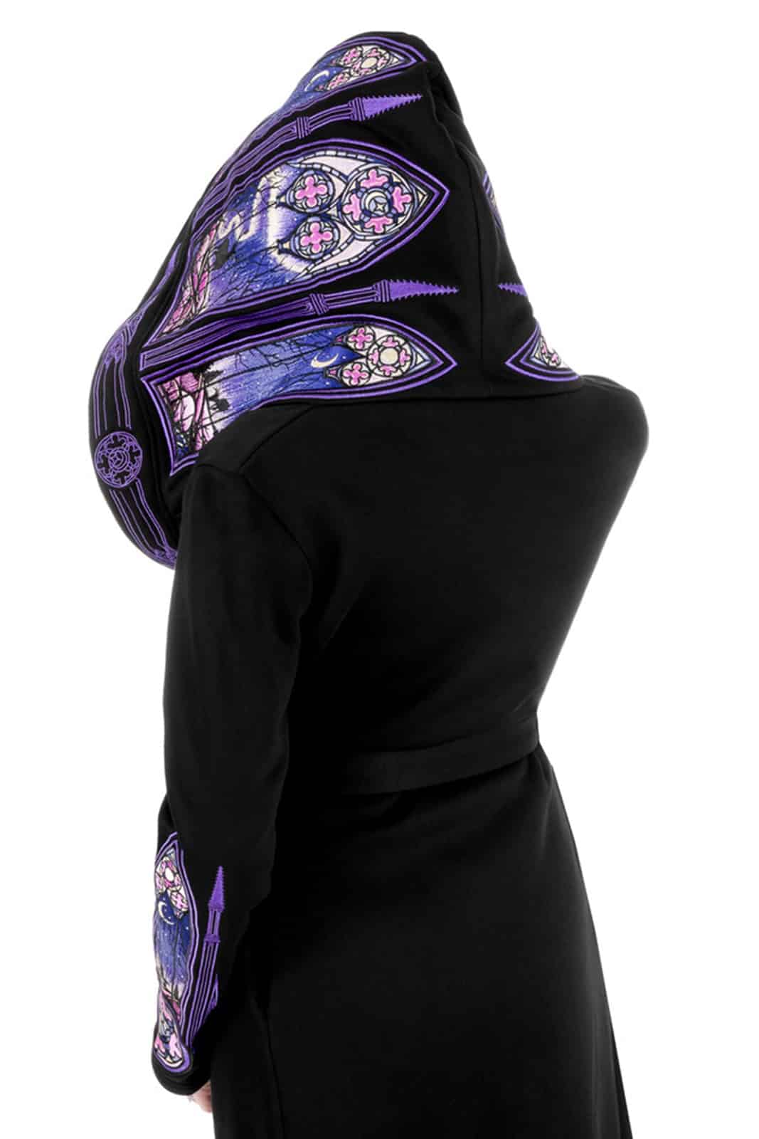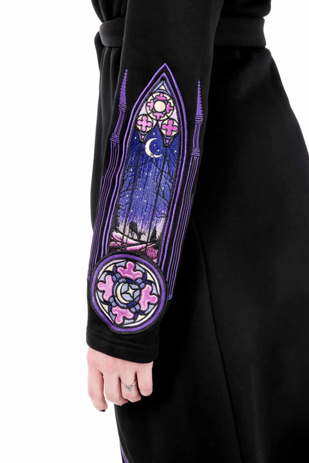 Dabei handelt es sich nicht um irgendeine Stickerei – sie ist dicht gestickt und aufwendig detailliert, das Ergebnis stundenlanger, sorgfältiger Arbeit. Ein wahres Meisterwerk.Dicht gestickte Grafiken von gotischen Kathedralen und Nordlichtern wickeln sich um die Kapuze, die Vorderseite und die Ärmel – ein beeindruckendes Kunstwerk, das wirklich auffällt!