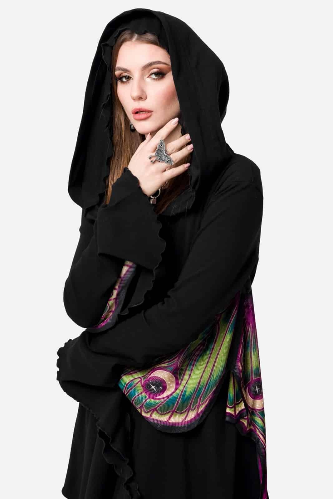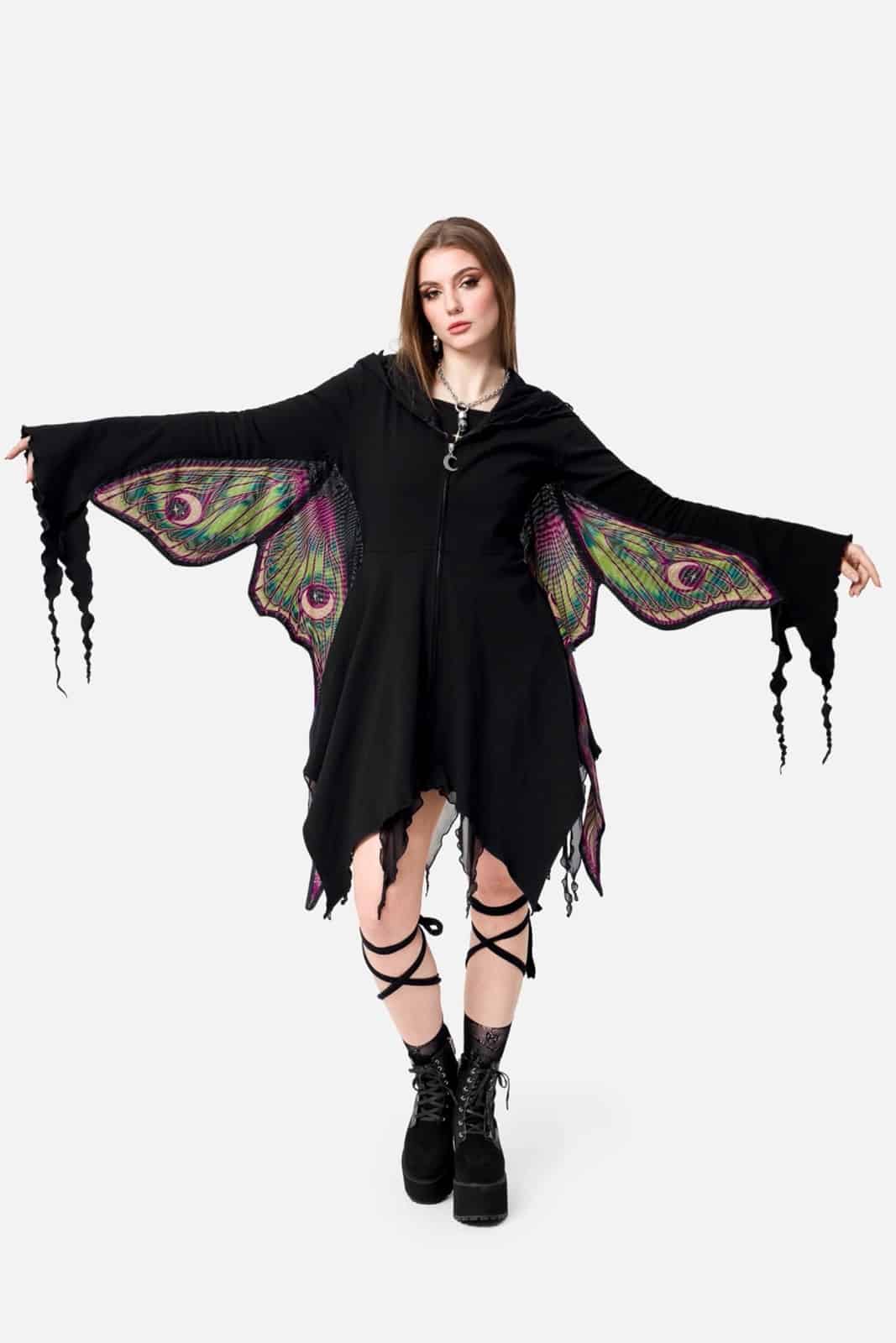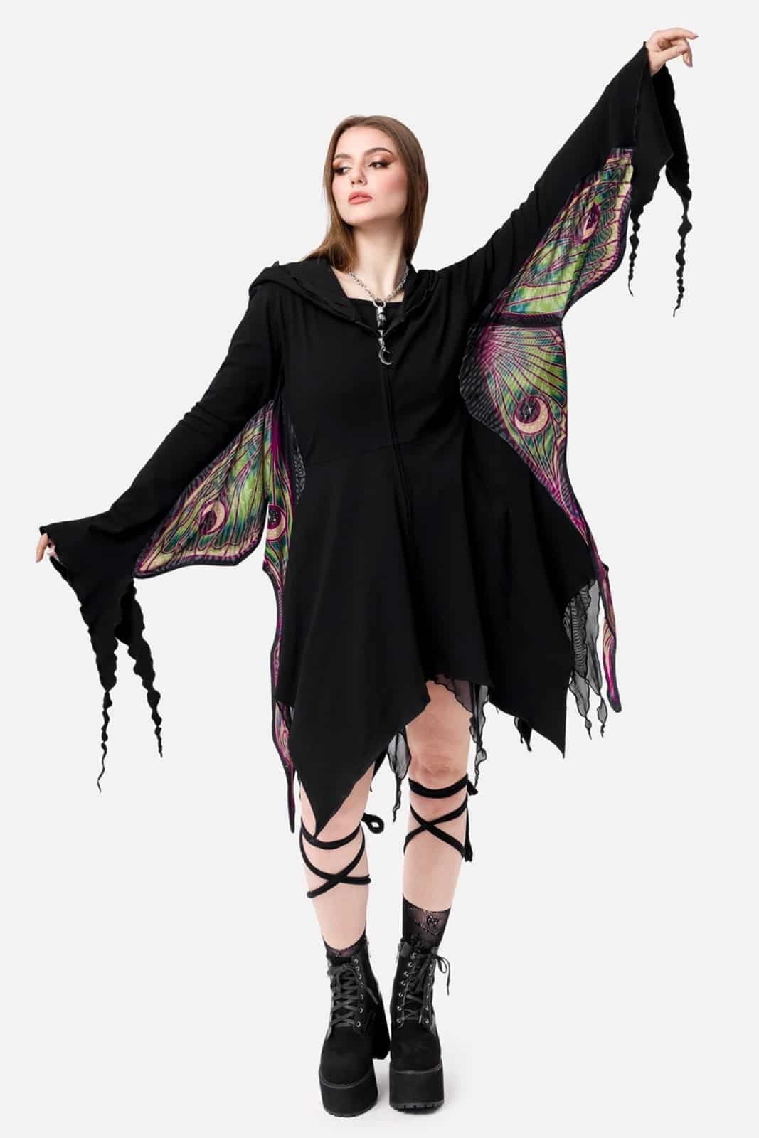 Ein Hoodie wie aus einem dunklen Märchen: weicher, warmer Jersey fällt in einer fließenden, leicht oversized Silhouette, während sich an den Ärmeln doppelseitige 3D-Mottenflügel in irisierenden Farben entfalten – jedes Anheben der Arme wird zur Verwandlung. Die große Kapuze, gezackte Rüschenkanten und transparente Chiffon-Einsätze verleihen einen ätherischen Pixie-Look, der sich von Alltags-Streetwear bis Festival mühelos stylen lässt. Reißverschluss mit Halbmond-Anhänger, anschmiegsamer Griff und liebevolle Details machen das Stück zur perfekten Wahl für Witchy, Whimsigoth und Dark-Boho Outfits.