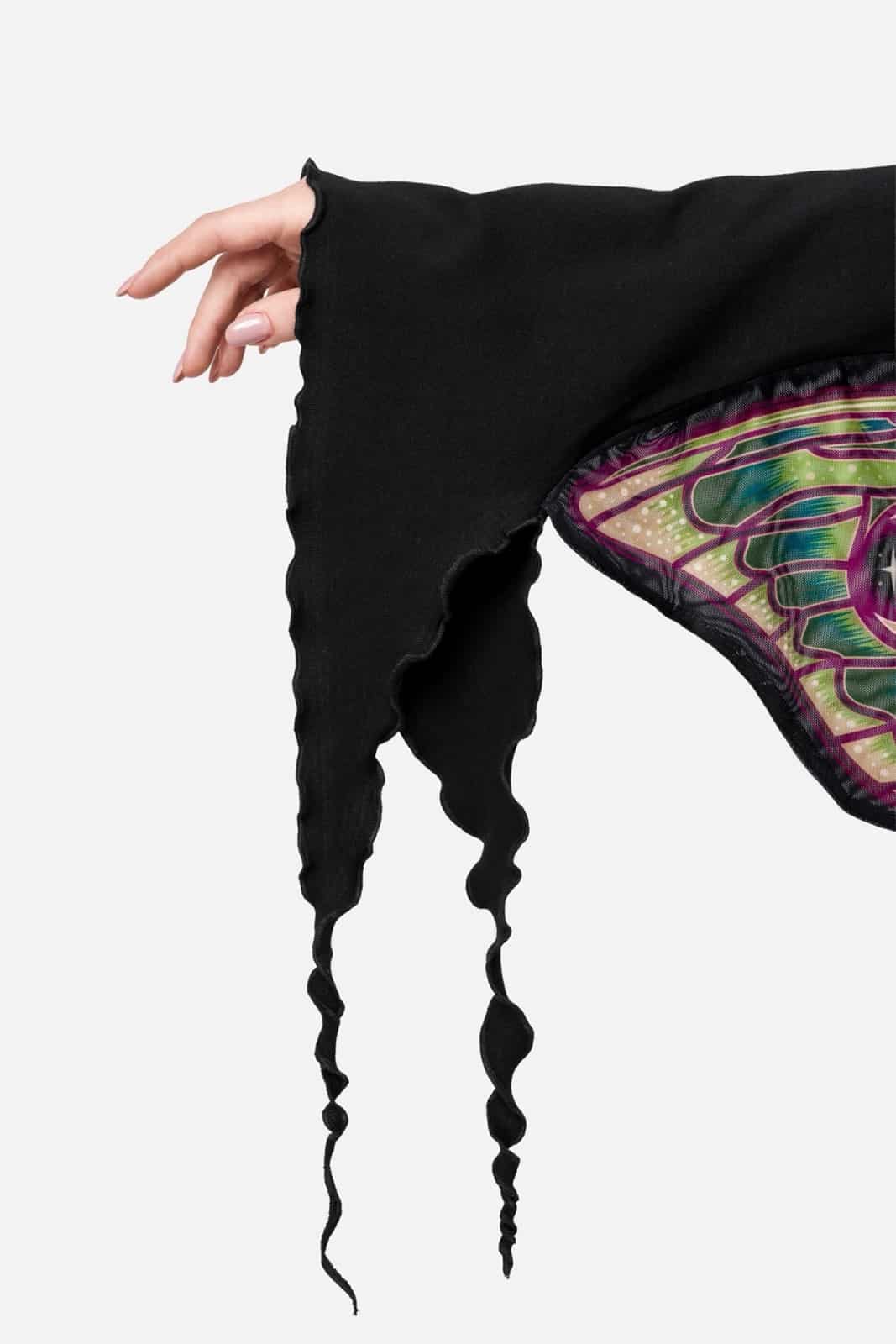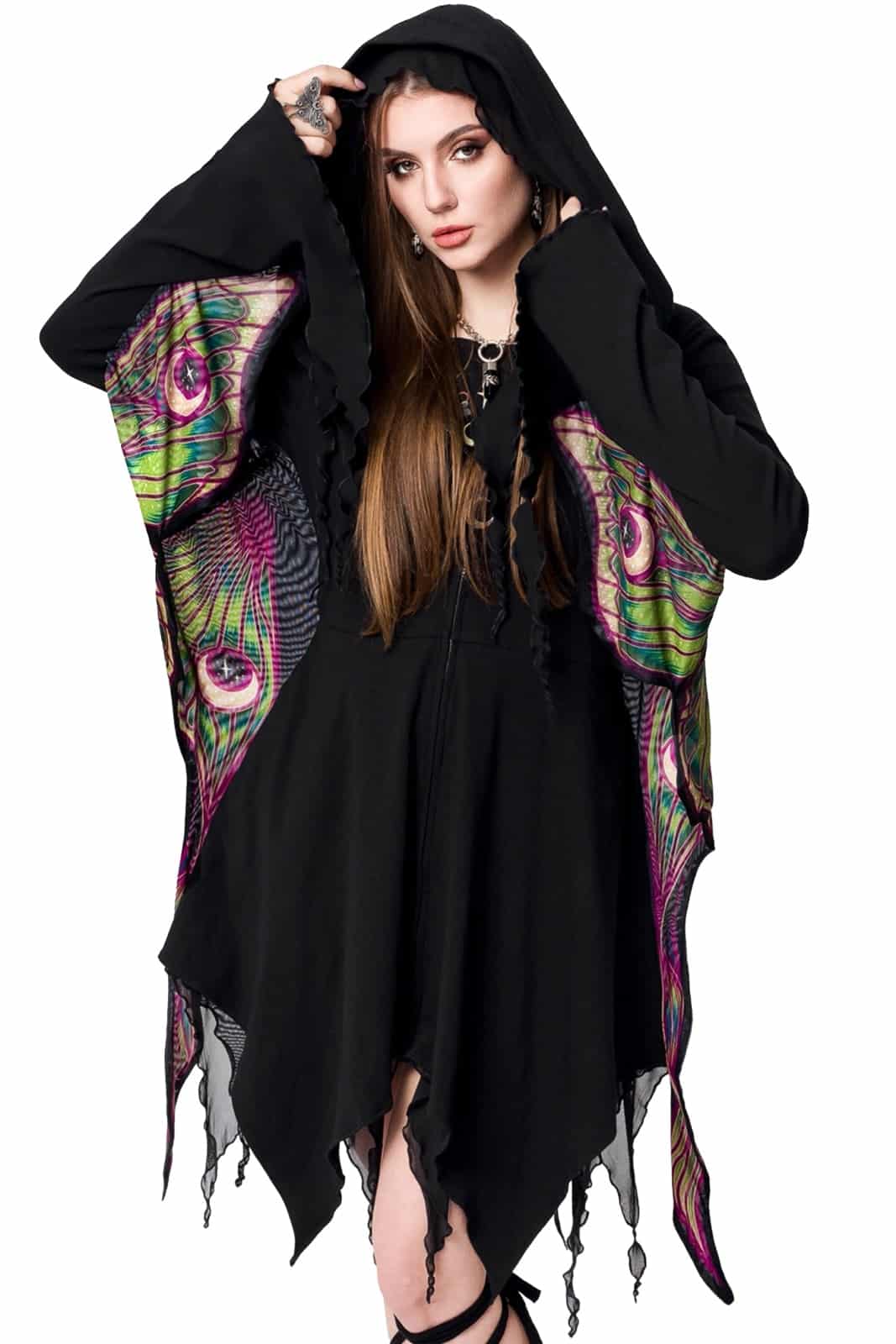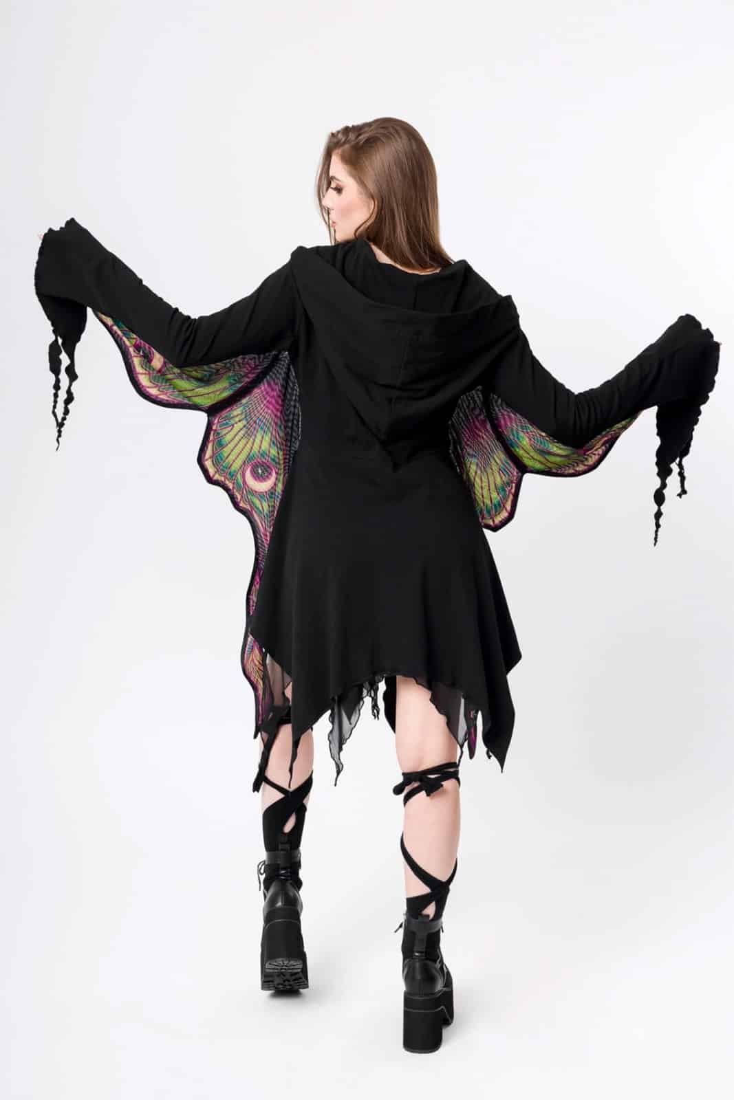 Ein Hoodie wie aus einem dunklen Märchen: weicher, warmer Jersey fällt in einer fließenden, leicht oversized Silhouette, während sich an den Ärmeln doppelseitige 3D-Mottenflügel in irisierenden Farben entfalten – jedes Anheben der Arme wird zur Verwandlung. Die große Kapuze, gezackte Rüschenkanten und transparente Chiffon-Einsätze verleihen einen ätherischen Pixie-Look, der sich von Alltags-Streetwear bis Festival mühelos stylen lässt. Reißverschluss mit Halbmond-Anhänger, anschmiegsamer Griff und liebevolle Details machen das Stück zur perfekten Wahl für Witchy, Whimsigoth und Dark-Boho Outfits.