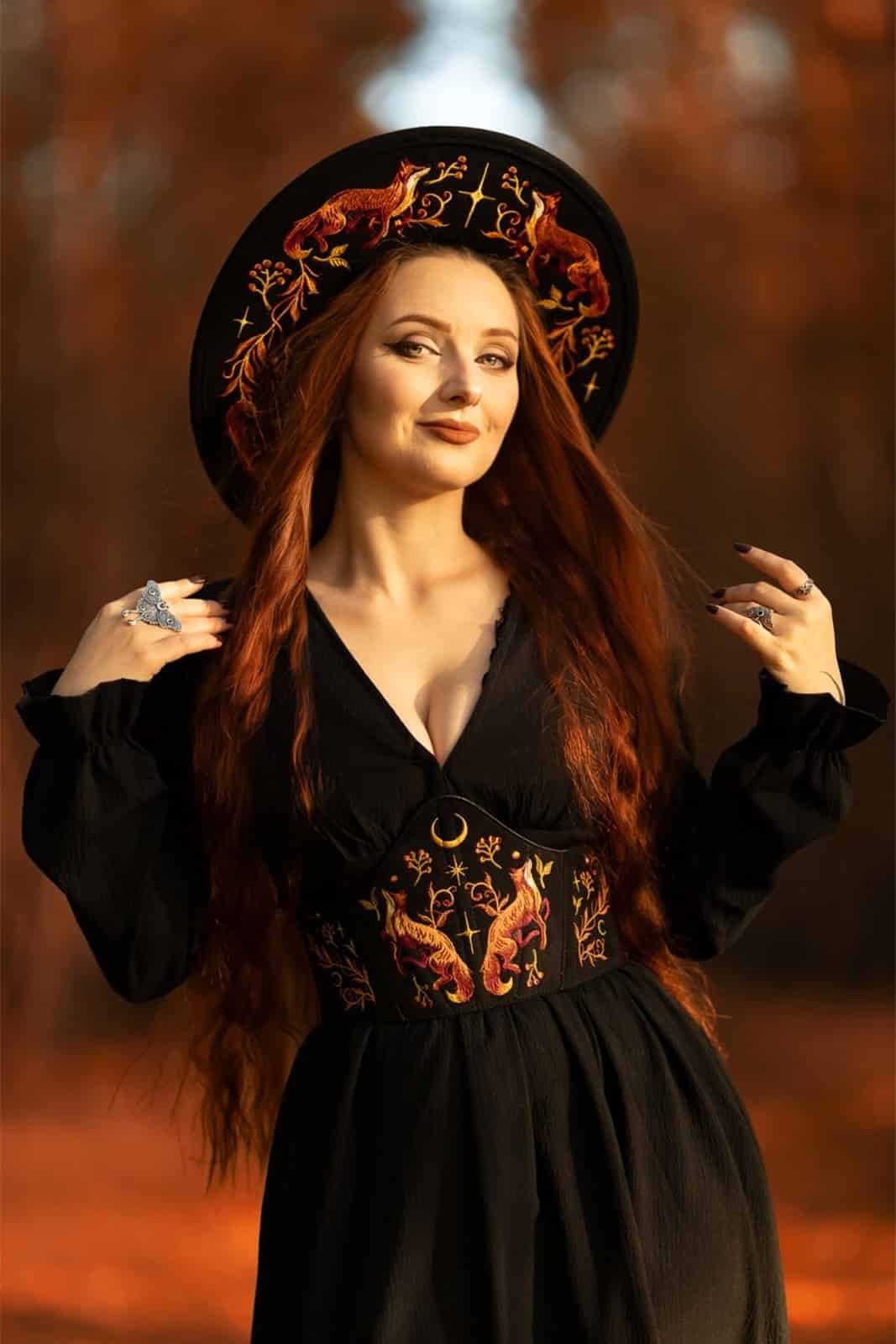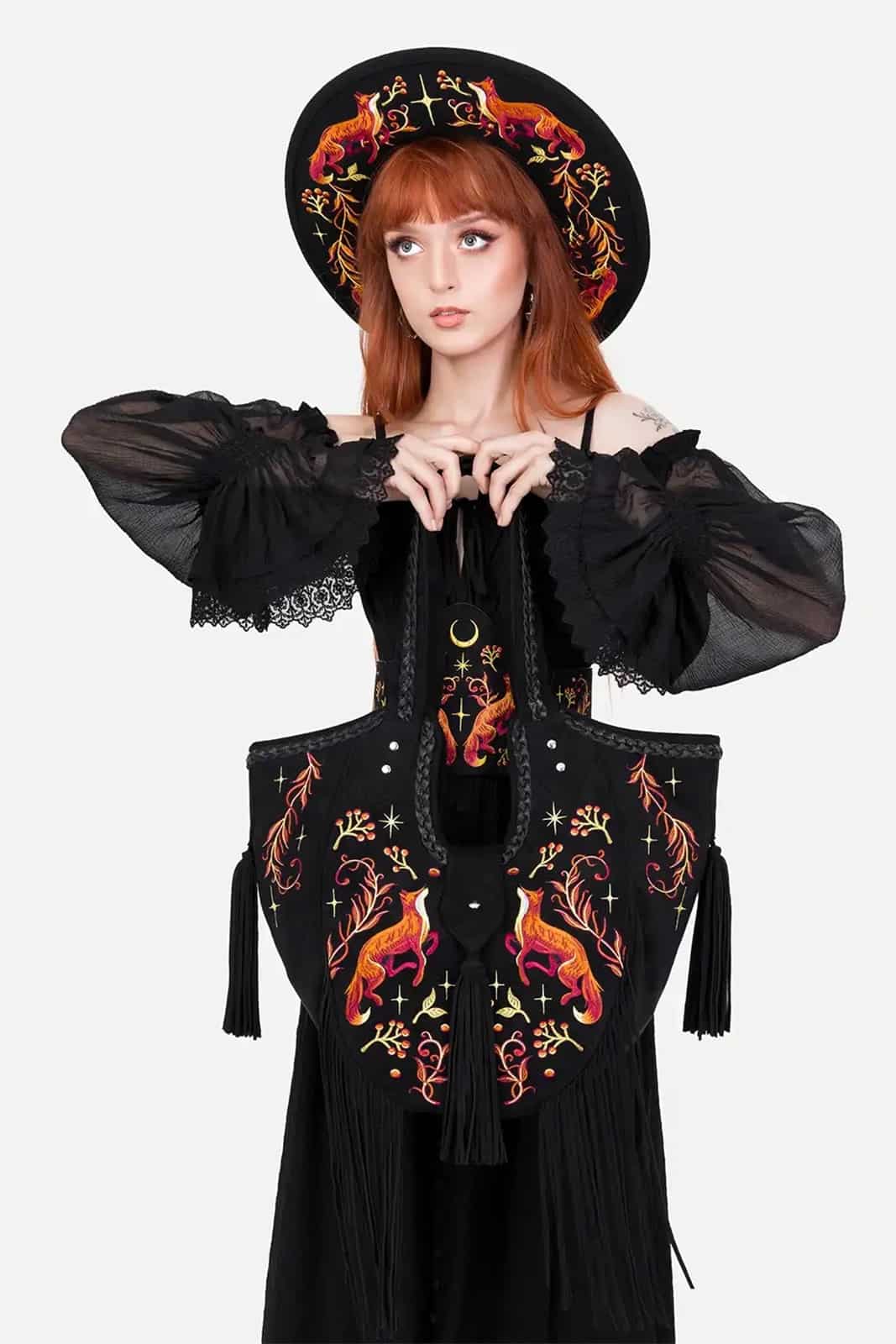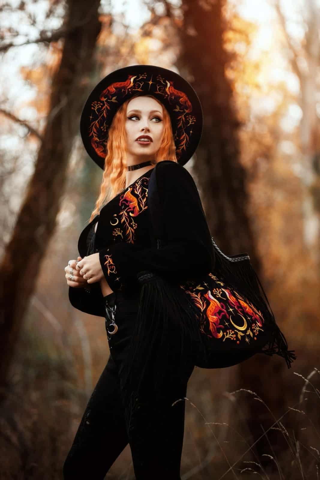 Der EMBERS Hut verbindet feurige Symbolik mit dunkler Eleganz. Auf tiefschwarzem Wollfilz entfalten sich detailreiche Stickereien aus Füchsen und flammenartigen Pflanzenmotiven, die wilde Naturkraft und mystische Ästhetik vereinen. Die breite Krempe, das schwarze Band sowie der geflochtene Rand mit Quasten verleihen dem Hut einen zeremoniellen, statementstarken Charakter – ideal für Witchy, elementare und naturinspirierte Looks.