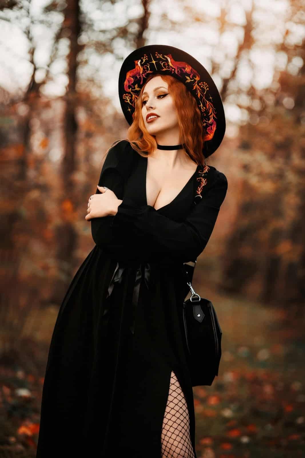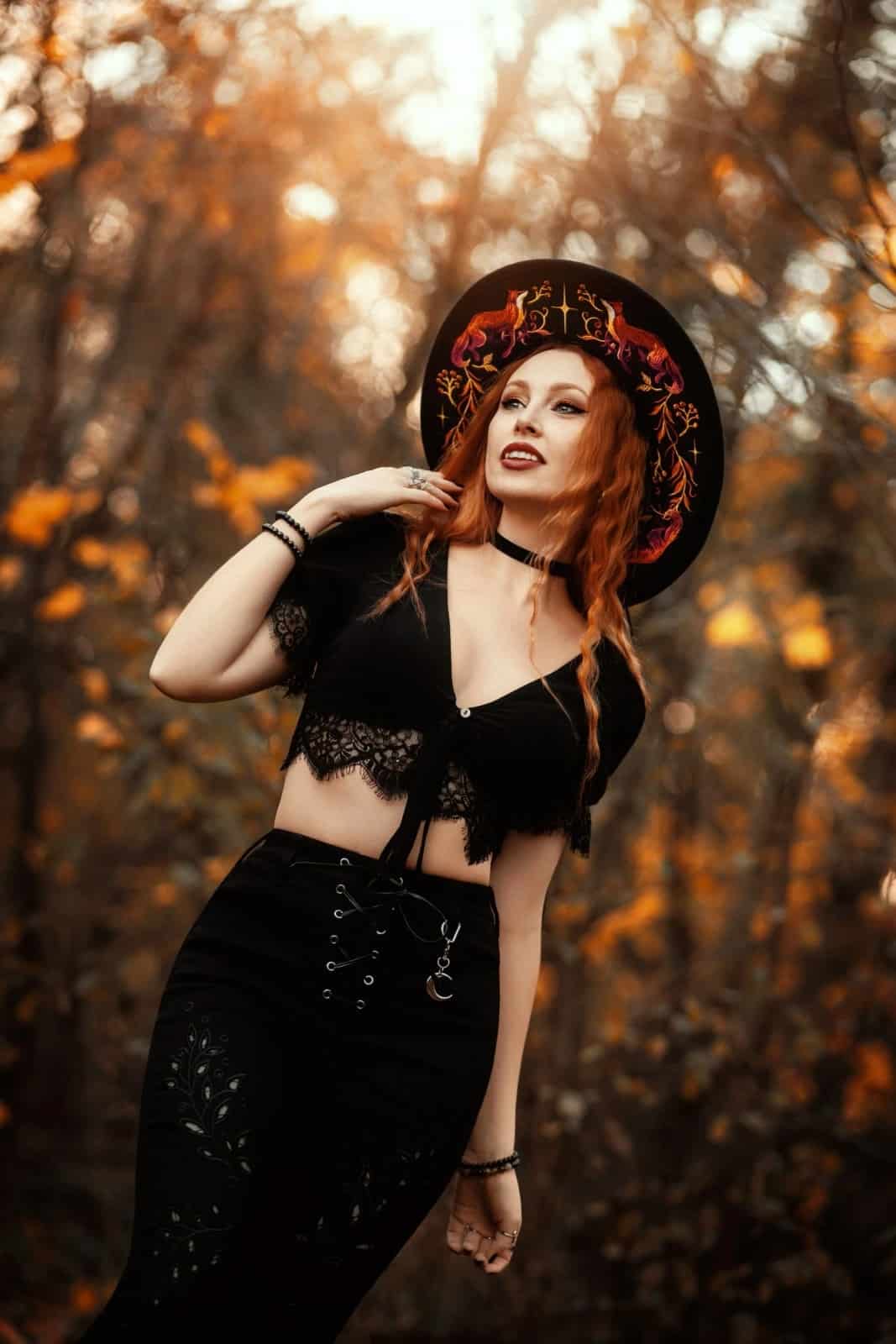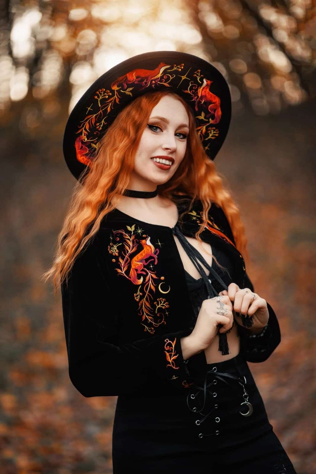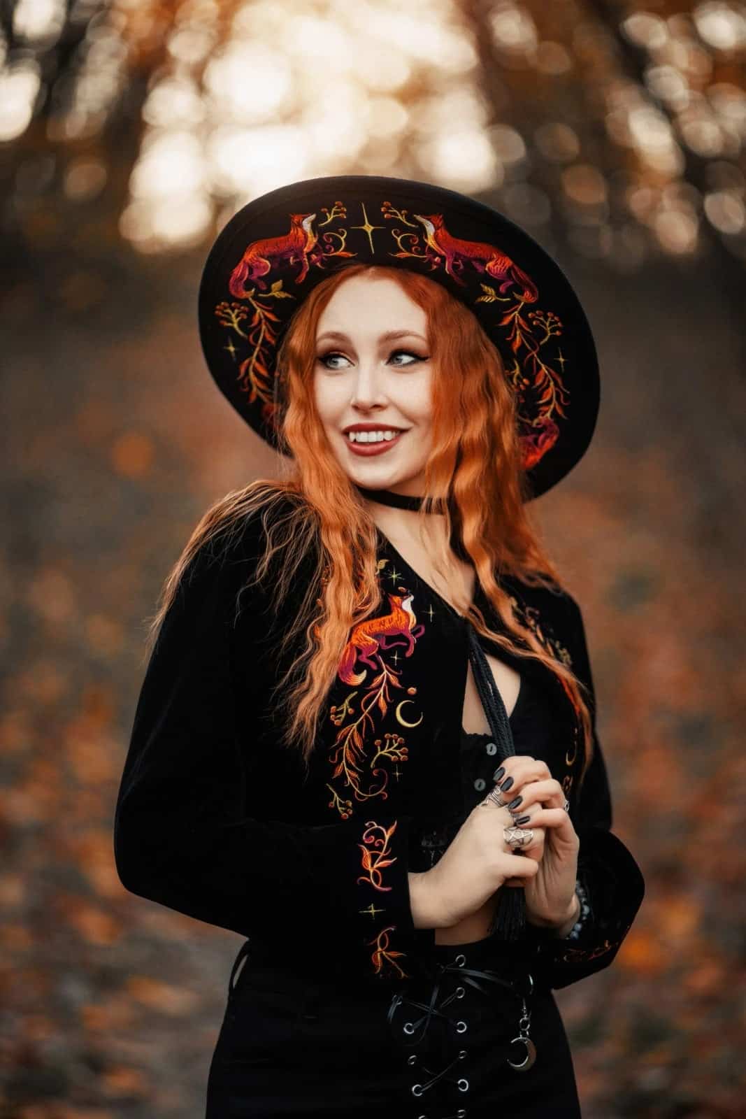 Der EMBERS Hut verbindet feurige Symbolik mit dunkler Eleganz. Auf tiefschwarzem Wollfilz entfalten sich detailreiche Stickereien aus Füchsen und flammenartigen Pflanzenmotiven, die wilde Naturkraft und mystische Ästhetik vereinen. Die breite Krempe, das schwarze Band sowie der geflochtene Rand mit Quasten verleihen dem Hut einen zeremoniellen, statementstarken Charakter – ideal für Witchy, elementare und naturinspirierte Looks.