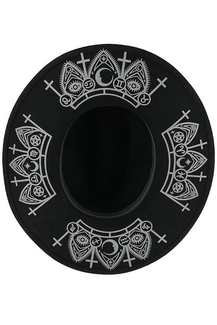 Gothic Hut aus Wollfilz mit 10 cm breiter Krempe, auf der Unterseite mit Kreuzen, Monden und astrologischen Symbolen bedruckt. Ohne Hutband.