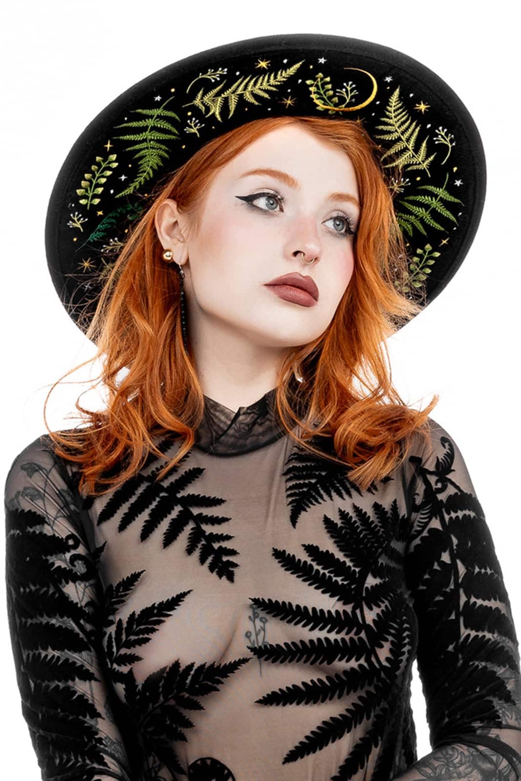Wunderschöner Hut aus Wollfilz. Die 10cm breite Krempe ist mit einem einzigartigen Finish verziert. Üppige, botanische Stickerei aus Farnblättern und verschiedenen Waldpflanzen, durchsetzt mit Halbmonden und Sternen. Warmes Waldgrün und luxuriöses Gold schaffen eine wunderbare visuelle Harmonie, die die Schönheit der Natur widerspiegelt