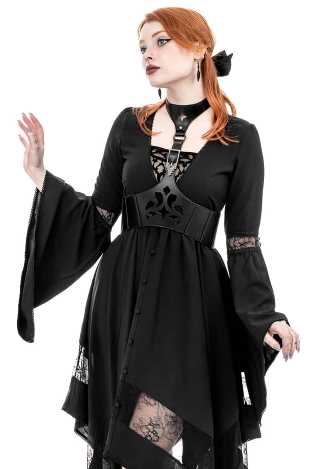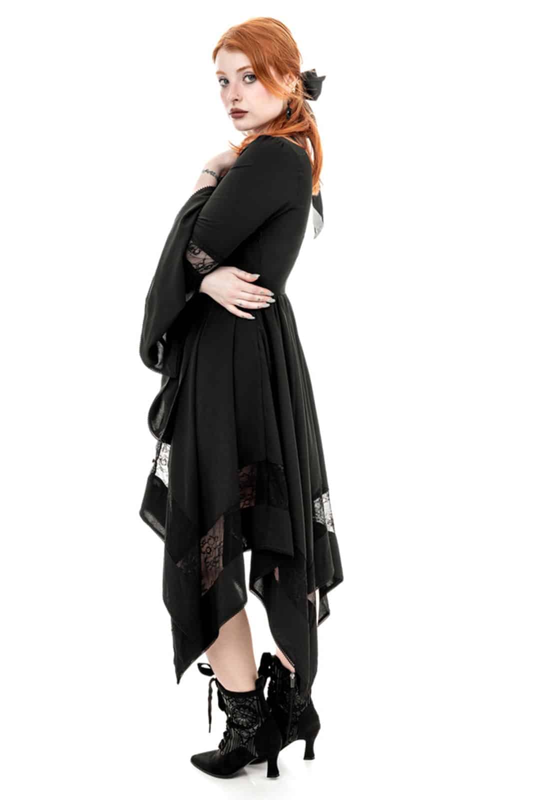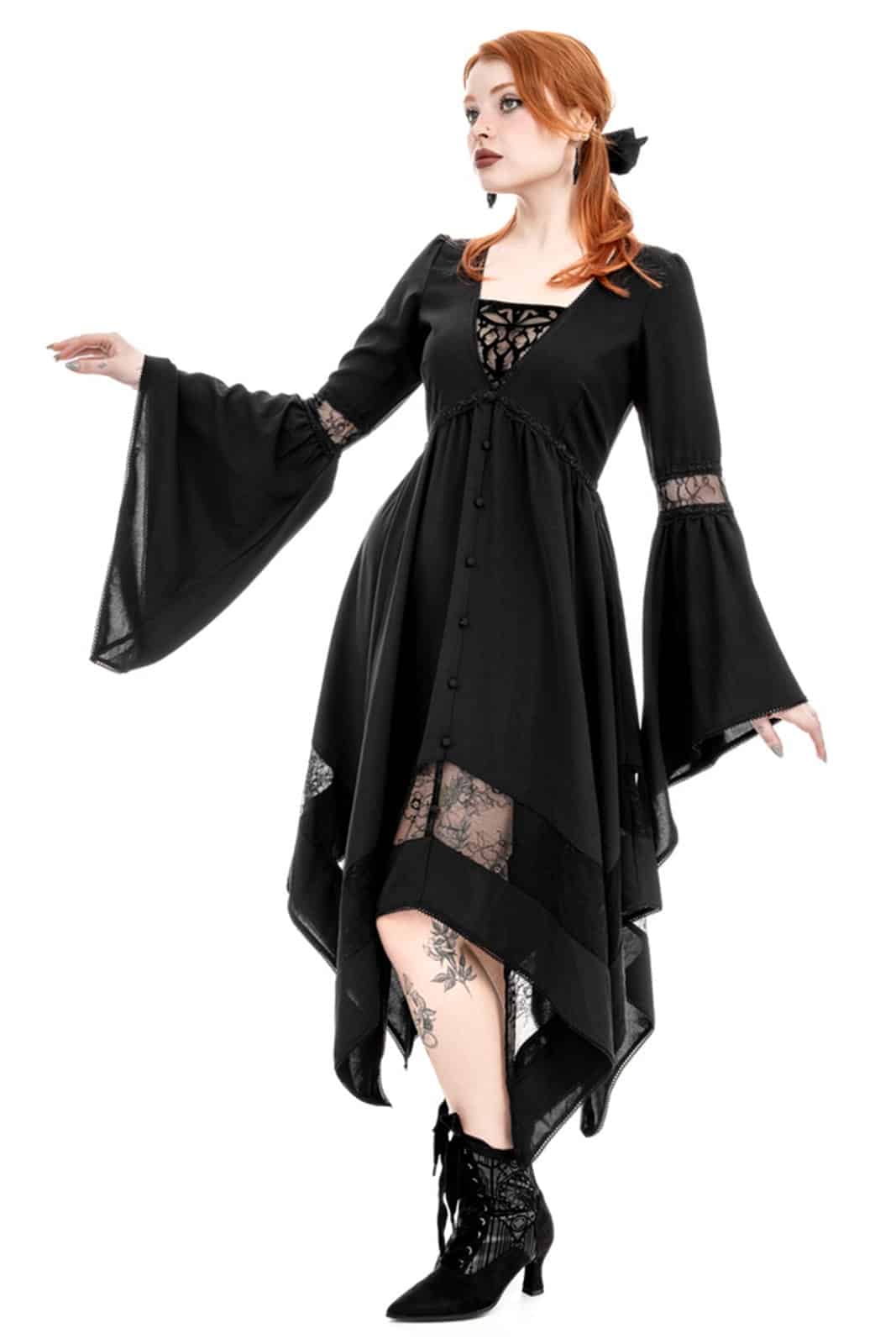 Knielanges Gothickleid mit elegantem V-Ausschnitt und auffälligem Rose-Window-Kathedralen-Flockdruck auf einem Netzeinsatz, der die Brust ziert. Der ausgestellte Midirock in Form eines doppelspitzigen Taschentuchs sorgt für eine subtile Bewegung. Mit verträumten, ausgestellten langen Ärmeln und dekorativen Satinknöpfen. Bestückt mit zarten, femininen Spitzeneinsätzen an den Ärmeln und am unteren Ende des Rocks.