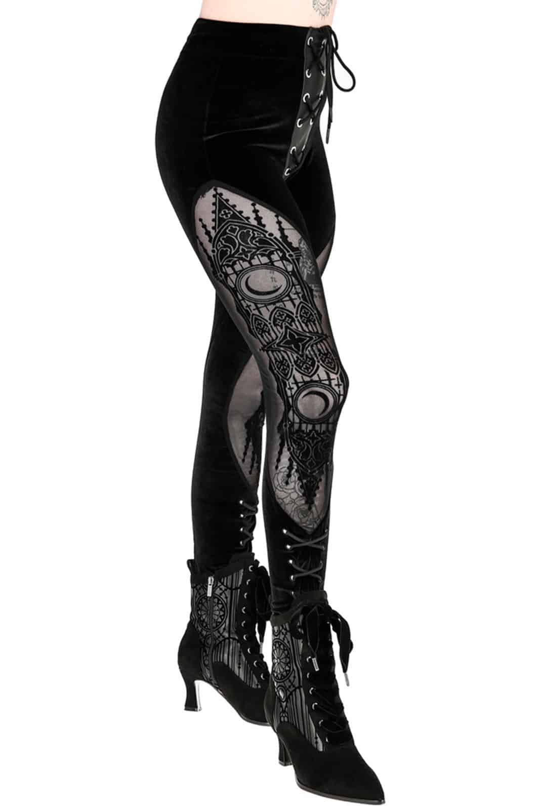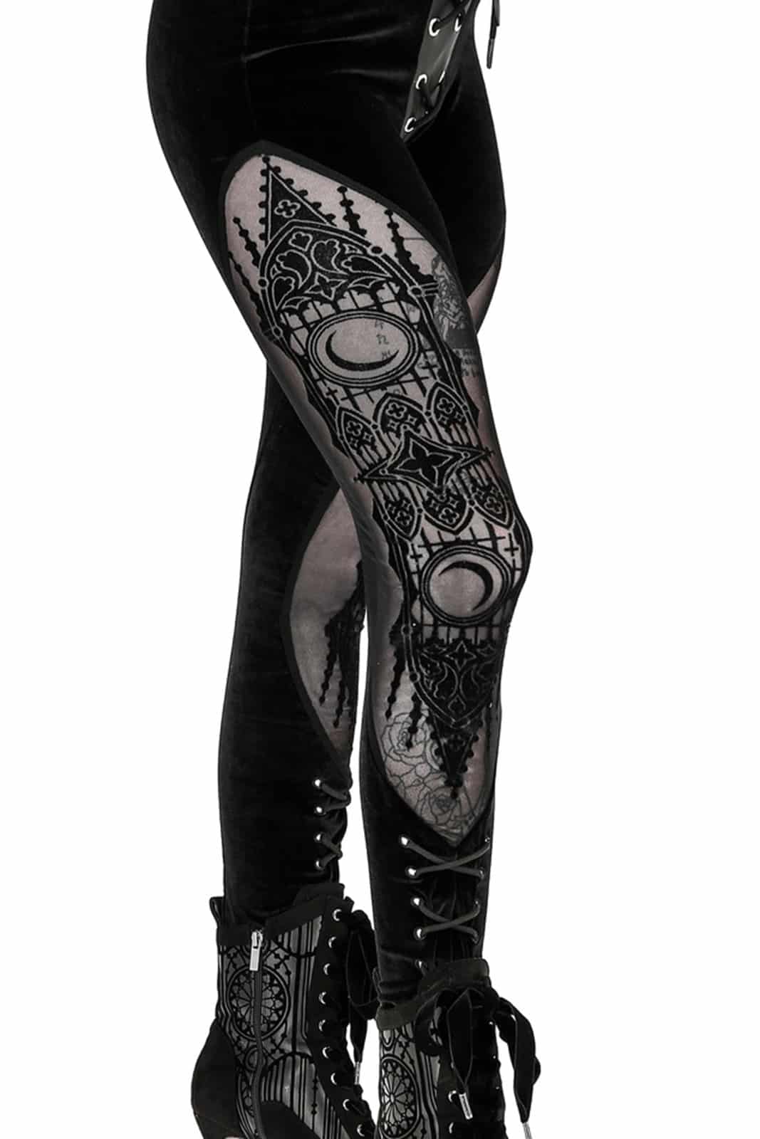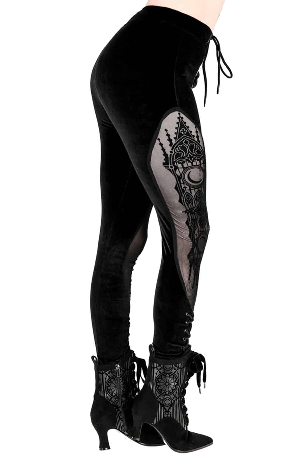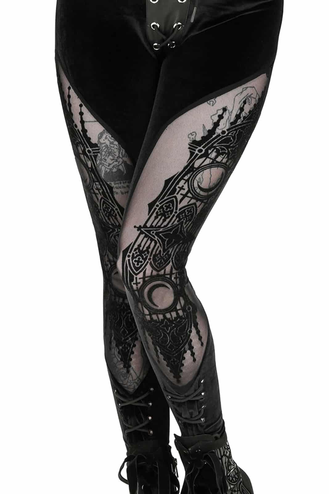 Schwarze Gothic-Leggings aus einer luxuriösen Kombination aus Samt und Mesh. Der tiefschwarze Farbton des Samts sorgt für einen Hauch opulenter Eleganz. Der Stoff ist extrem weich und fühlt sich sehr angenehm an.