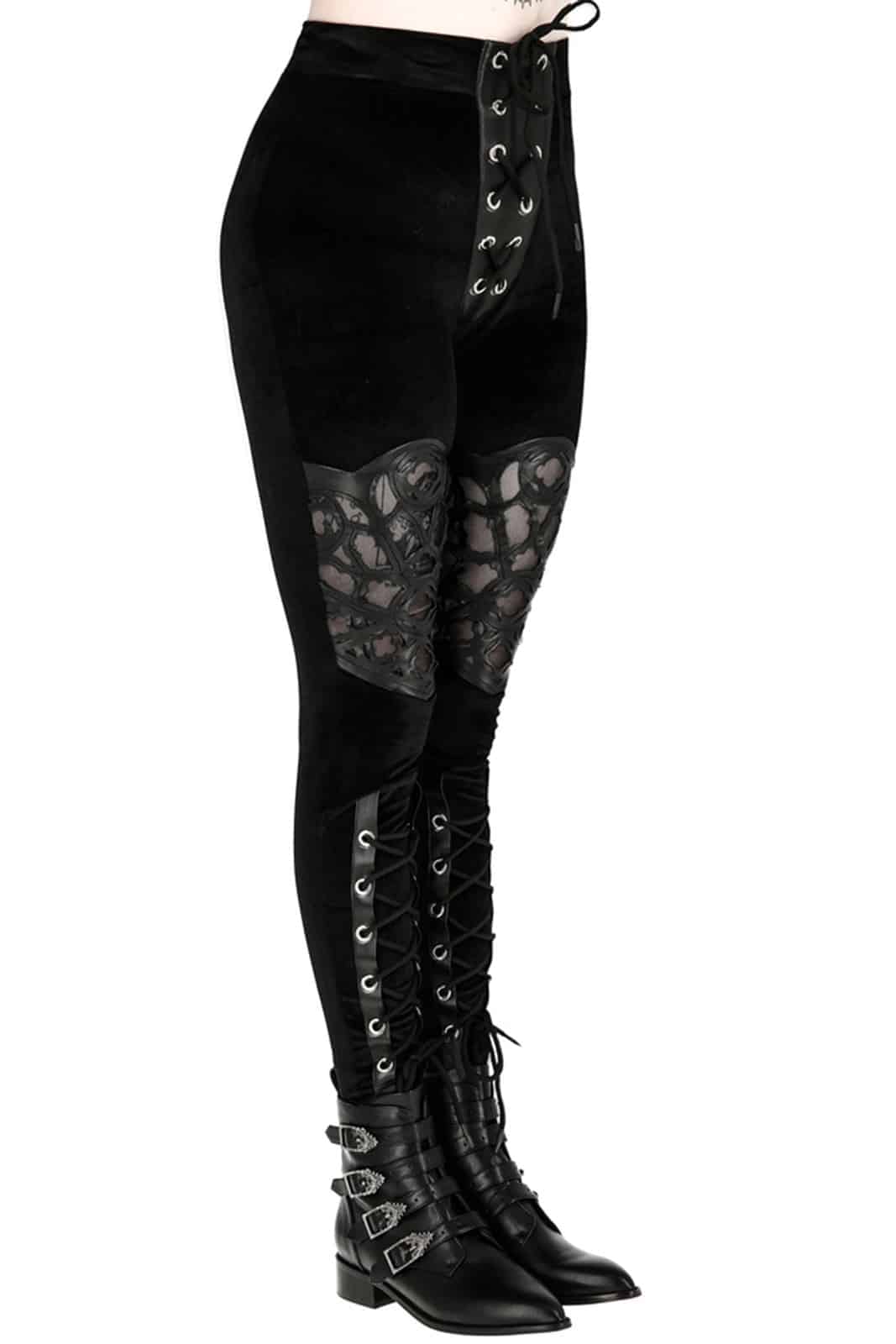 Gothic-Leggings aus luxuriösem Samt in sattem Tiefschwarz mit akribischem Muster der gotischen Rosette, präsentiert durch präzise Laserschnitt-Technologie auf Netzstoff. Die Weichheit des Samts bietet ein haptisches Vergnügen, das Komfort und Stil erhöht.
