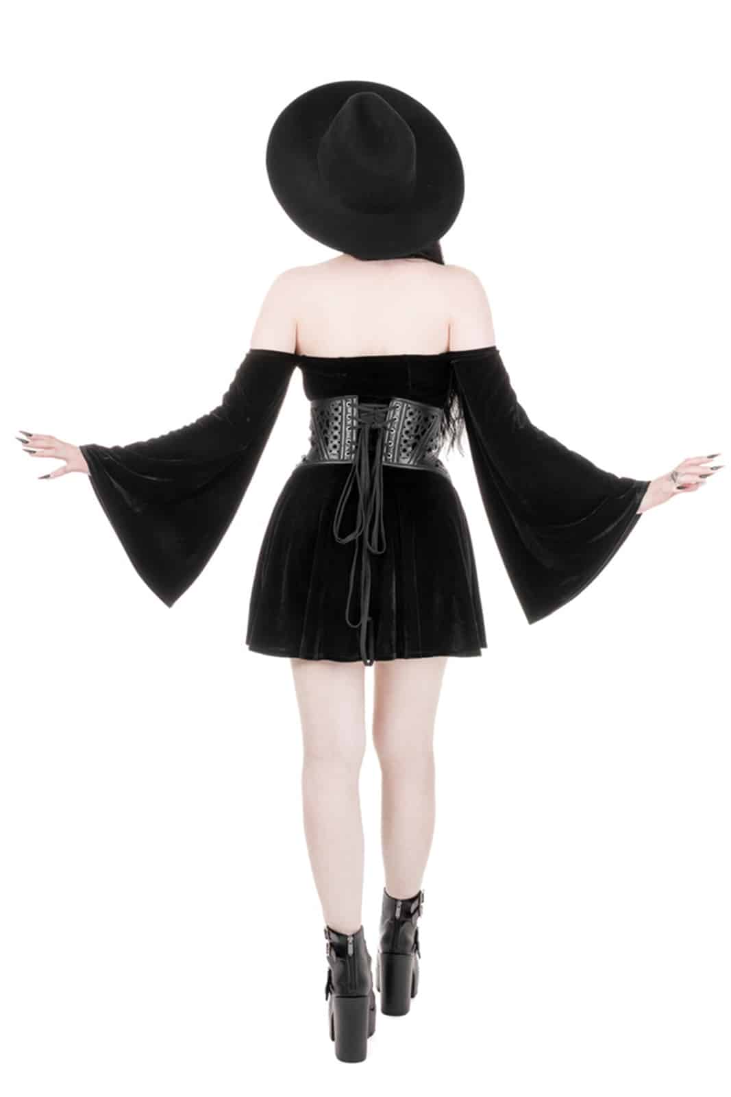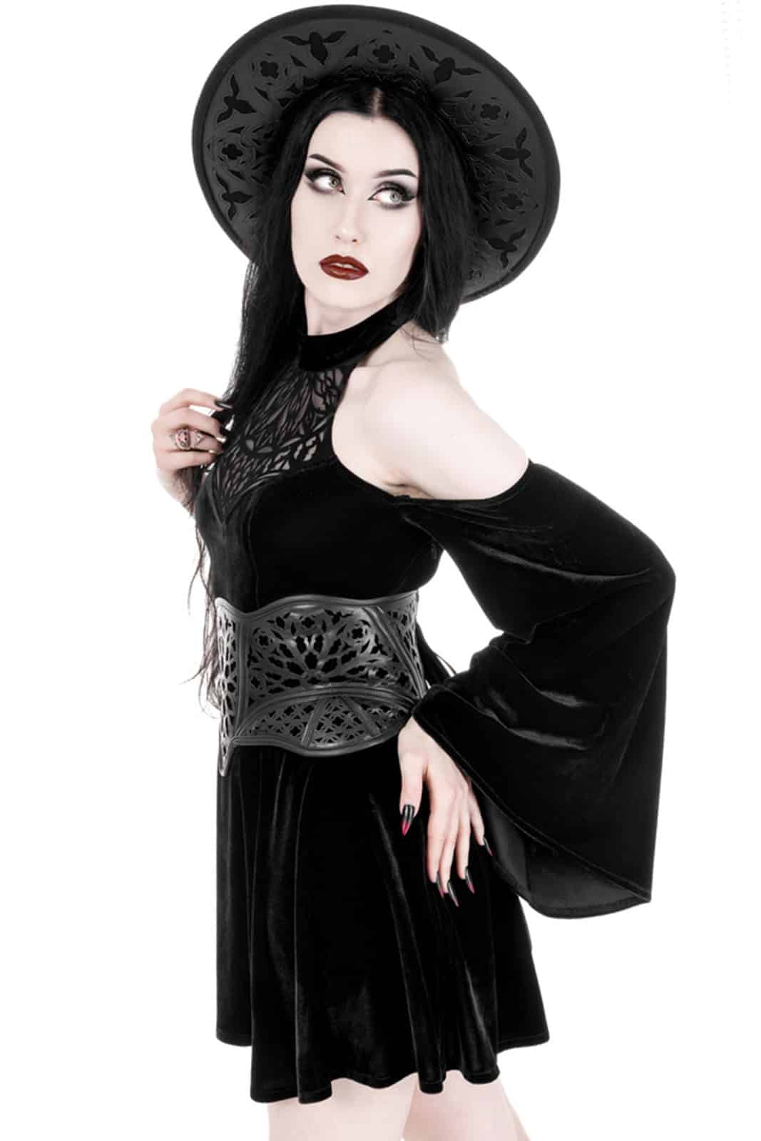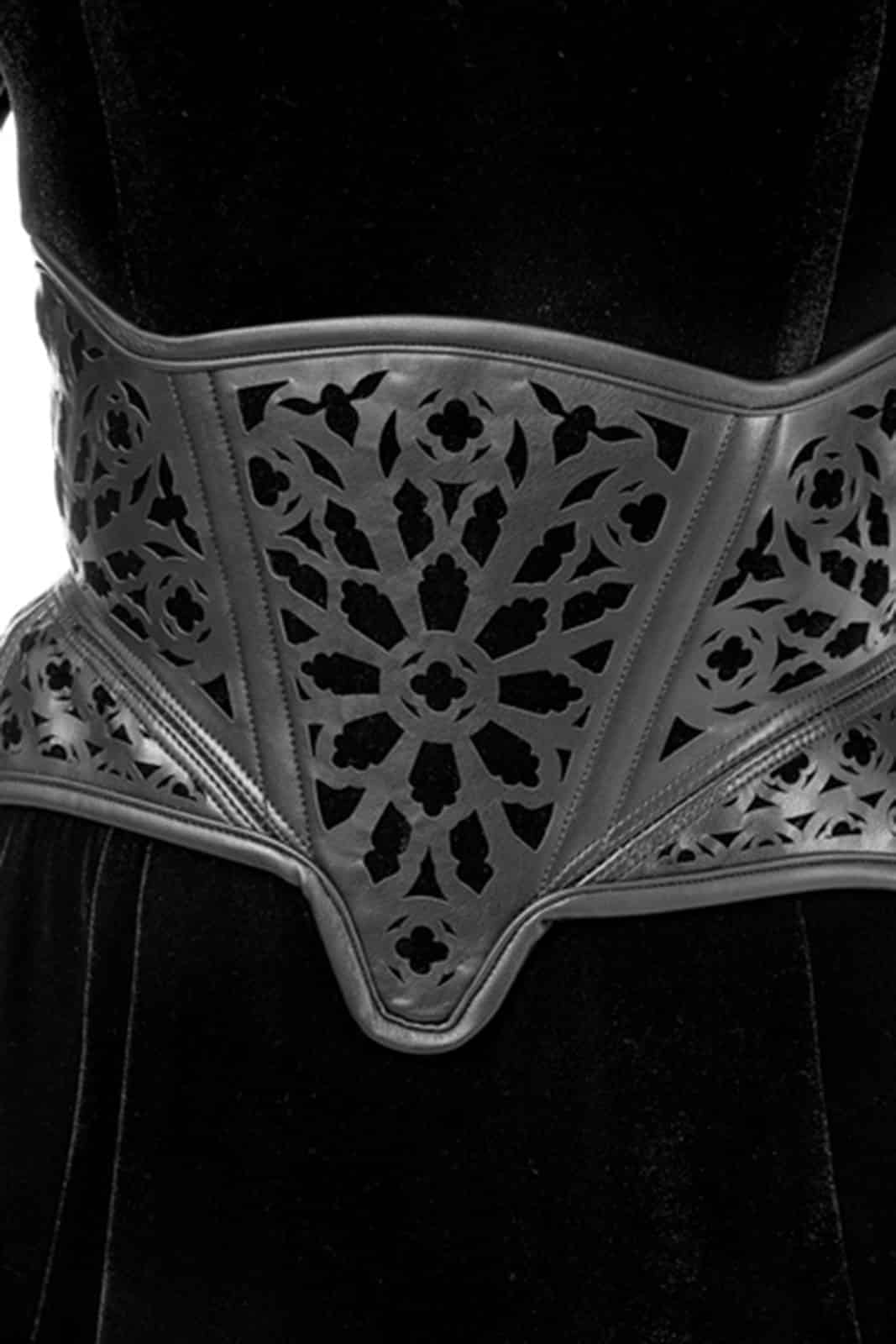 Taillenbetonter Miedergürtel mit Stäbchen für eine perfekte Struktur. Aufwändige lasergeschnittene Details, inspiriert von der gotischen Rose Window-Architektur. Auffällige Textur und Kontrast aus glattem veganem Leder (obere Schicht) und sattem schwarzem Samt (untere Schicht).