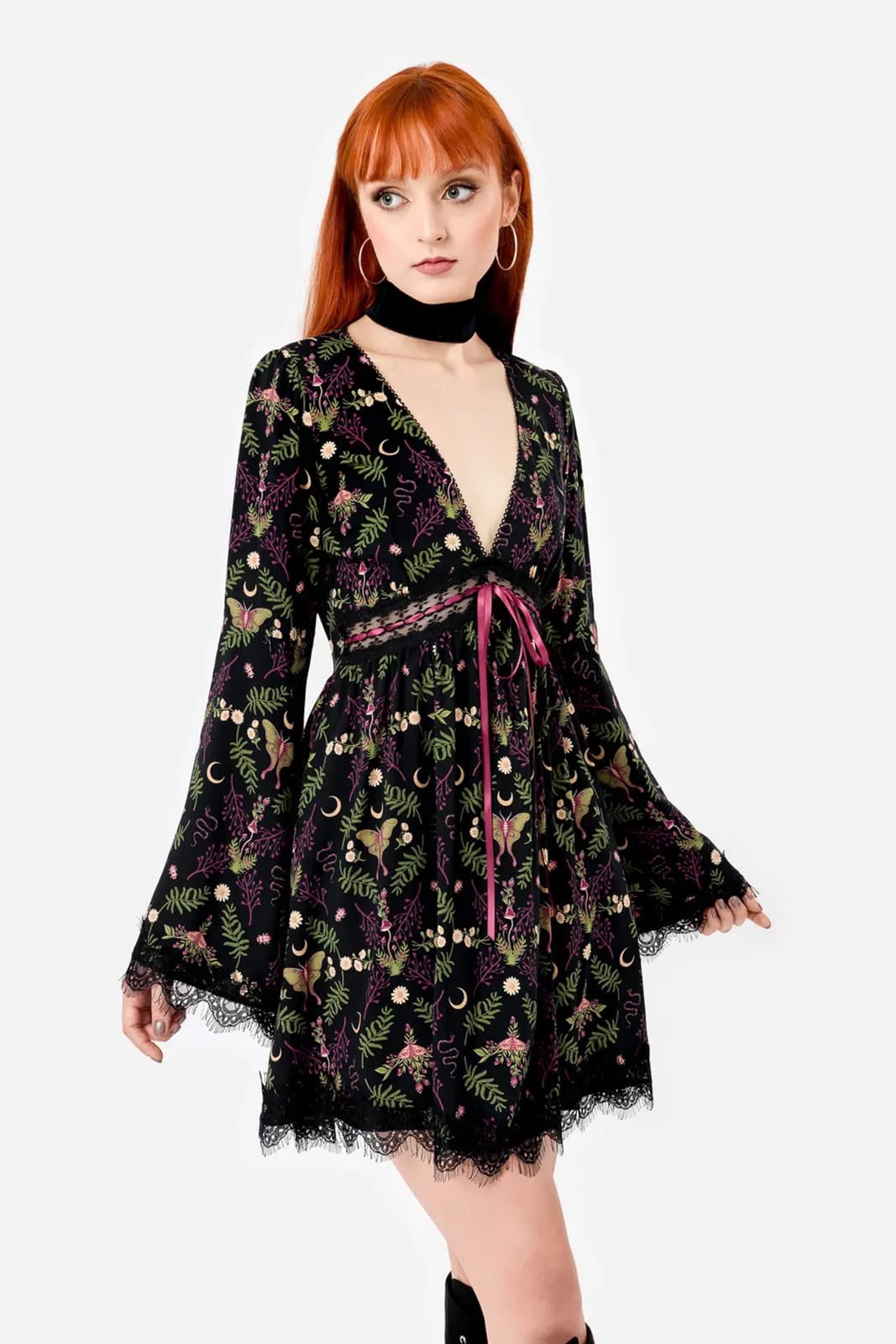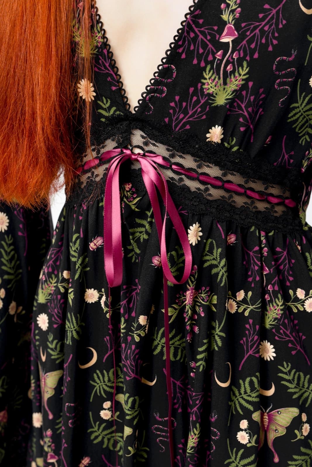 Das Gothic-Kleid in Minilänge wirkt verspielt und doch elegant dank des luftig-flachem Rockteils. Der tiefe V-Ausschnitt ist mit einem zarten Picot-Besatz verziert. Romantische Wimpernspitzenbesätze finden sich an den hexenhaft-ätherischen Ärmeln und am Rocksaum. Das rosa Satinband, in Spitze eingewebt und zu einer Schleife gebunden, harmoniert mit den tiefen Farbtönen des Drucks. Seitlich mit verdecktem Reißverschluß.