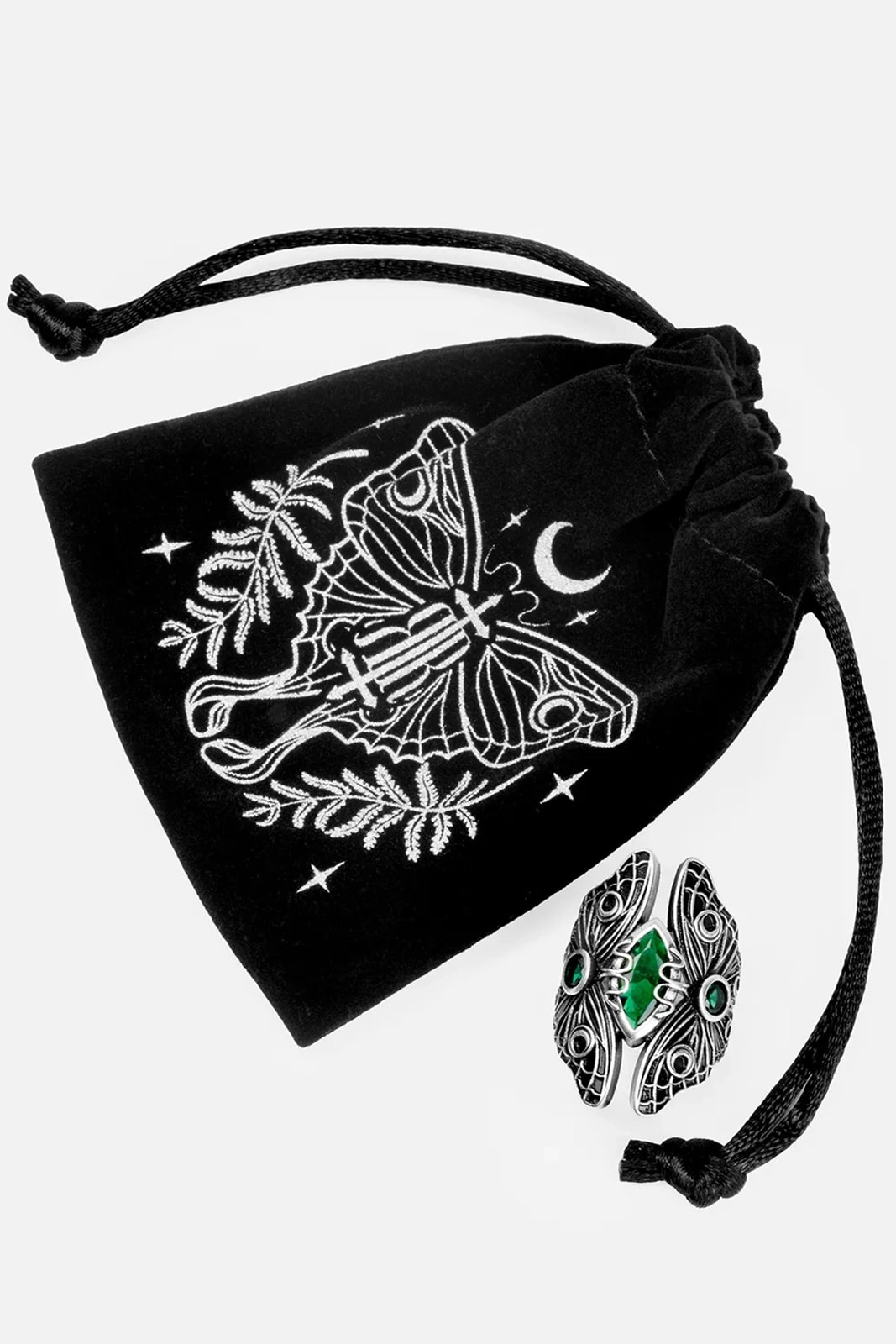 Ein Symbol für zeitloses Wachstum und mystische Schönheit – der Evergreen-Ring ist ein Waldschatz, den Du tragen kannst. Zwei kunstvoll gestaltete Motten flankieren einen facettierten smaragdgrünen Glaskristall in der Mitte. Ihre filigranen Fühler schmiegen sich schützend um den Stein. Halbmonde und kleine Sterne zieren die Ringschiene und verleihen dem Design zusätzlichen Zauber. Perfekt für Liebhaber botanischen Schmucks und magischer Motten-Accessoires – ein dezentes Statement für Feen-Seelen und alle, die symbolträchtigen Naturschmuck lieben.