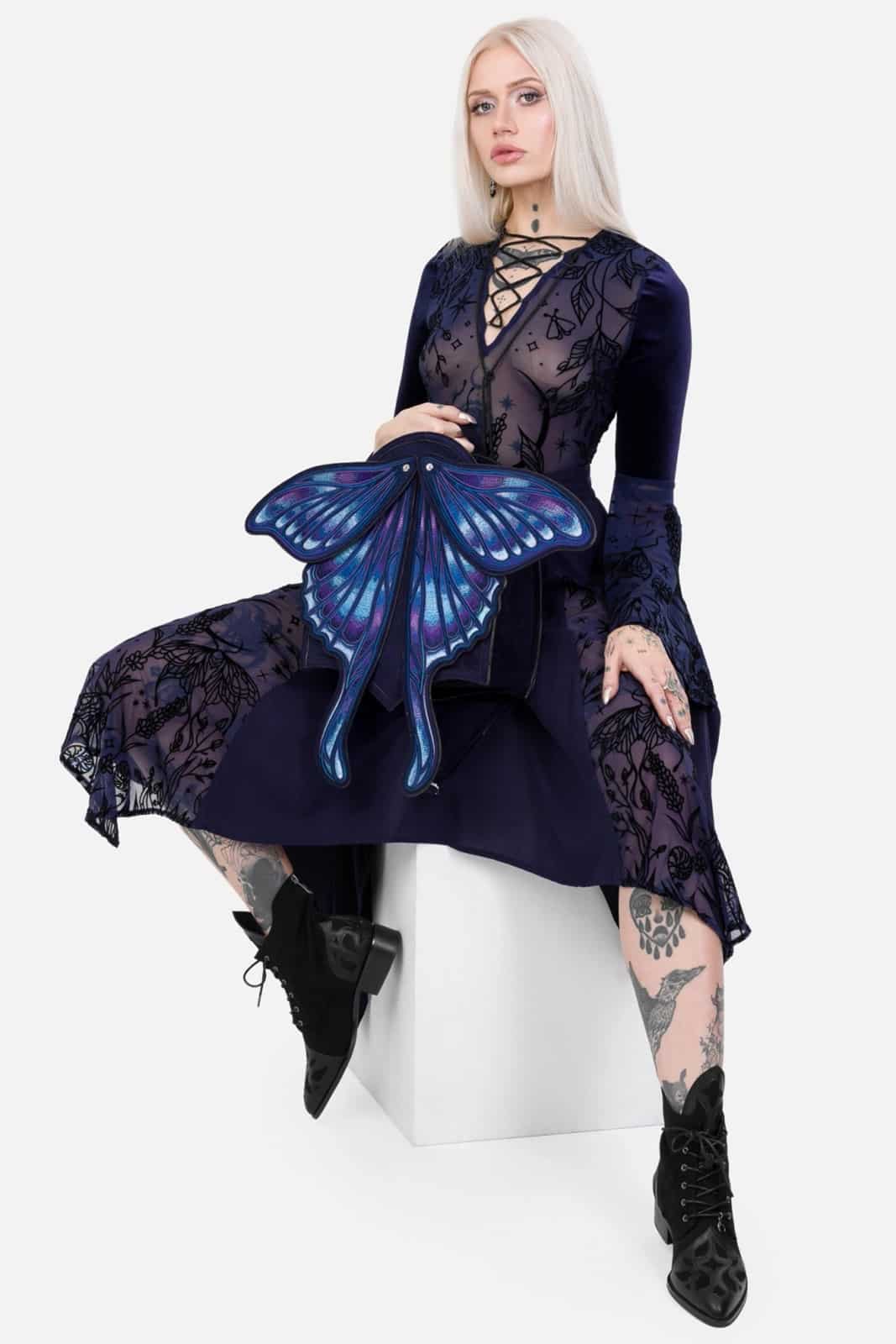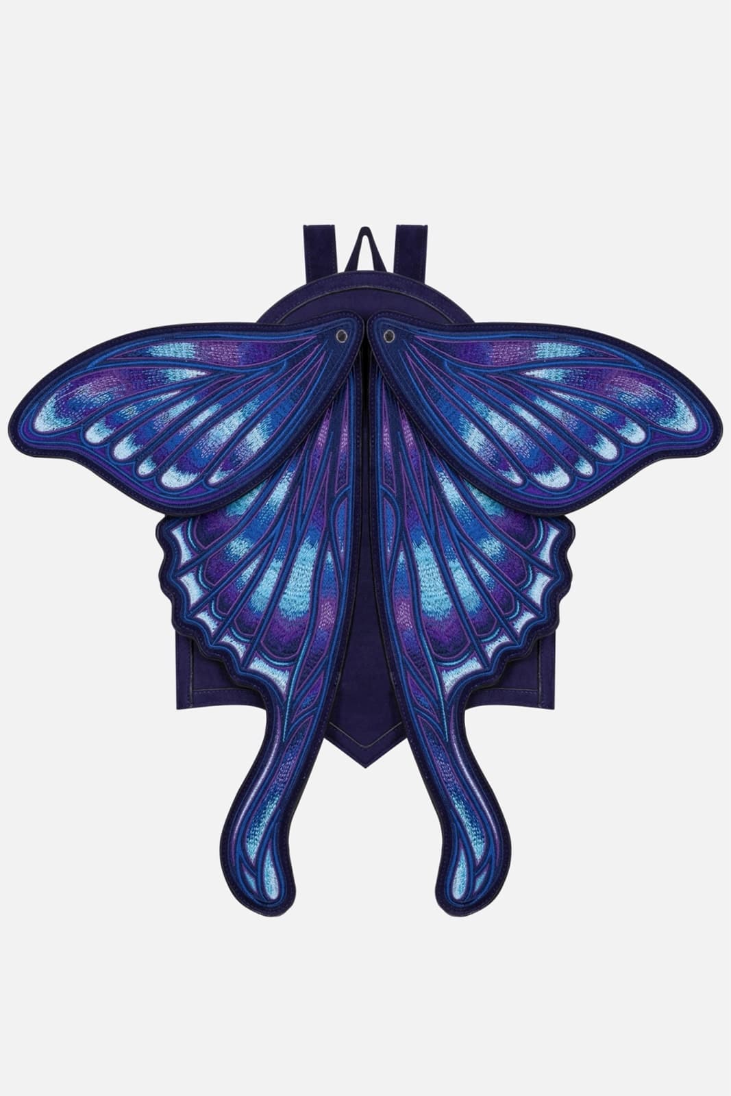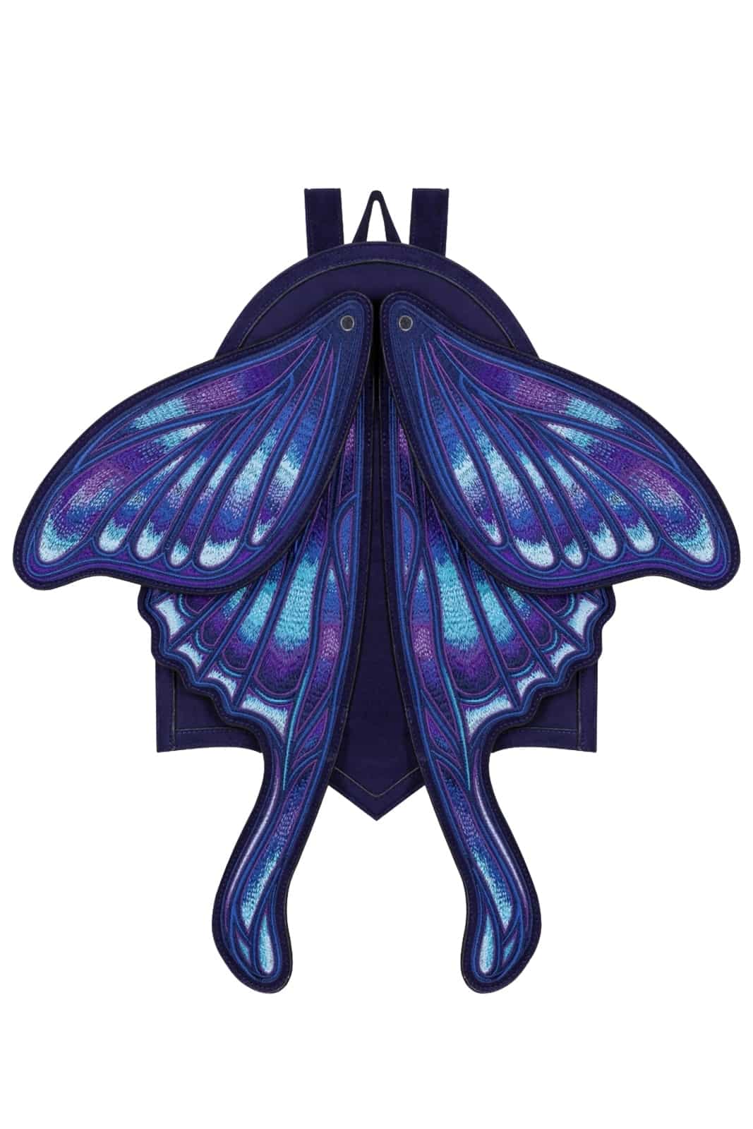 Ein realistischer, strukturierter Motten-Rucksack im tiefen Midnight Blue, der wie ein lebendiges Wesen aus der Nacht wirkt. Die aufwendig gearbeiteten 3D-Flügel sind vollständig bestickt und schimmern in facettenreichen Blau-, Türkis- und Violetttönen, die je nach Lichteinfall ihre Wirkung verändern. Dieser außergewöhnliche Fantasy-Rucksack verbindet kunstvolle Handwerksoptik mit tragbarer Funktionalität und wird zum magischen Blickfang für Festivals, Alltag oder besondere Looks.