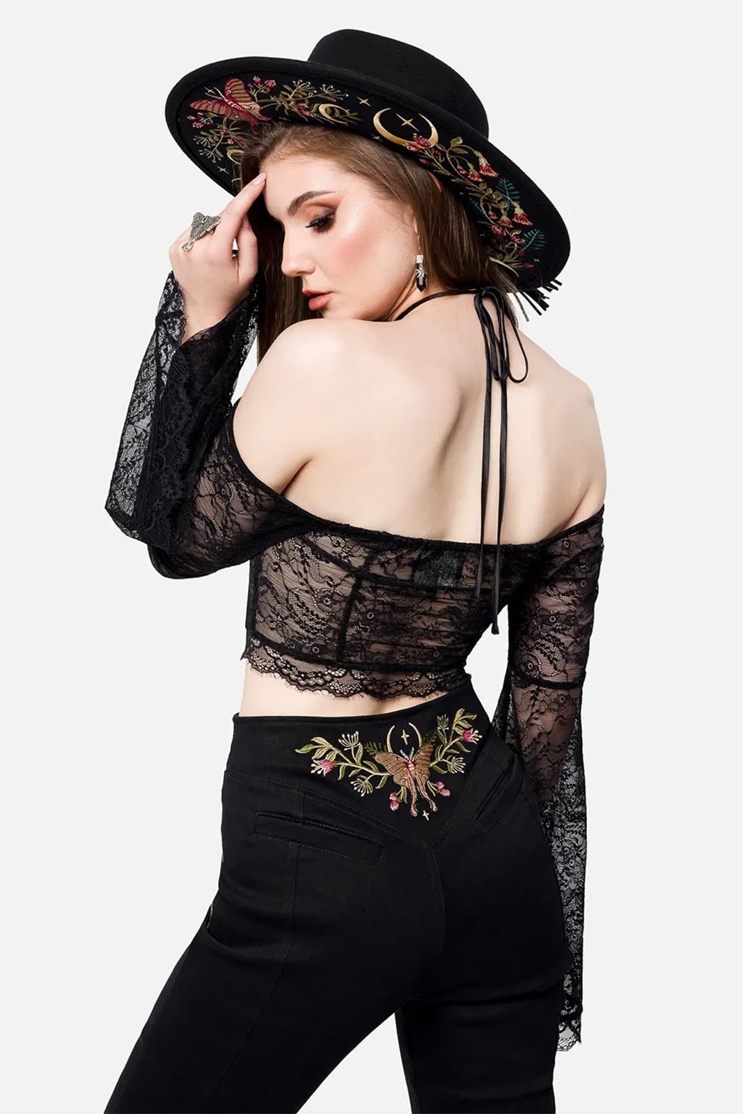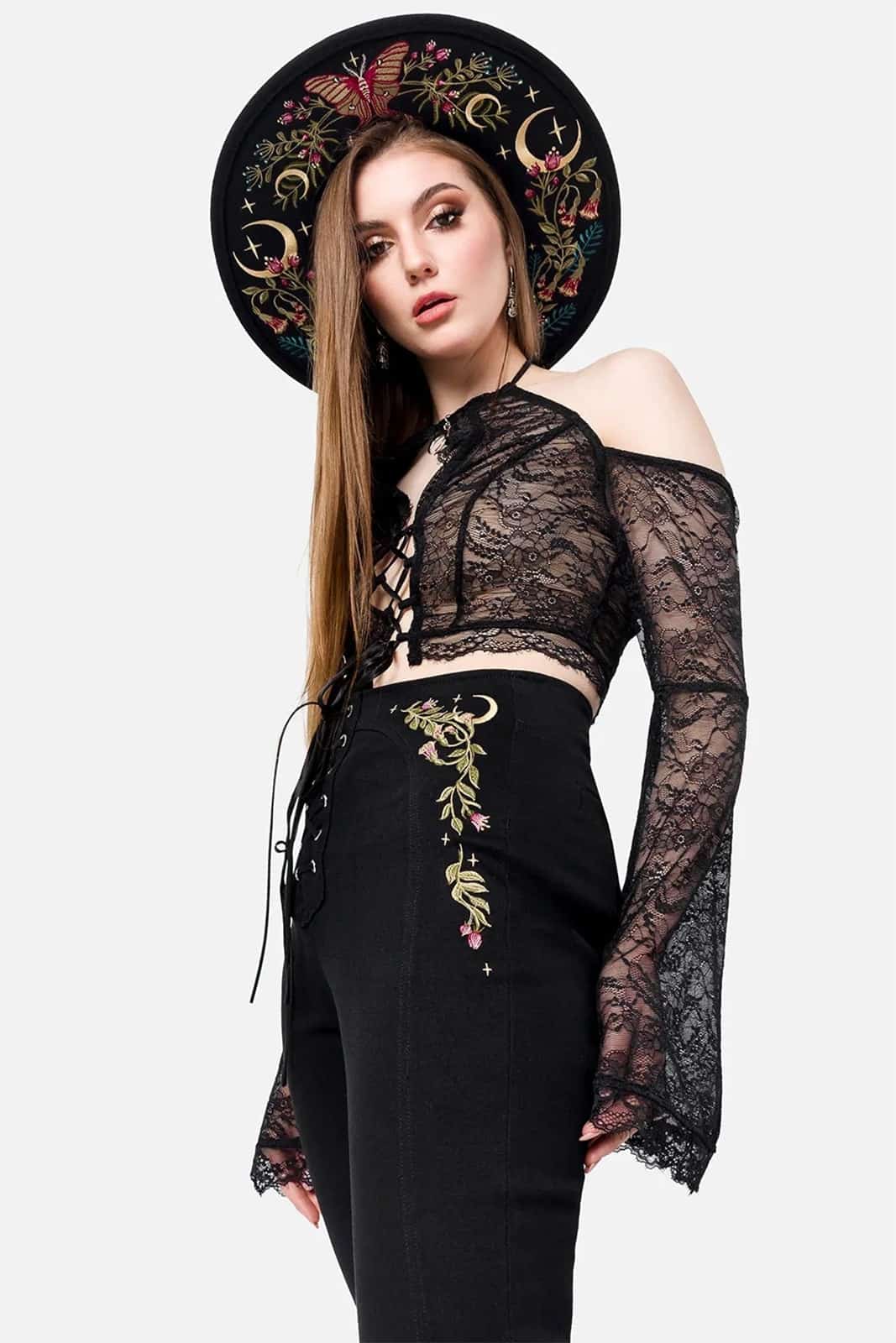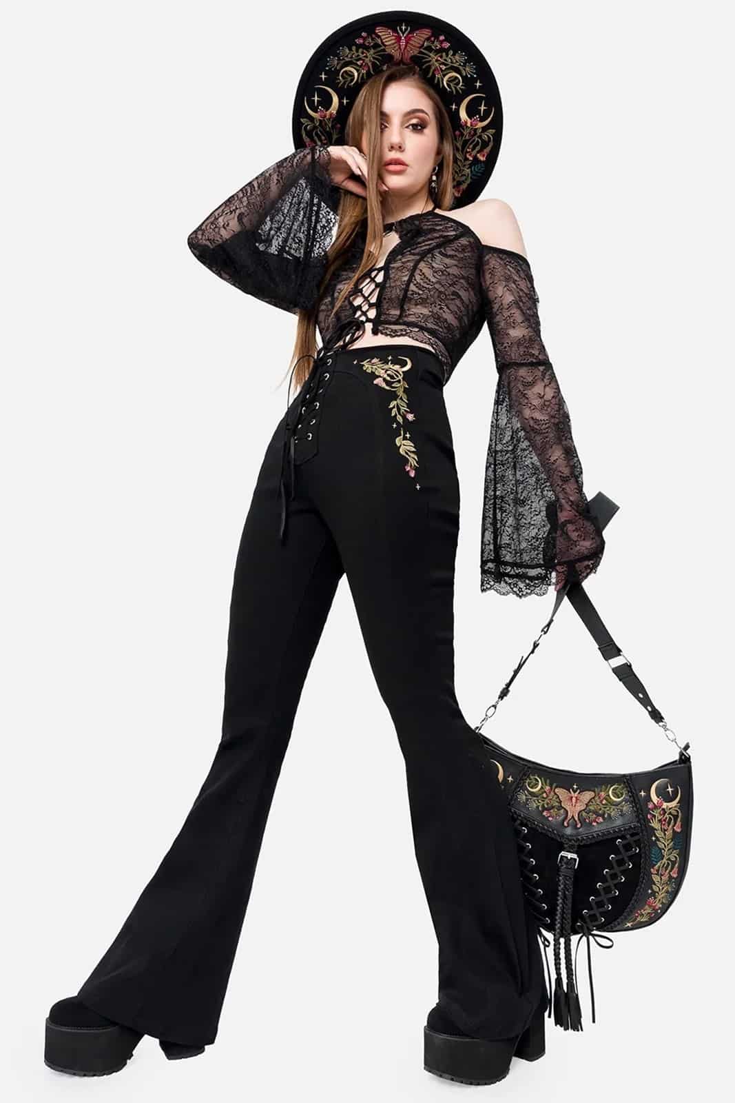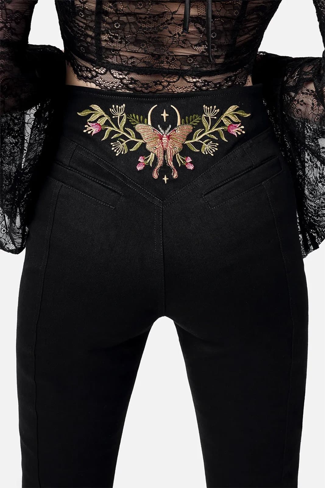 Diese Schlaghose verbindet Vintage-Flair mit mystischem Charme. Gefertigt aus weichem, elastischem Denim, zeigt sie eine aufwendige Stickerei aus Motten und floralen Elementen an Hüfte und Rückenpasse – inspiriert von der Magie wilder Gärten. Die hohe Taille mit Schnürdetail vorn und figurbetonte Nähte formen eine schmeichelhafte Silhouette, während die ausgestellten Beine einen Hauch 70s-Romantik verleihen. Perfekt für Hexen, Tagträumerinnen und alle, die sich zwischen Wald und Mond zuhause fühlen.