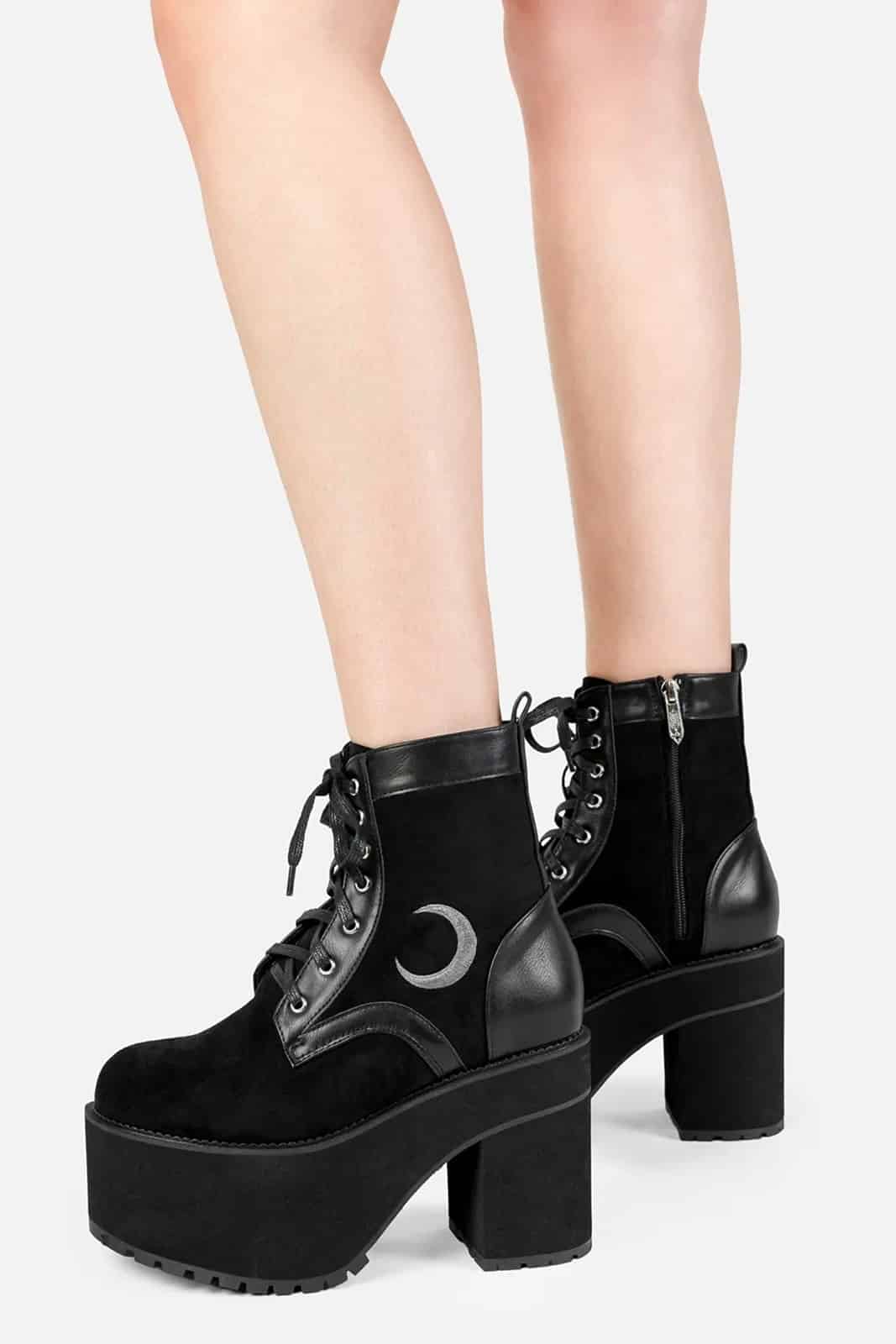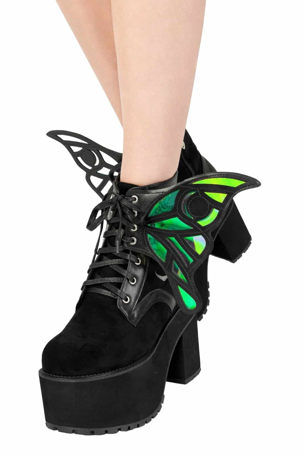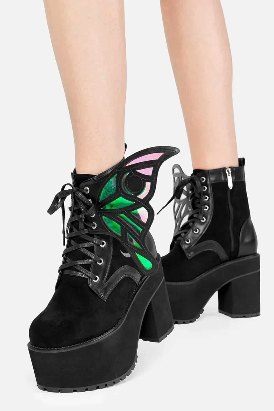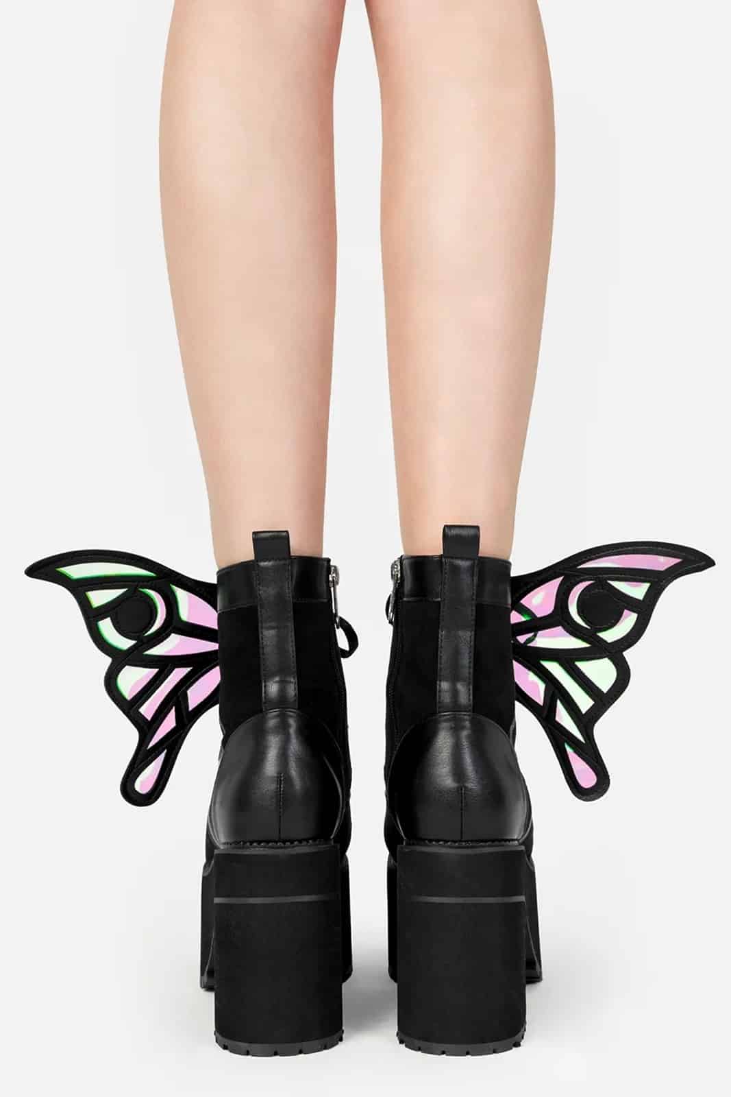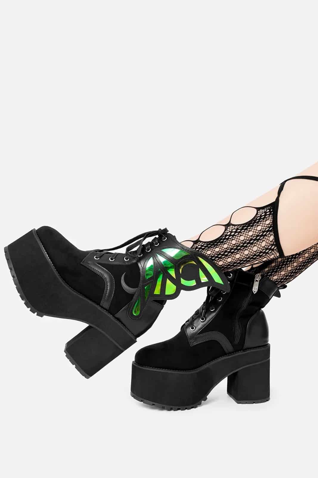 Die Nocturne Winged Boots sind ein wahrgeordener Traum für alle, die sich zwischen den Welten bewegen. Diese schwarzen Gothic-Stiefeletten vereinen weiches Kunstvelours mit kontrastierenden PU-Ledereinsätzen und verleihen deinem Look eine übernatürliche Note. Das Highlight: abnehmbare, dreidimensionale Mottenflügel mit holografischem Schimmer in Grün und Rosa. Ob als extravagantes Statement am Tag oder als mystischer Blickfang bei Nacht – diese Boots sorgen für Aufsehen.