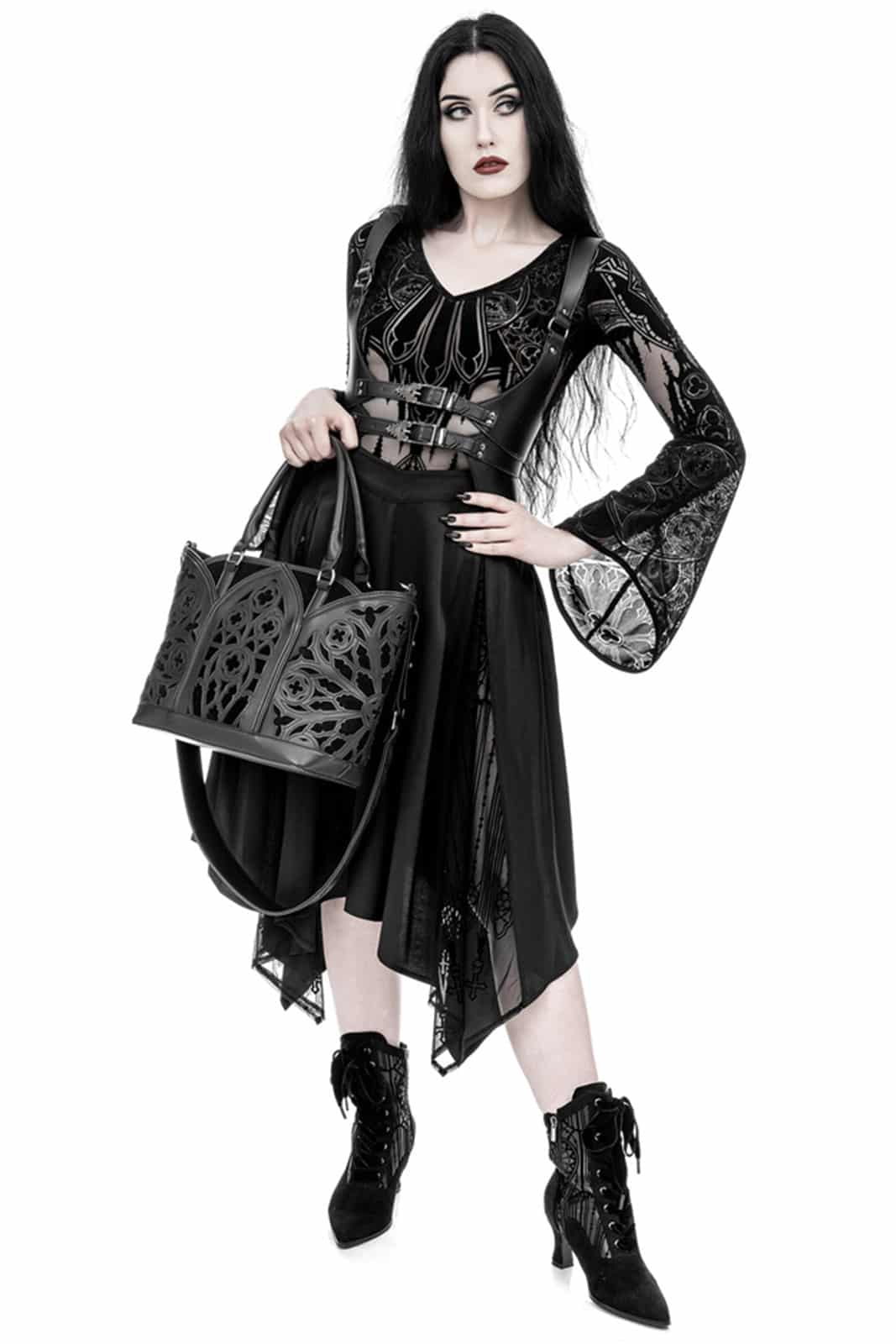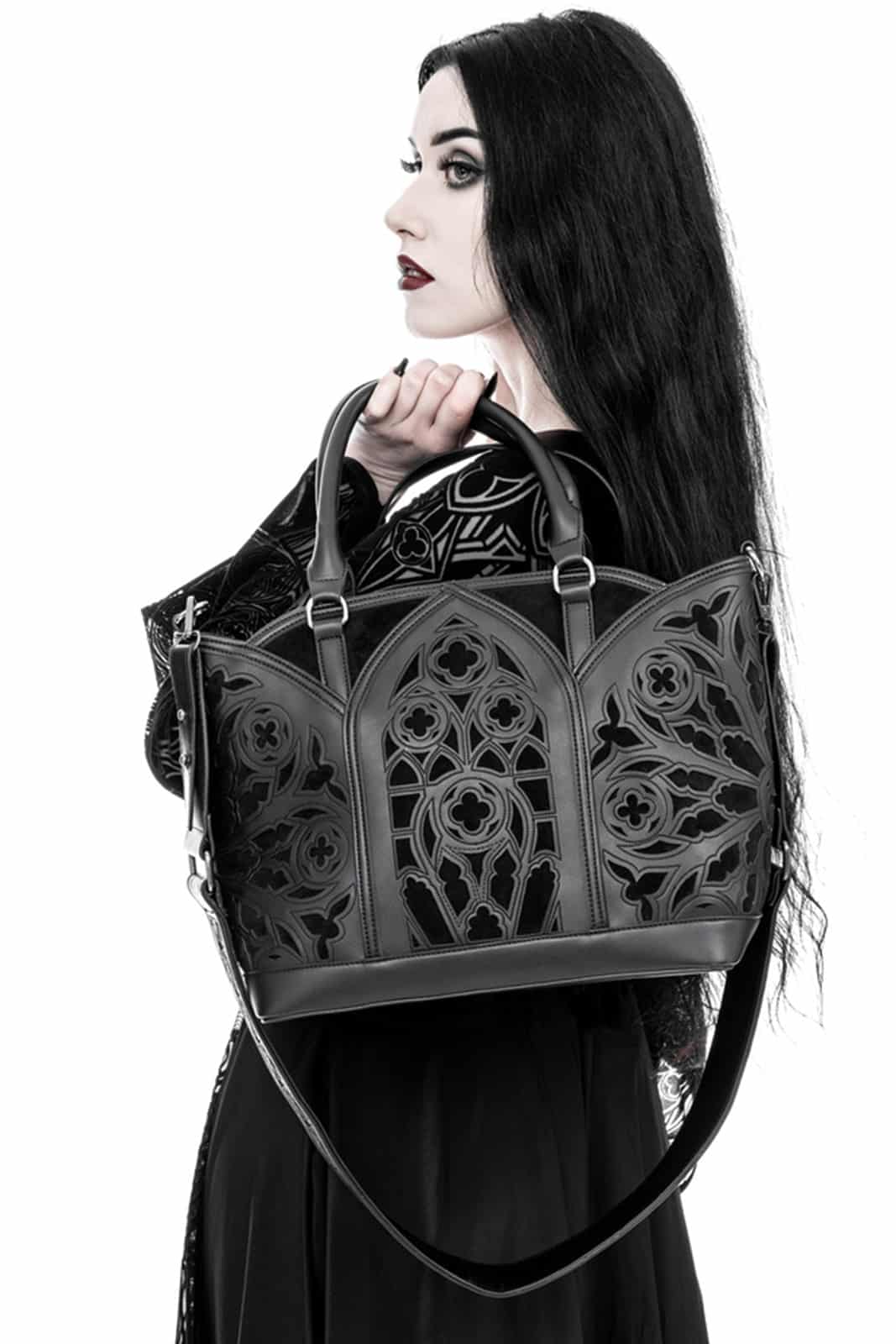 Diese schwarze Gothic-Shopper-Tasche ist ein Meisterwerk der Konstruktion! Mit ihren Bögen und rosettenartigen Verzierungen erinnert sie an die Pracht einer gotischen Kathedrale. Ihre Form und Muster spiegeln die ikonischen architektonischen Elemente wider und bieten ein zeitloses Accessoire für alle Liebhaber des Gothic-Stils.