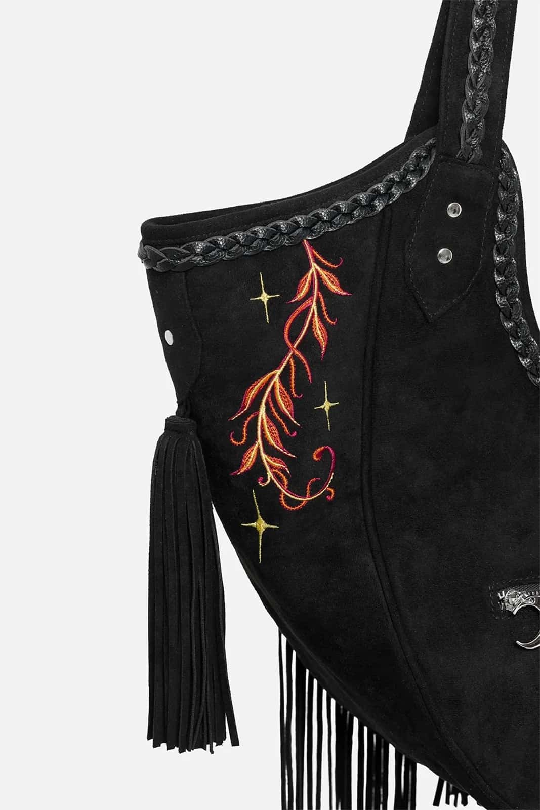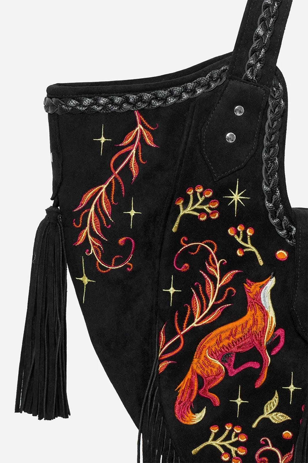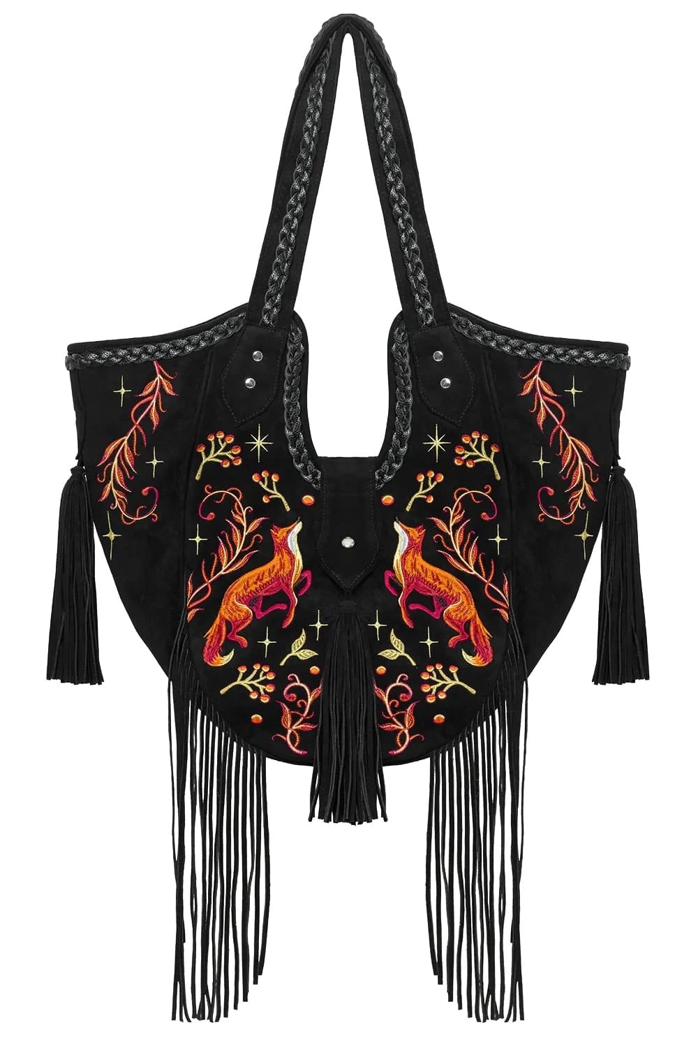 Wo der Fuchs im tiefschwarzen Waldschein tanzt: Die Fox Meadows Tasche verbindet weiches Kunstwildleder, feurig leuchtende Stickereien und lange Fransen zu einem ausdrucksstarken Stück Naturmagie. Die beiden Füchse, umgeben von Mondsichel, Sternen, Blättern und Beeren, wirken wie lebendige Funken eines nächtlichen Feuers und verleihen der Tasche eine besondere, wildromantische Ausstrahlung. Ein idealer Begleiter für Alltag, Arbeit oder Wochenendabenteuer – für alle, die einen Hauch mystischer Waldenergie bei sich tragen möchten.
