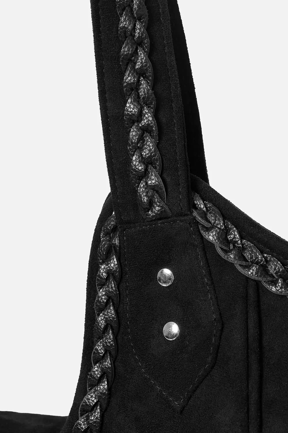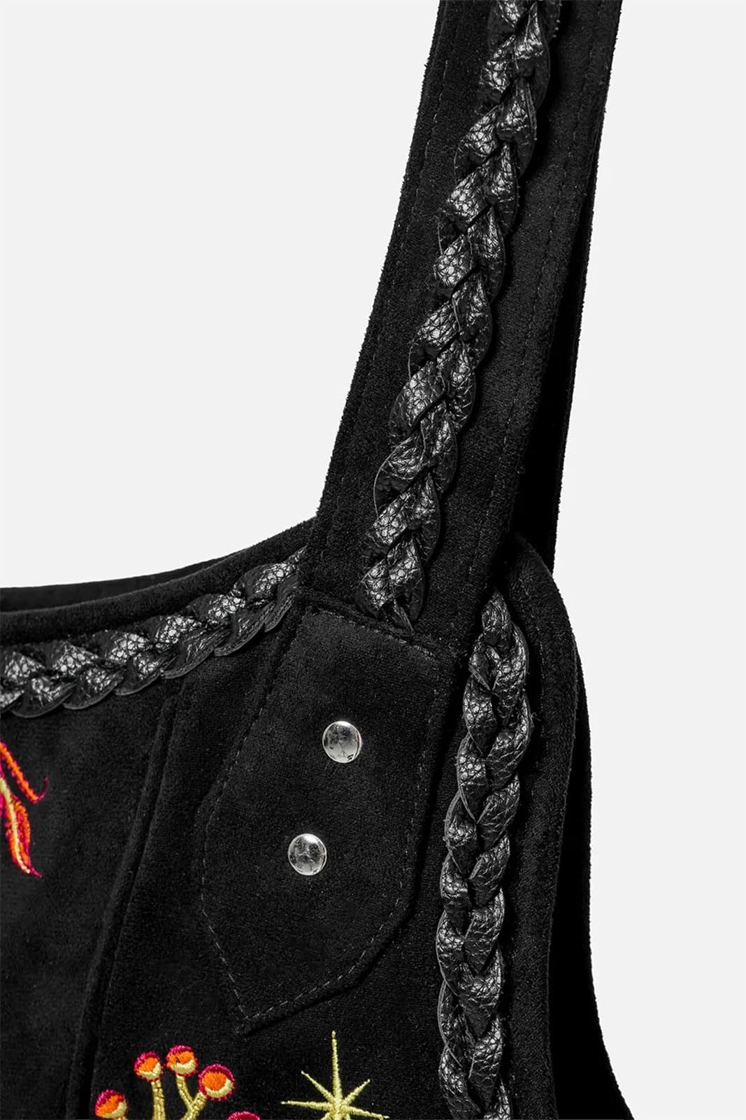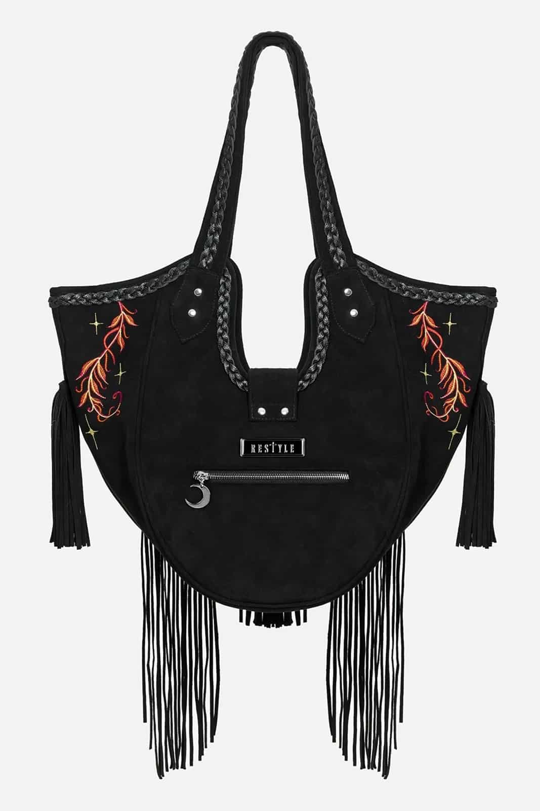 Wo der Fuchs im tiefschwarzen Waldschein tanzt: Die Fox Meadows Tasche verbindet weiches Kunstwildleder, feurig leuchtende Stickereien und lange Fransen zu einem ausdrucksstarken Stück Naturmagie. Die beiden Füchse, umgeben von Mondsichel, Sternen, Blättern und Beeren, wirken wie lebendige Funken eines nächtlichen Feuers und verleihen der Tasche eine besondere, wildromantische Ausstrahlung. Ein idealer Begleiter für Alltag, Arbeit oder Wochenendabenteuer – für alle, die einen Hauch mystischer Waldenergie bei sich tragen möchten.