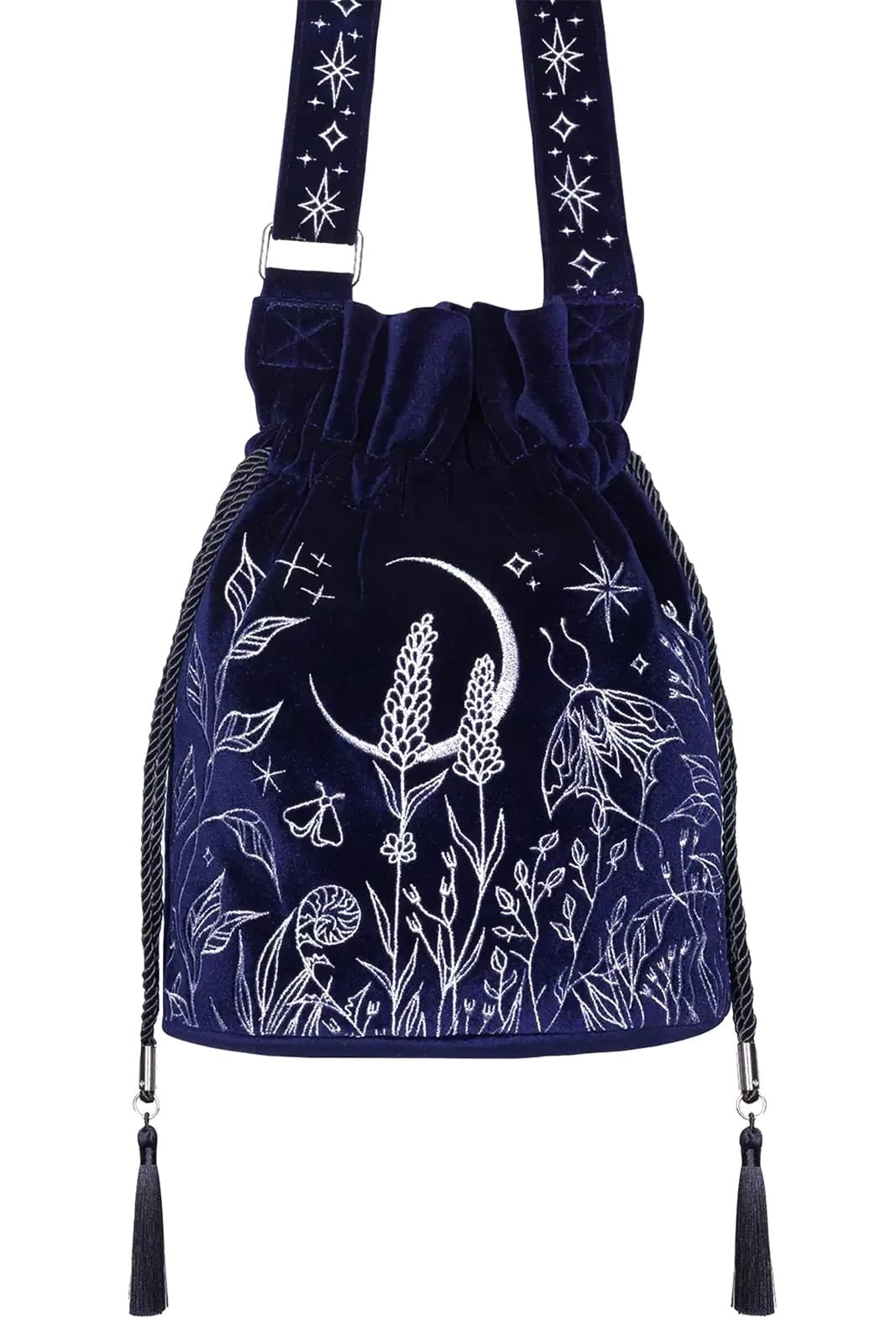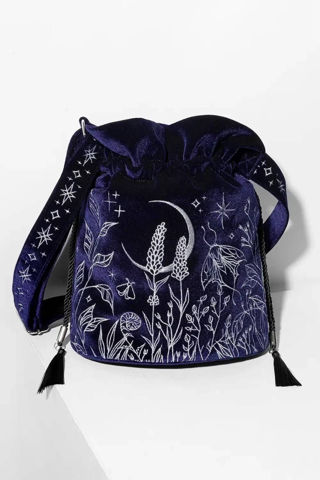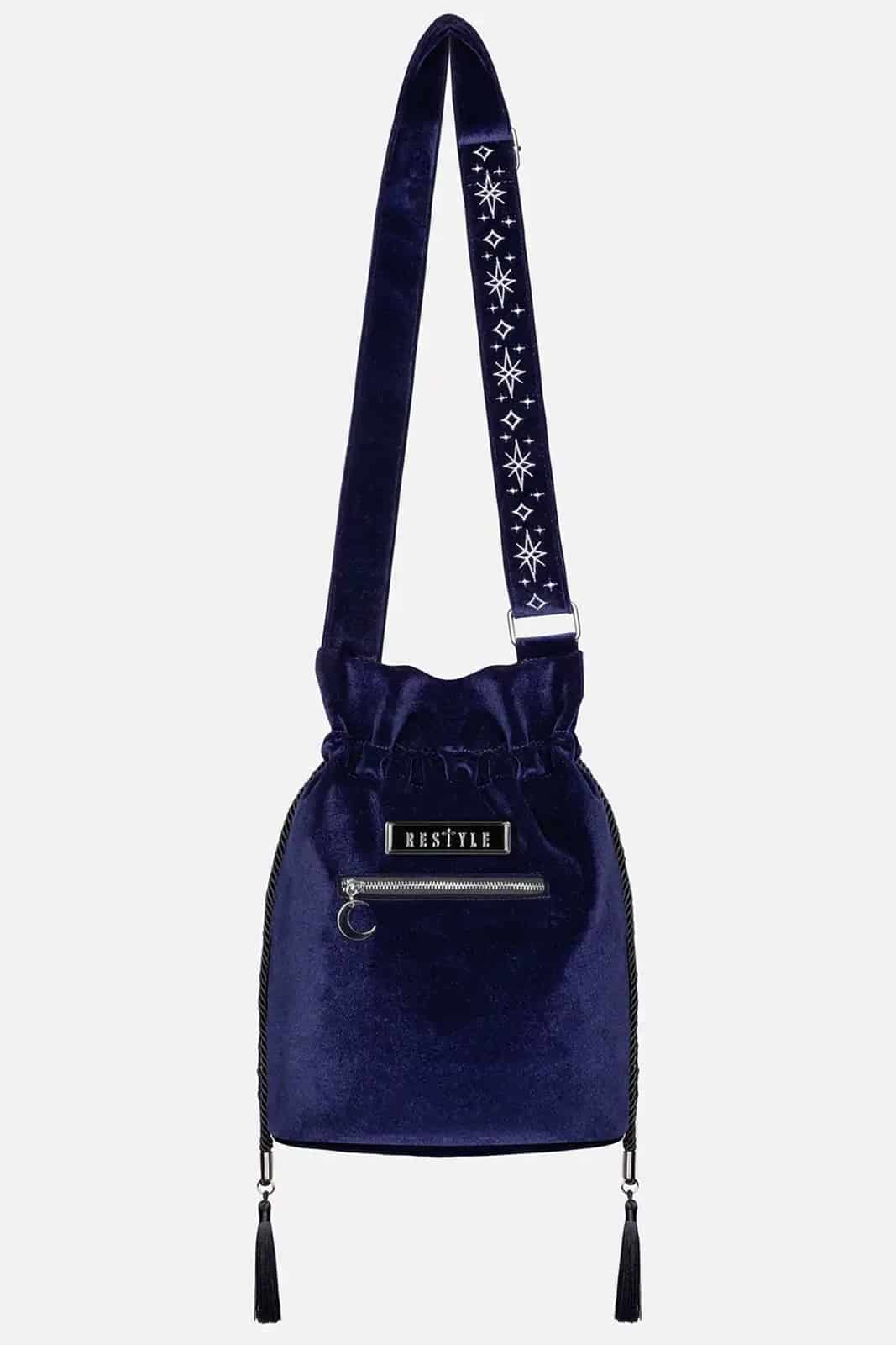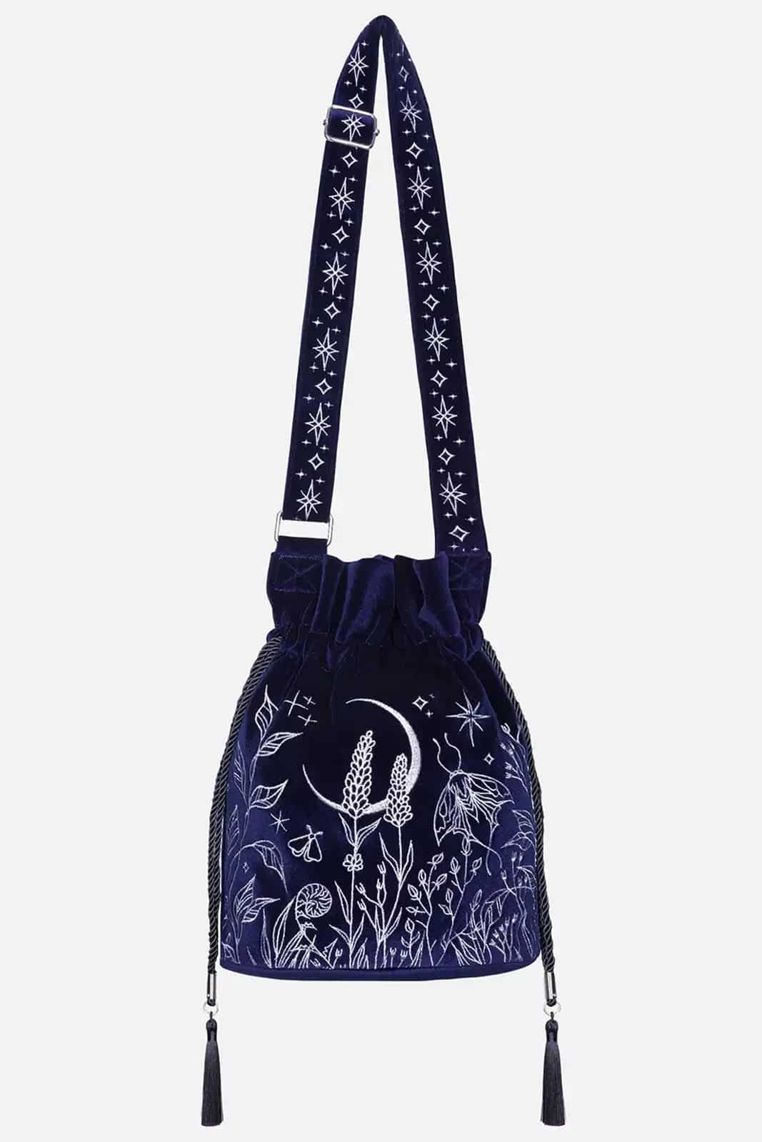Eine kleine Beuteltasche aus dunkelblauem Samt im Ton midnight blue, die durch ihre edle Farbwirkung und feine silberne Stickerei überzeugt. Das tiefe, samtige Blau bildet eine ruhige, luxuriöse Basis, während die detailreiche Stickarbeit dem Design Struktur und Tiefe verleiht. Die Tasche wirkt geheimnisvoll, elegant und leicht verspielt zugleich und passt perfekt zu Dark-Fantasy-, Gothic- oder Boho-inspirierten Looks – sowohl im Alltag als auch zu besonderen Anlässen.