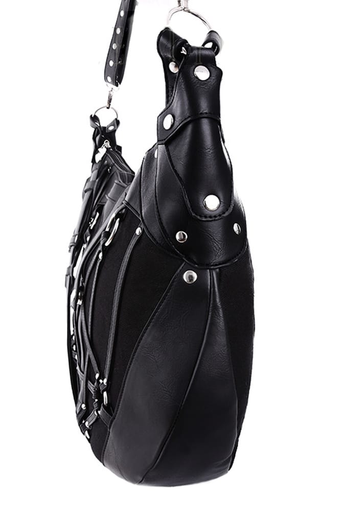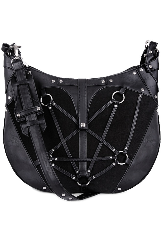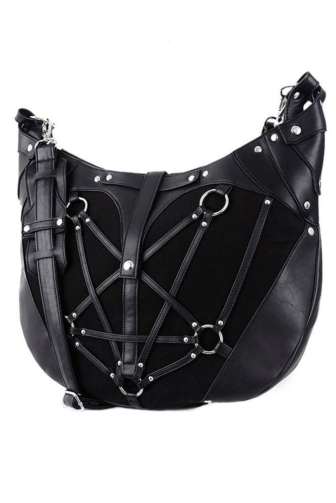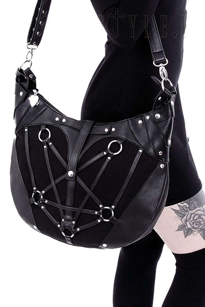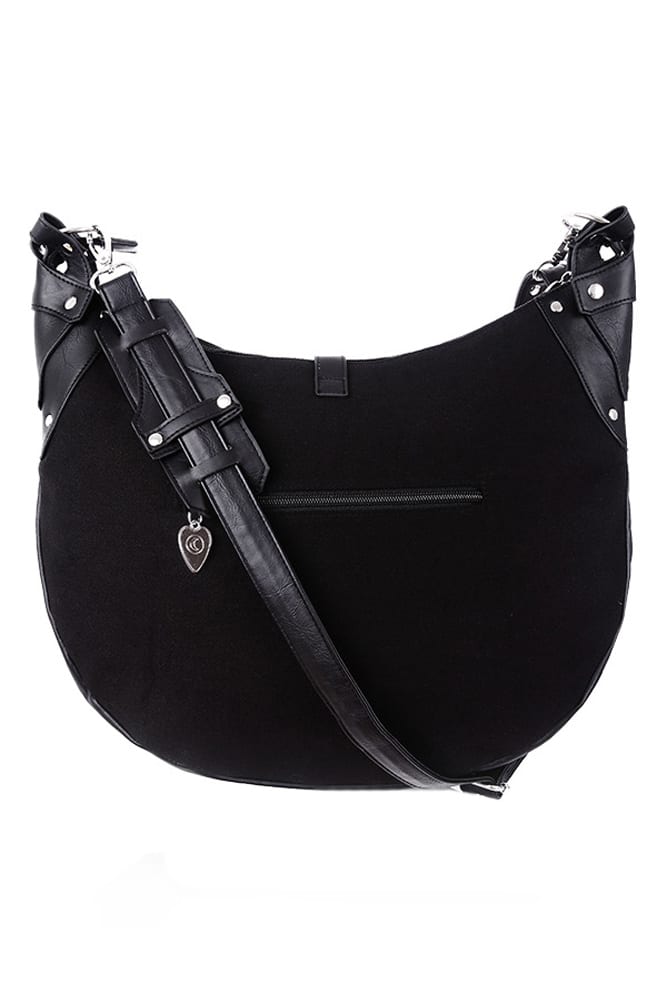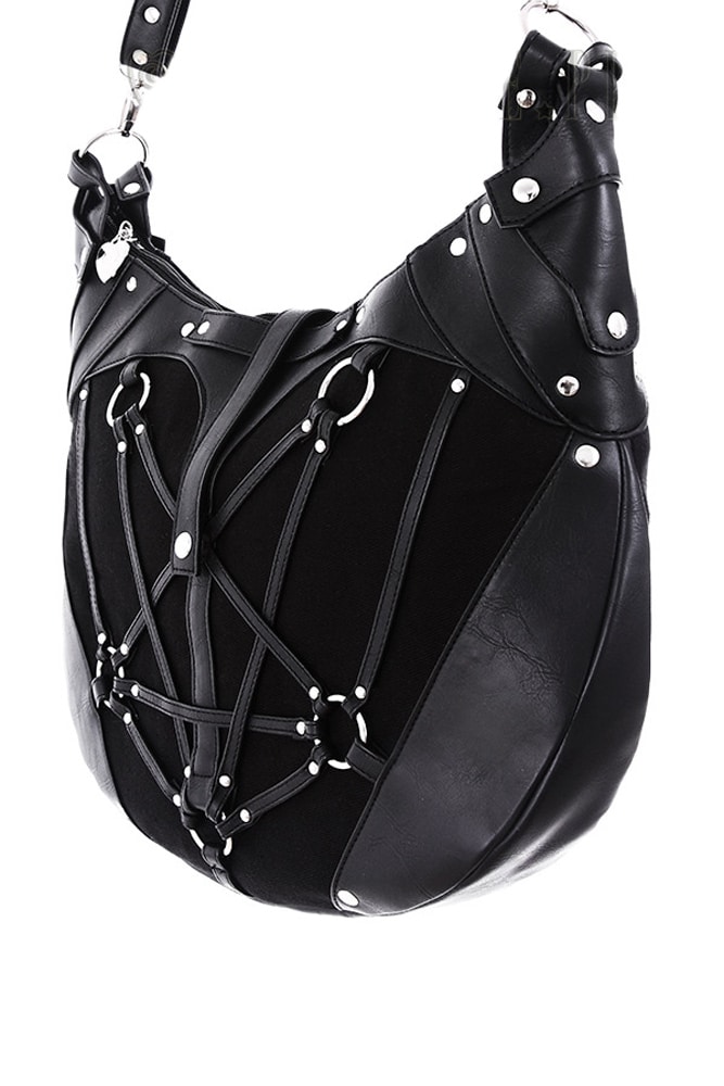 Große Tasche Gothic Hobo Style aus schwarzem Twill mit Kunstlederbesatz und Pentagramm-Detail. Verziert mit silberfarbenen Nieten und O-Ringen. Ausgestattet mit Reißverschluß und Magnet, abnehmbarem, verstellbarem Schultertrageriemen, einer Außen- und drei Innentaschen, teils mit Reißverschluß.