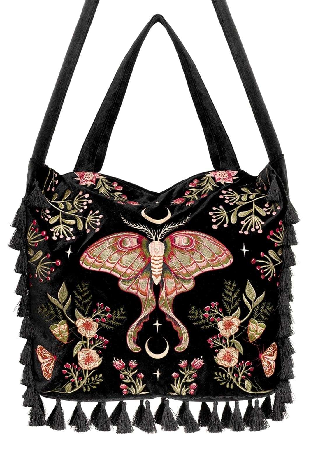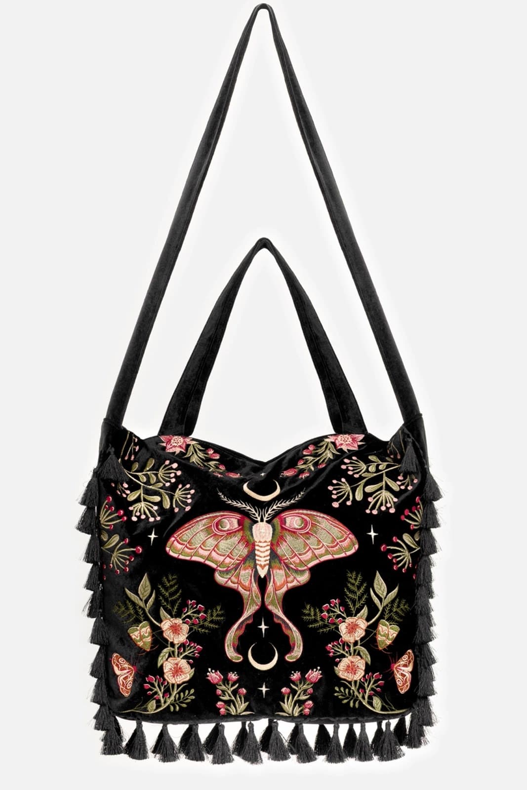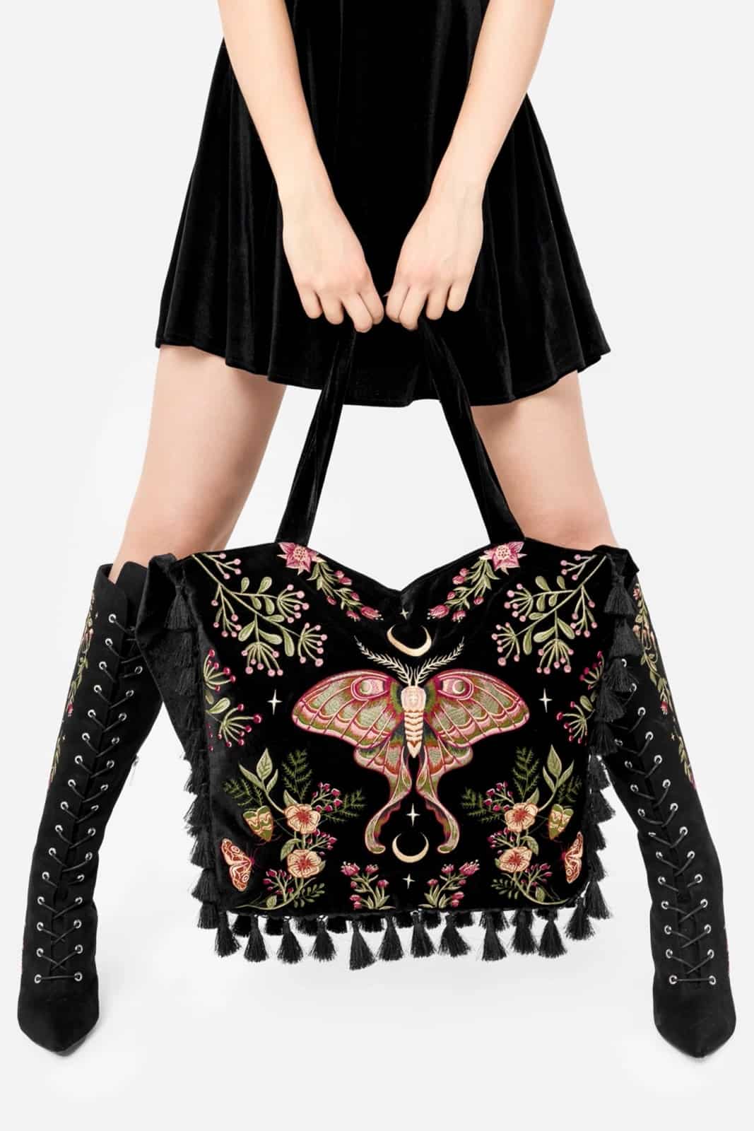 Edler Samt, üppige Motten- und Pflanzenstickereien und ein voluminöser Quastenbesatz verleihen ihr das Gefühl, aus einem Märchen entsprungen zu sein. Die Farben, die Details, die Handwerkskunst – jeder Zentimeter ist ein Hommage an Magie und Natur. Es ist nicht nur eine Tasche – es ist ein Meisterwerk!