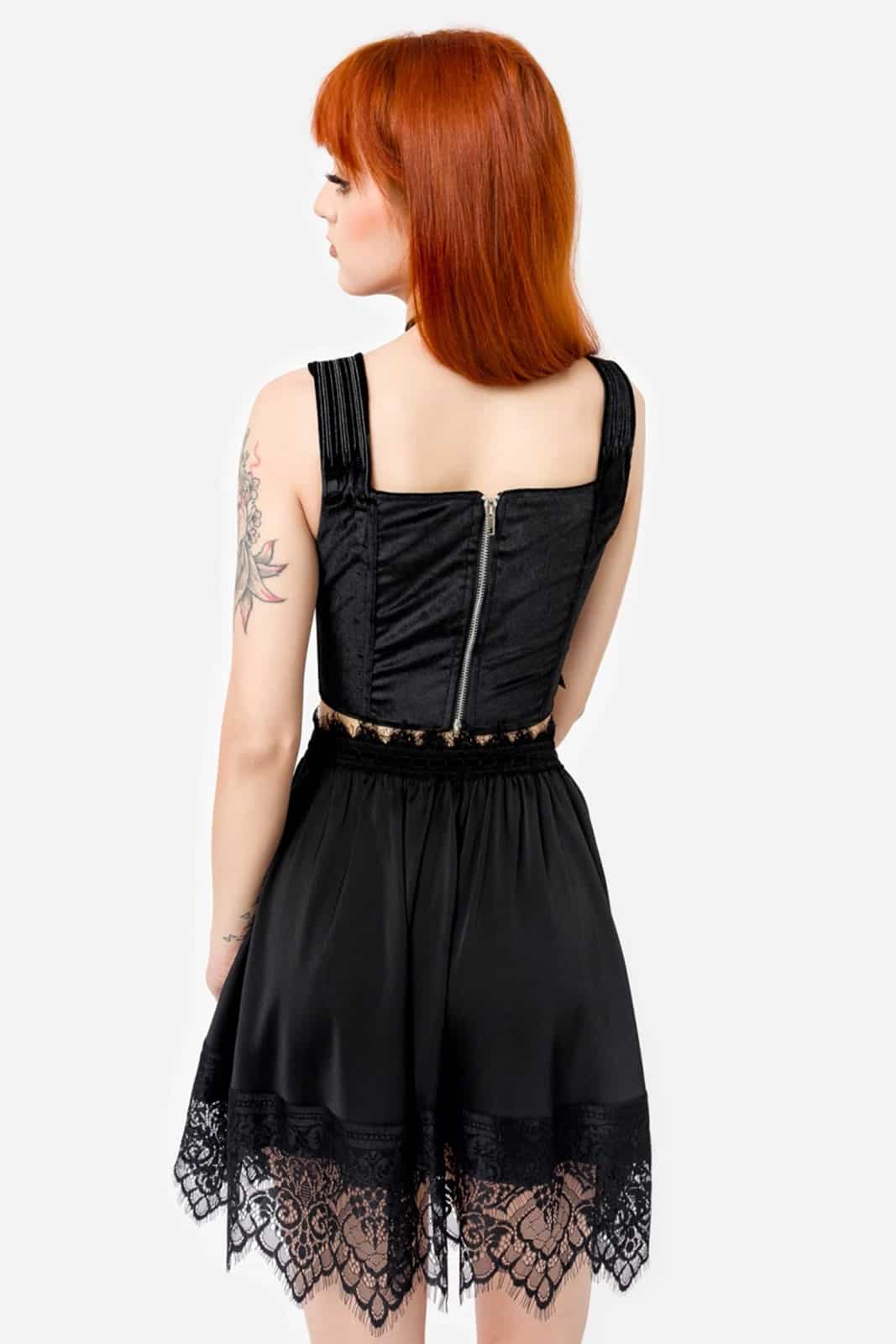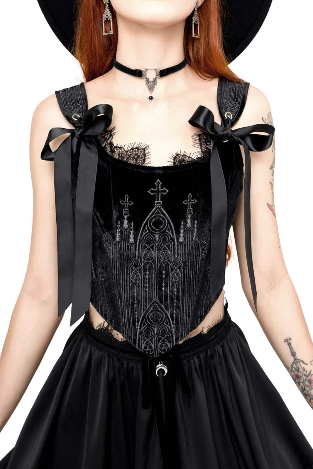 Das Top ist auf der Vorderseite und auf den Schulterträgern mit einer Gothic-Kathedralen-Stickerei mit metallischem Rotgussfaden verziert. Der Körper ist aus schwarzem, luxuriösem Samt mit metallischen Akzenten gefertigt. Die taillierte und verstärkte Struktur formt Deine Figur und stützt perfekt.