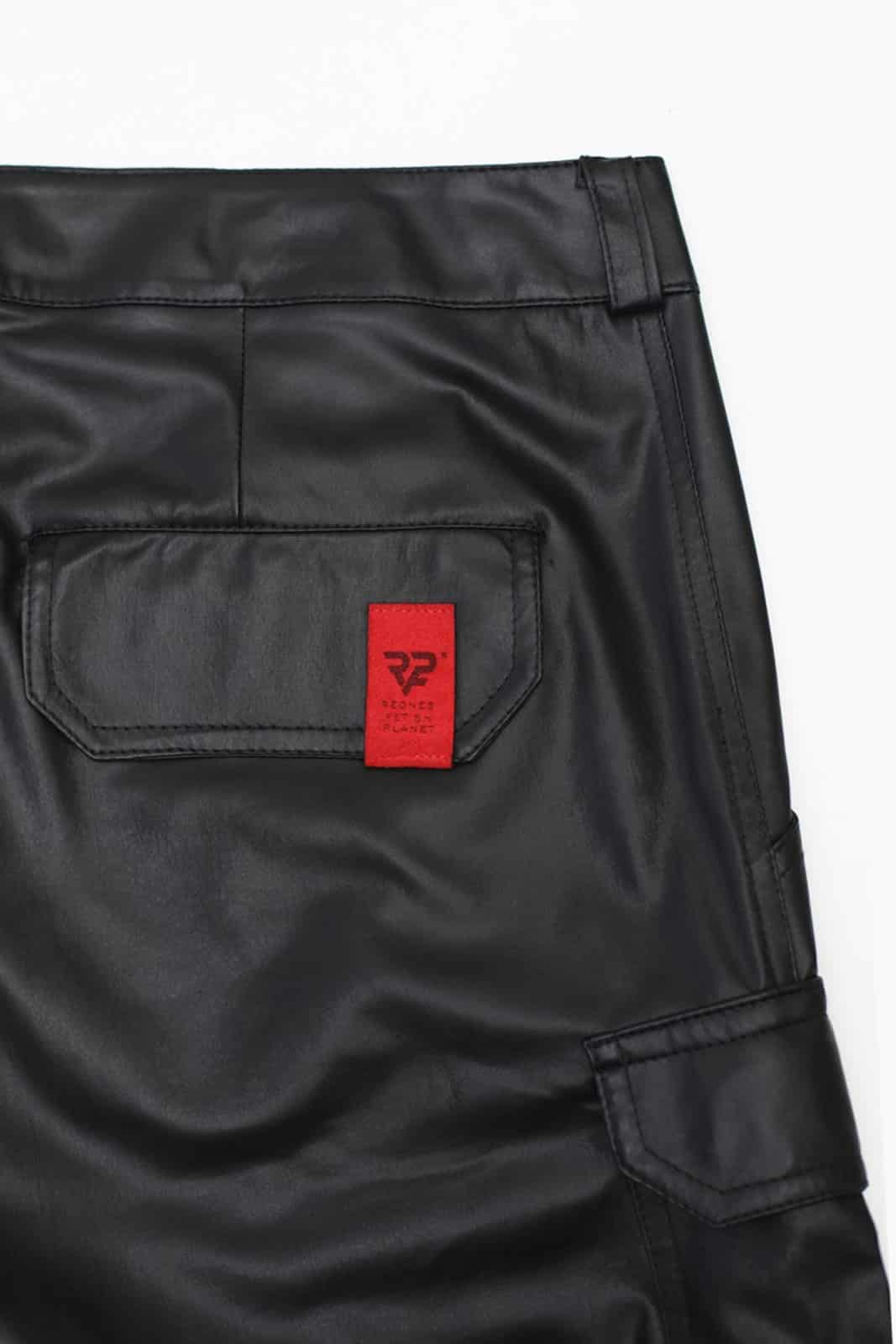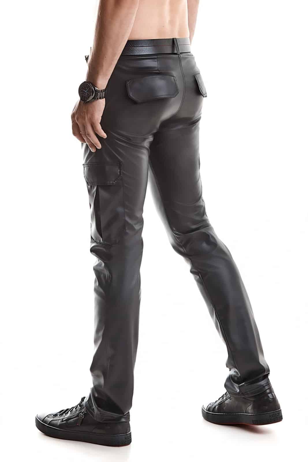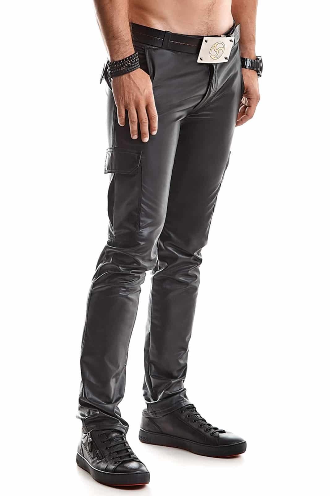 Beeindruckende Cargohose aus schwarzem, dehnbarem Wetlook-Stoff mit niedriger Leibhöhe.
