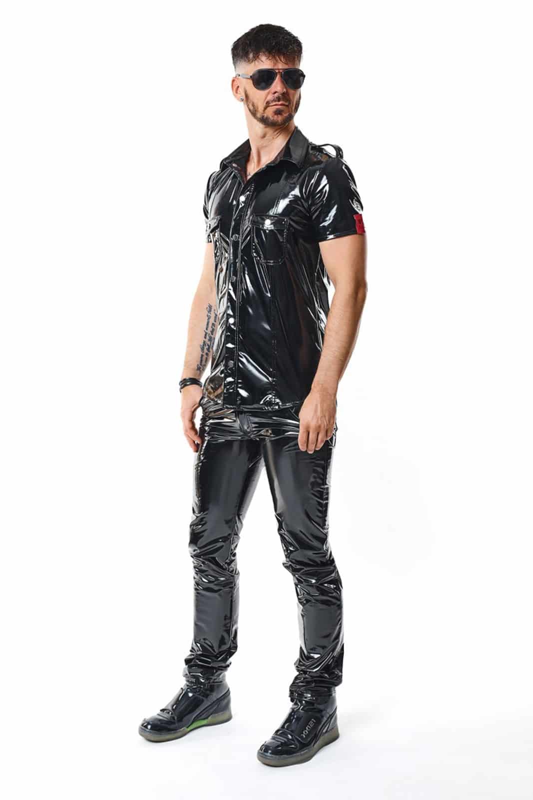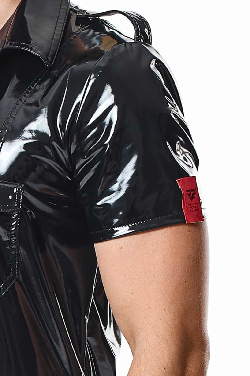 Aufmerksamkeit erregen auch die dekorativen Druckknöpfe aus Metall an den Taschen, Schulterklappen und an der gesamten Vorderseite. Komplett aus hochwertigem, schwarzem und elastischem PVC gefertigt.