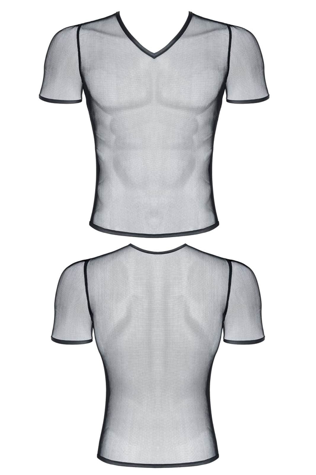 Transparentes T-Shirt aus elastischem und weichem Mesh-Gewebe mit V-Ausschnitt.