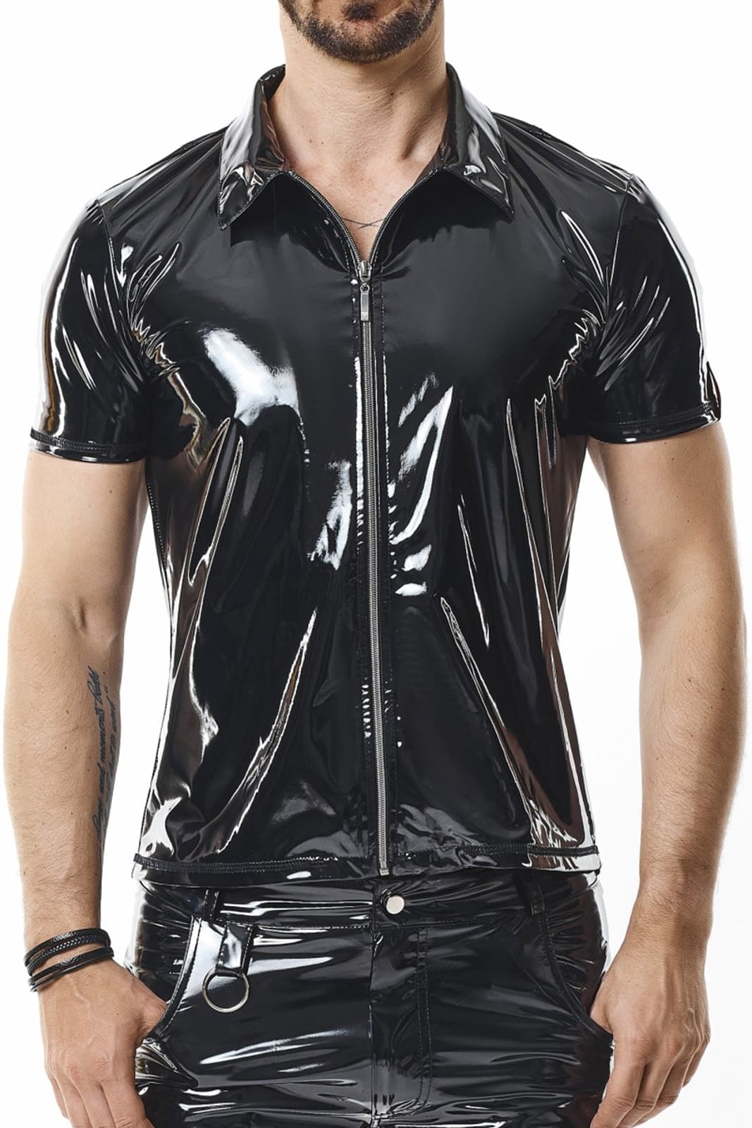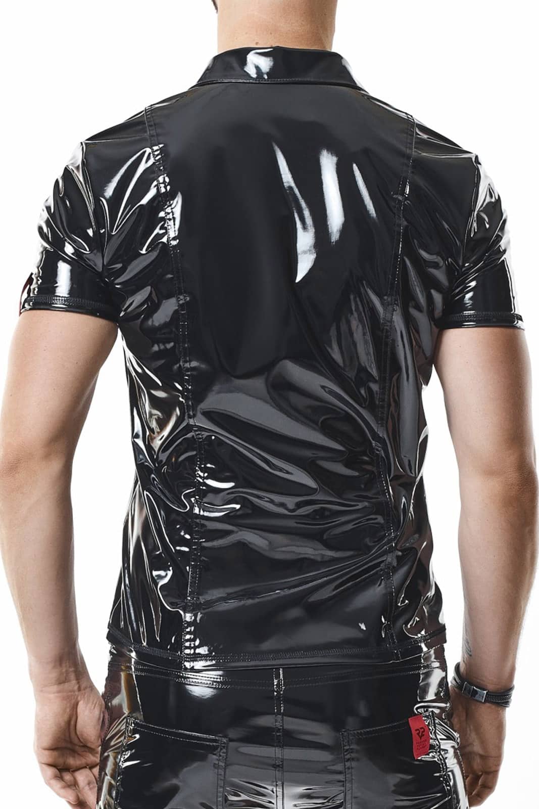 Poloshirt aus schwarzem, glänzendem PVC. Es verfügt über einen eleganten Kragen auf der Vorderseite und einen dunklen Reißverschluss, der individuellen Charakter verleiht, wobei das RFP Regnes Fetish Planet-Logo auf dem Reißverschluss eingraviert ist. Auf der Rückseite befinden sich zwei vertikale Nähte, die die Taille optisch verschlanken und die Schulter- und Brustlinie verbreitern, wodurch eine muskulösere Silhouette entsteht.