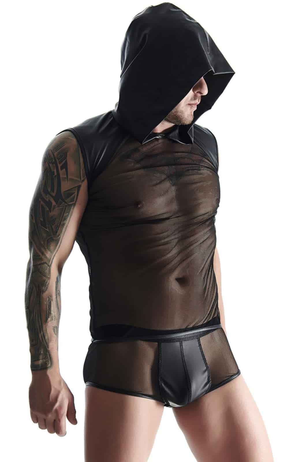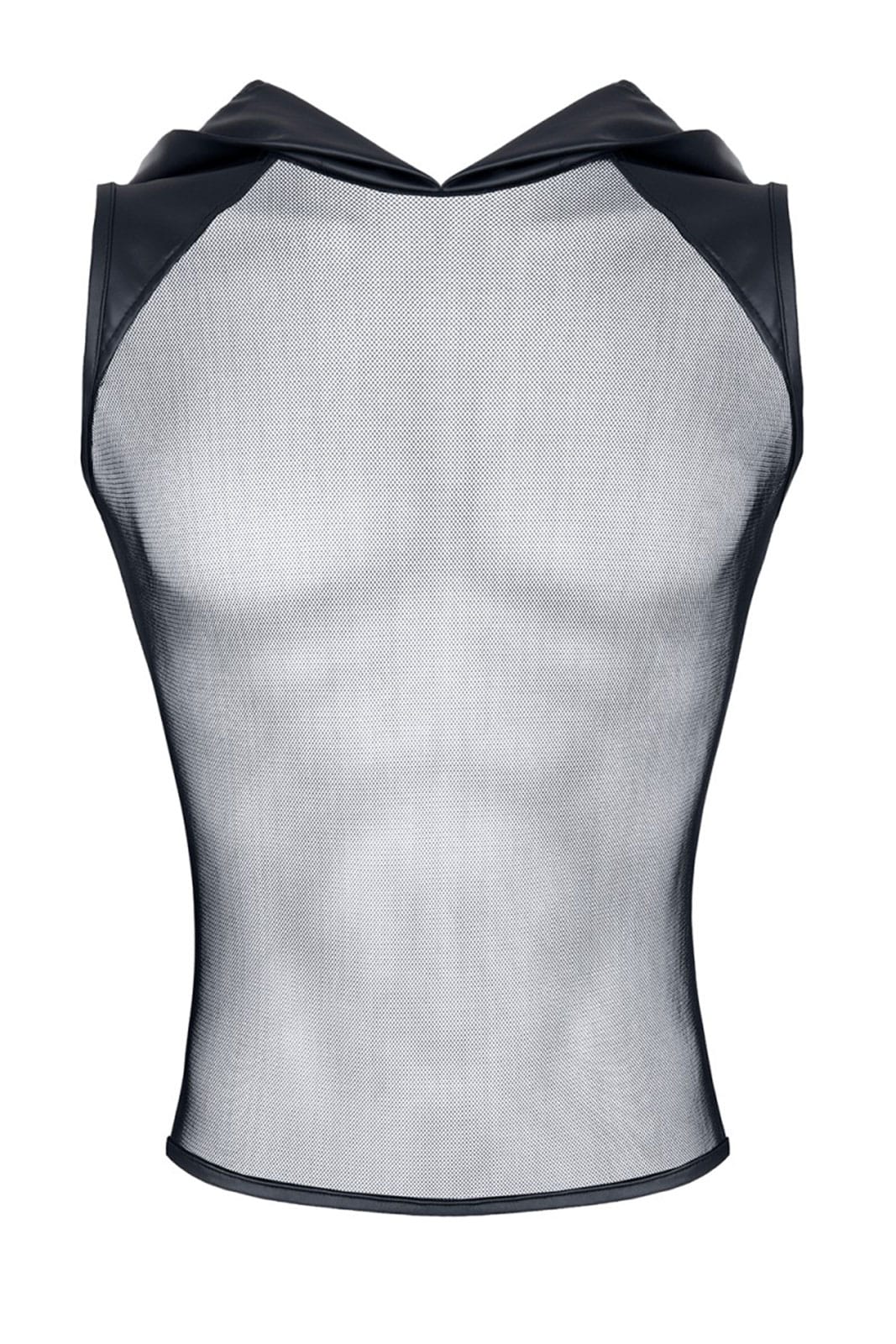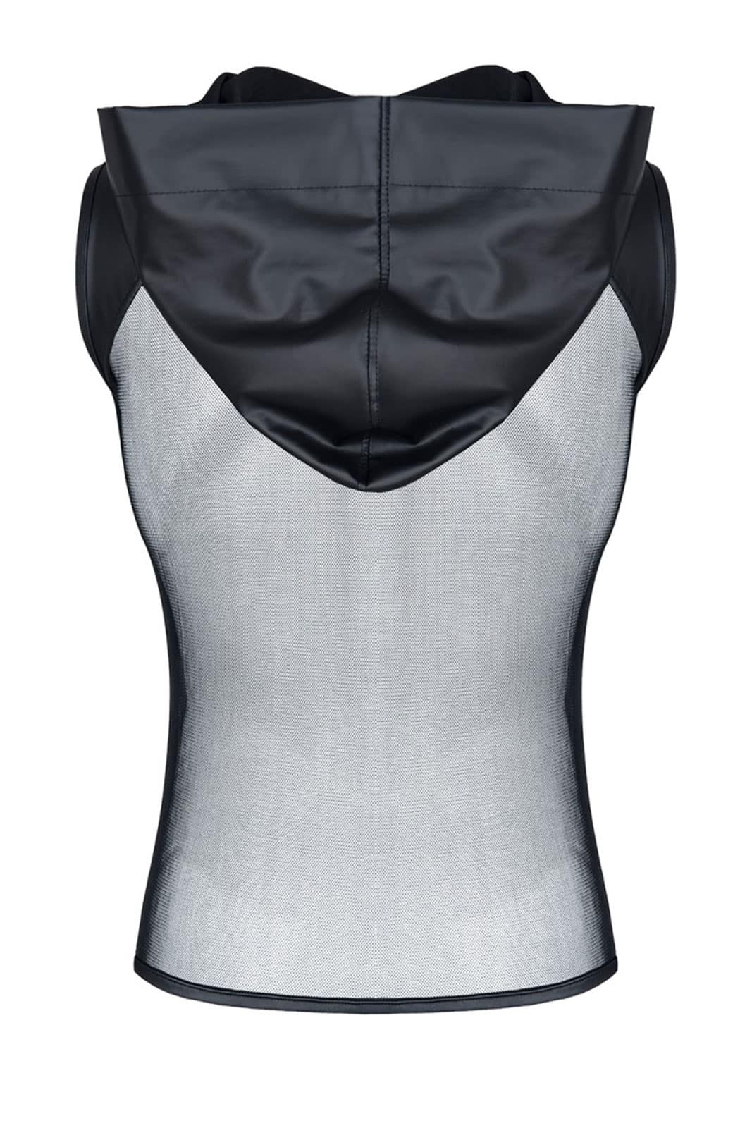 Ärmelloses T-Shirt aus elastischem und weichem Mesh-Gewebe mit breiter Kapuze. Die Schultern und die Kapuze sind aus Öko-Kunstleder mit verstärkten Nähten hergestellt.